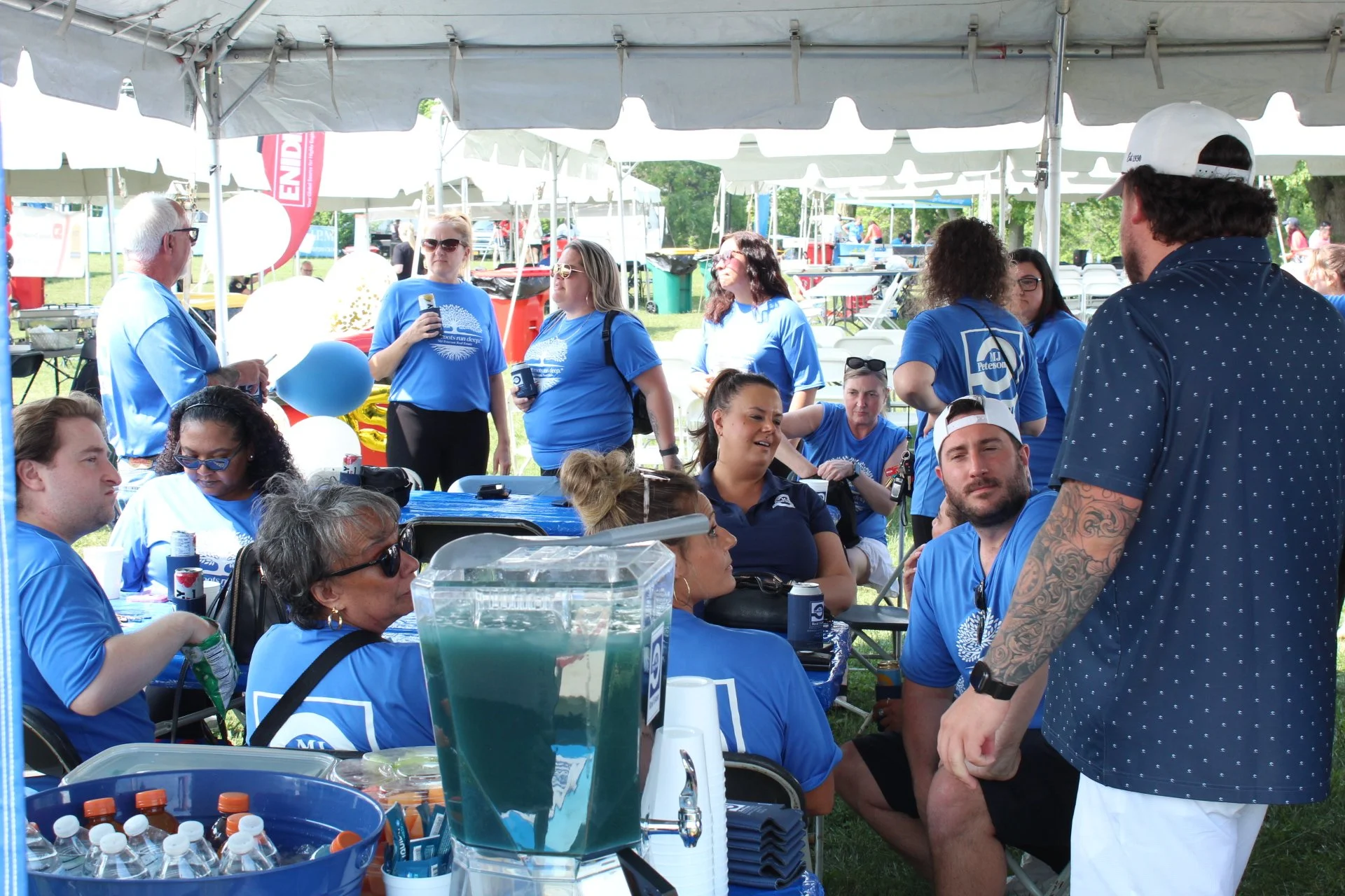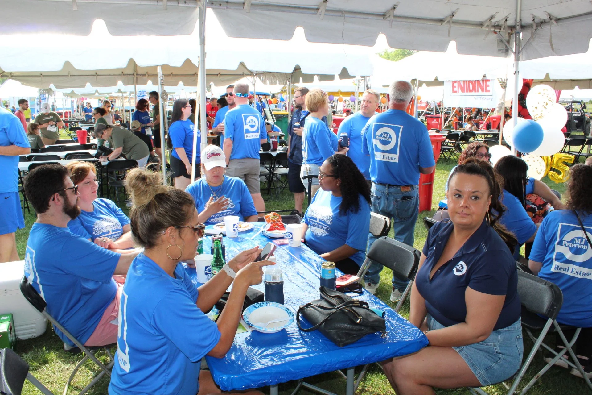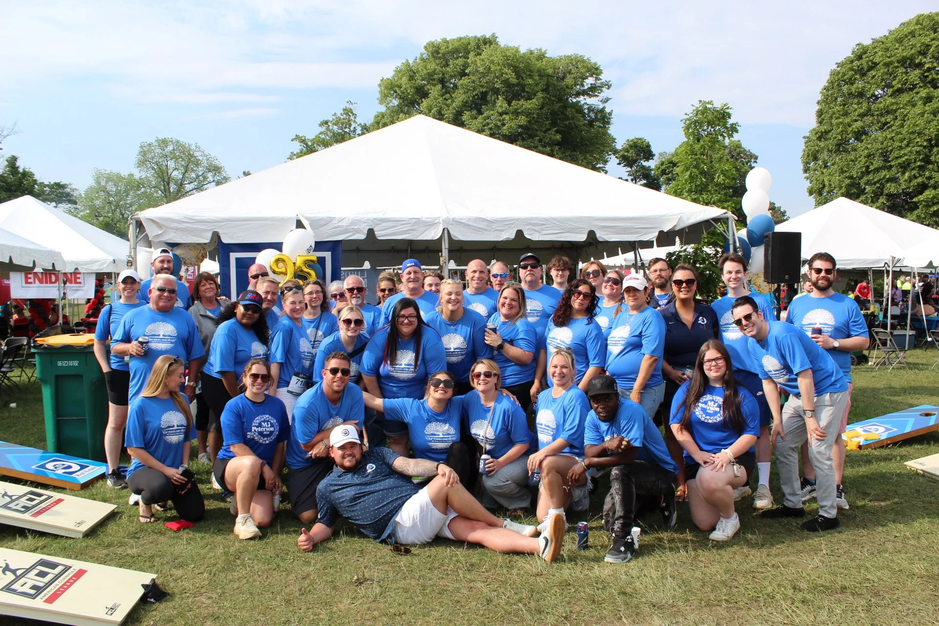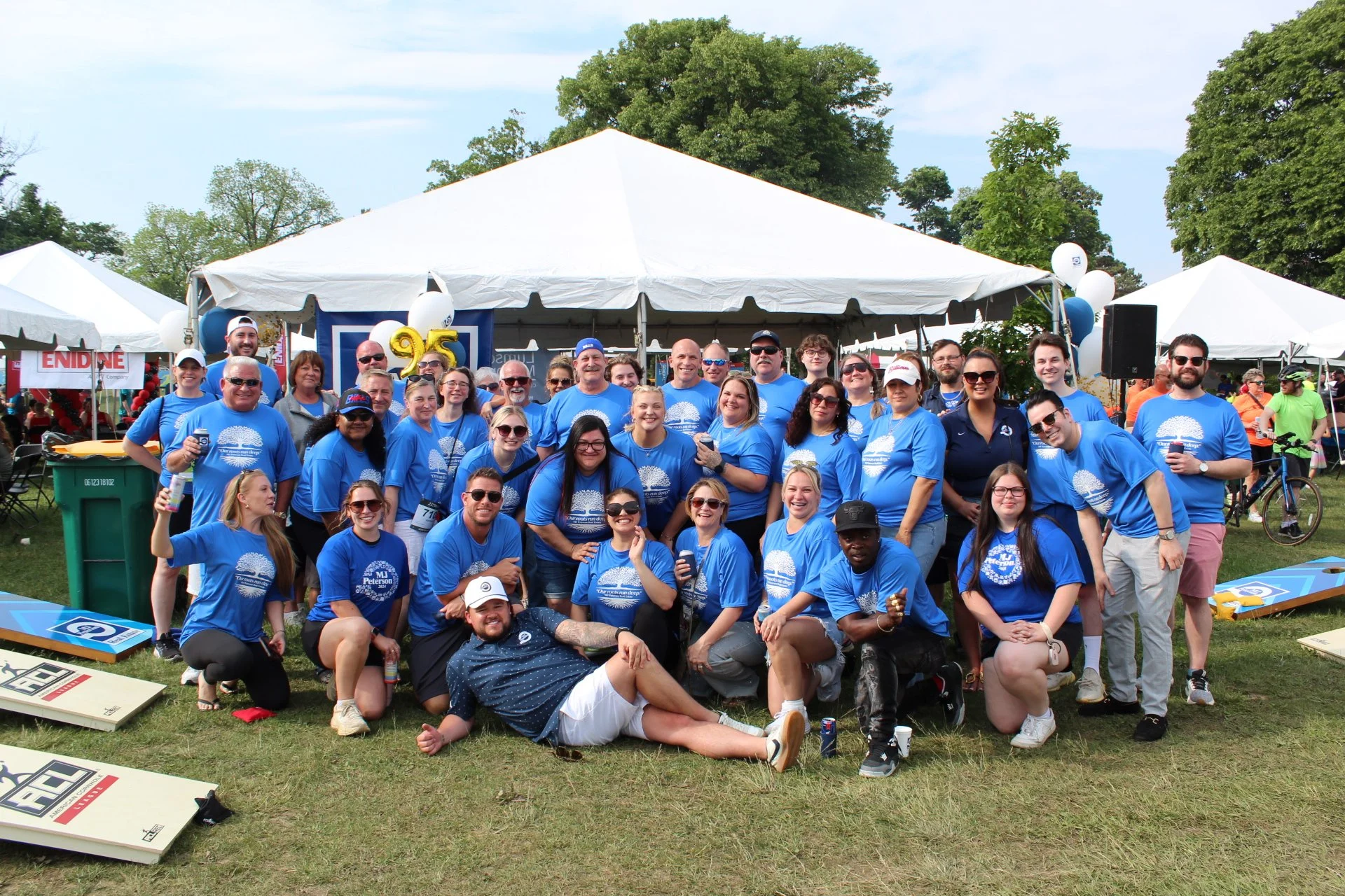 Group photo at the 2025 Corporate Challenge event, featuring people in blue shirts in front of tents and trees.