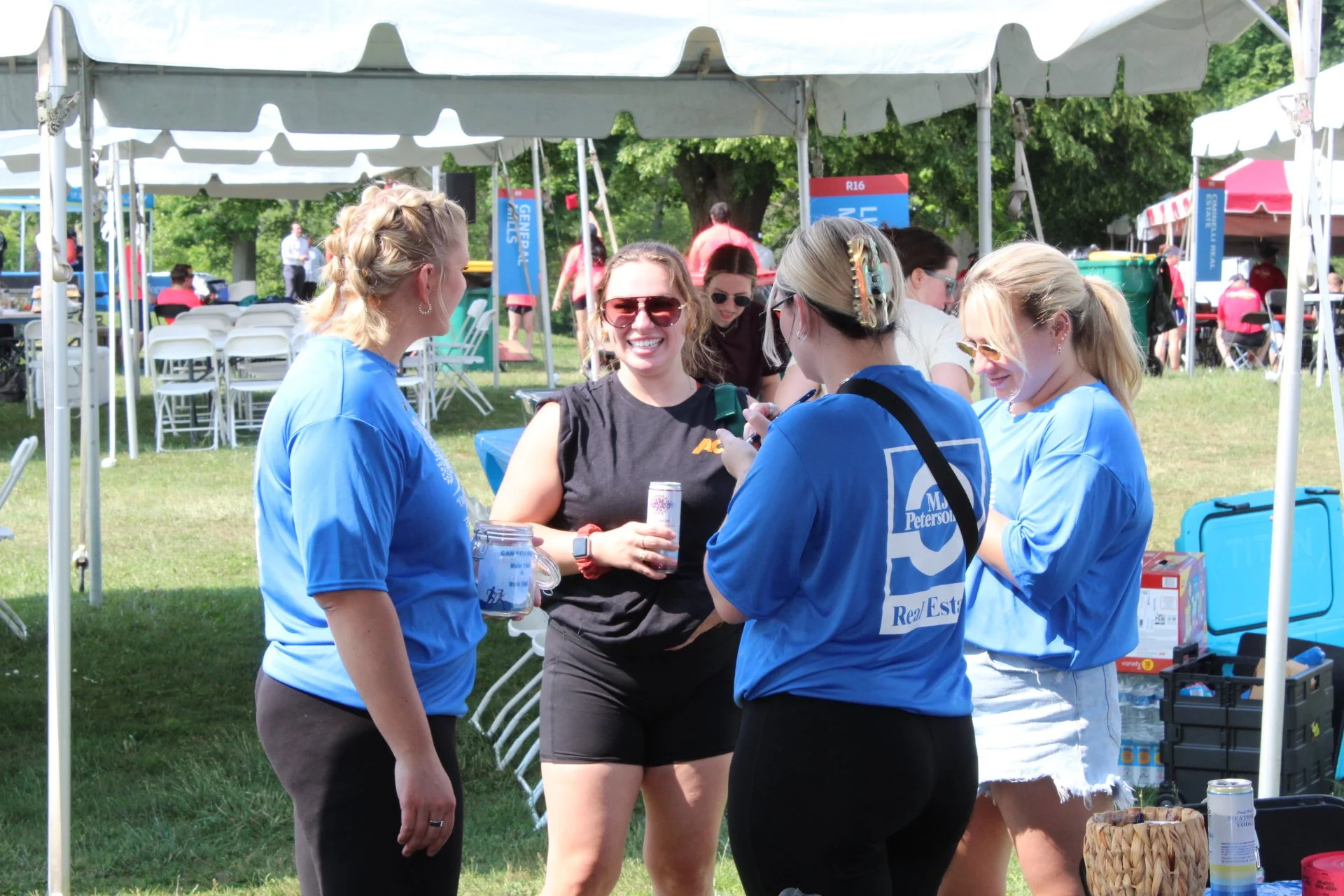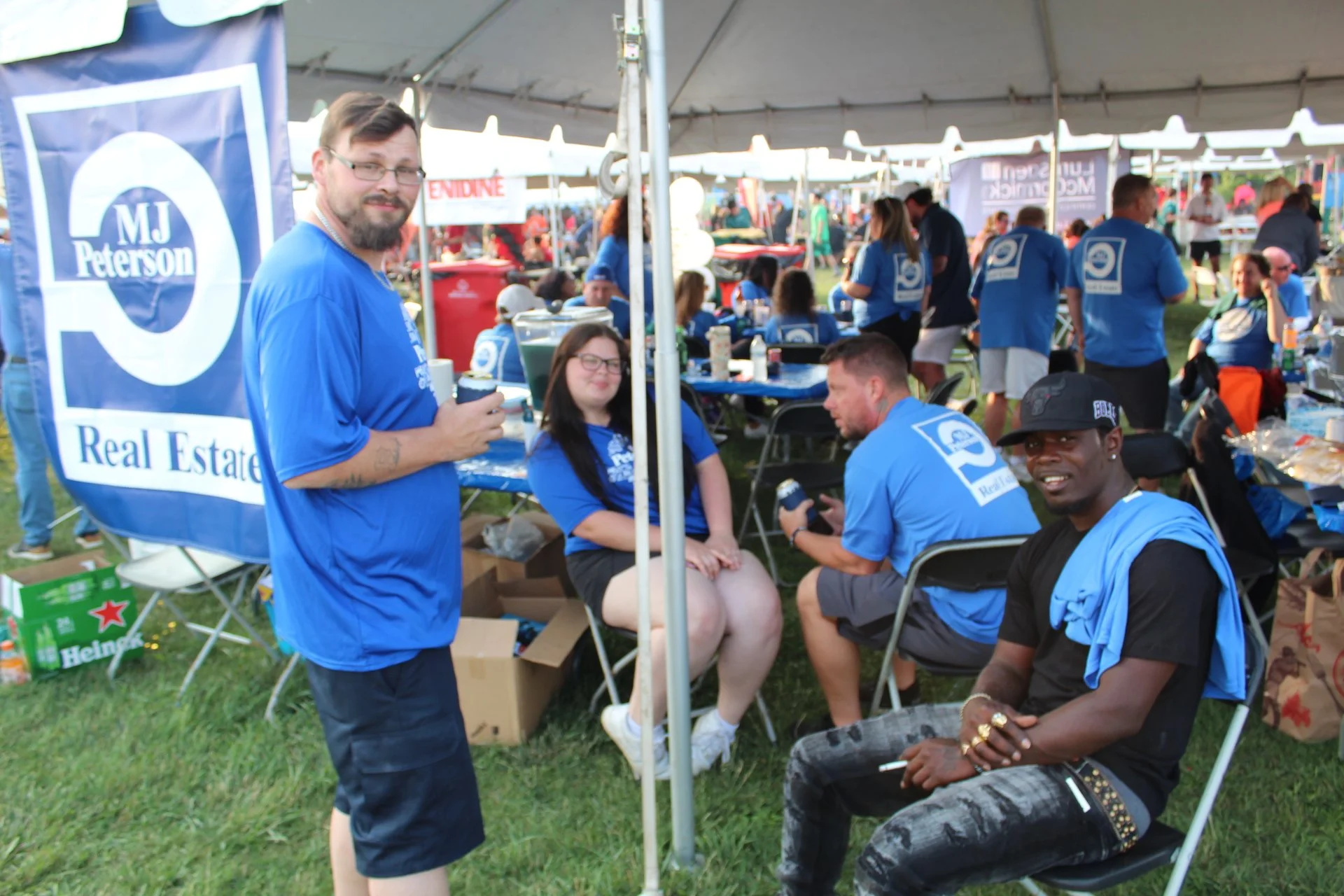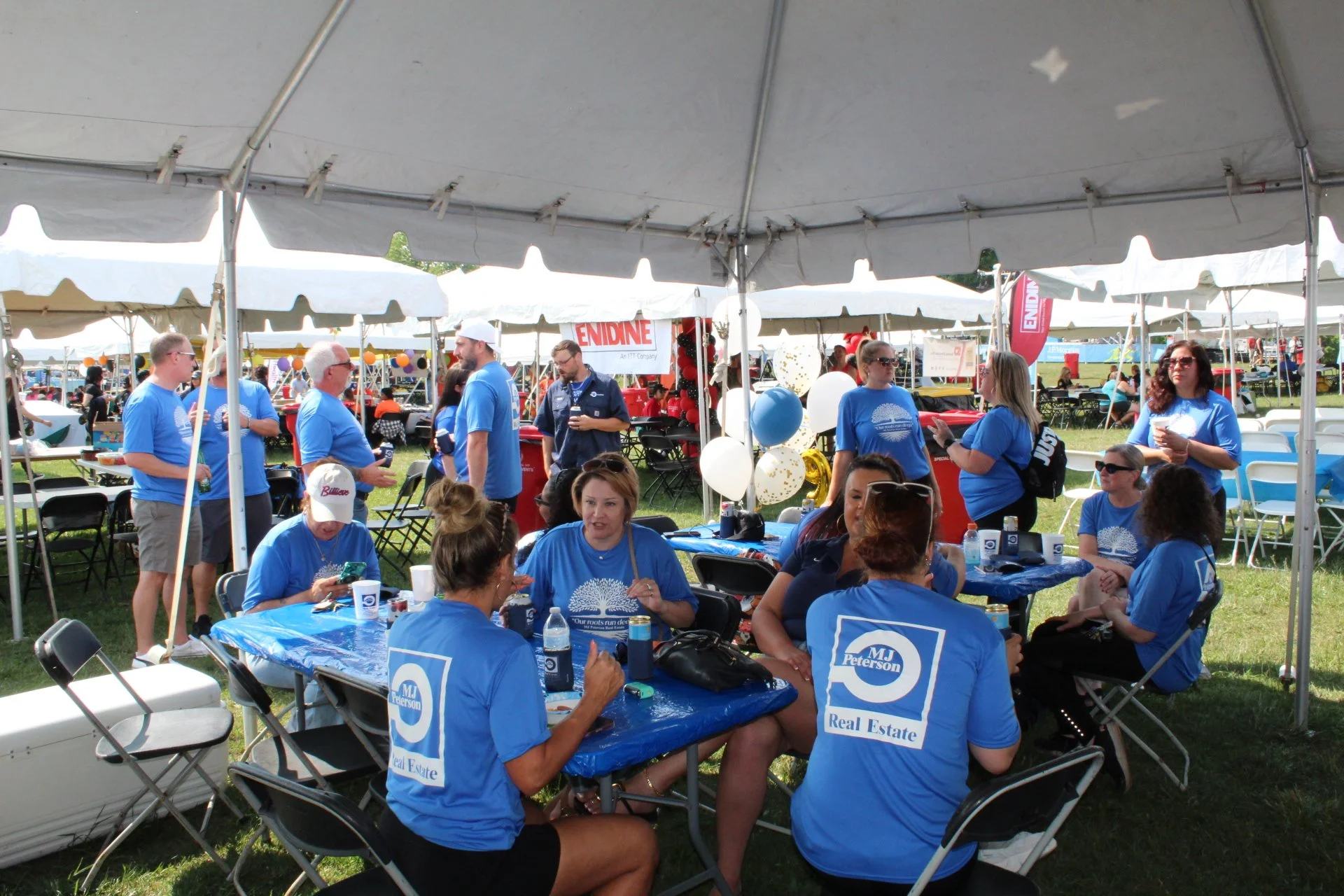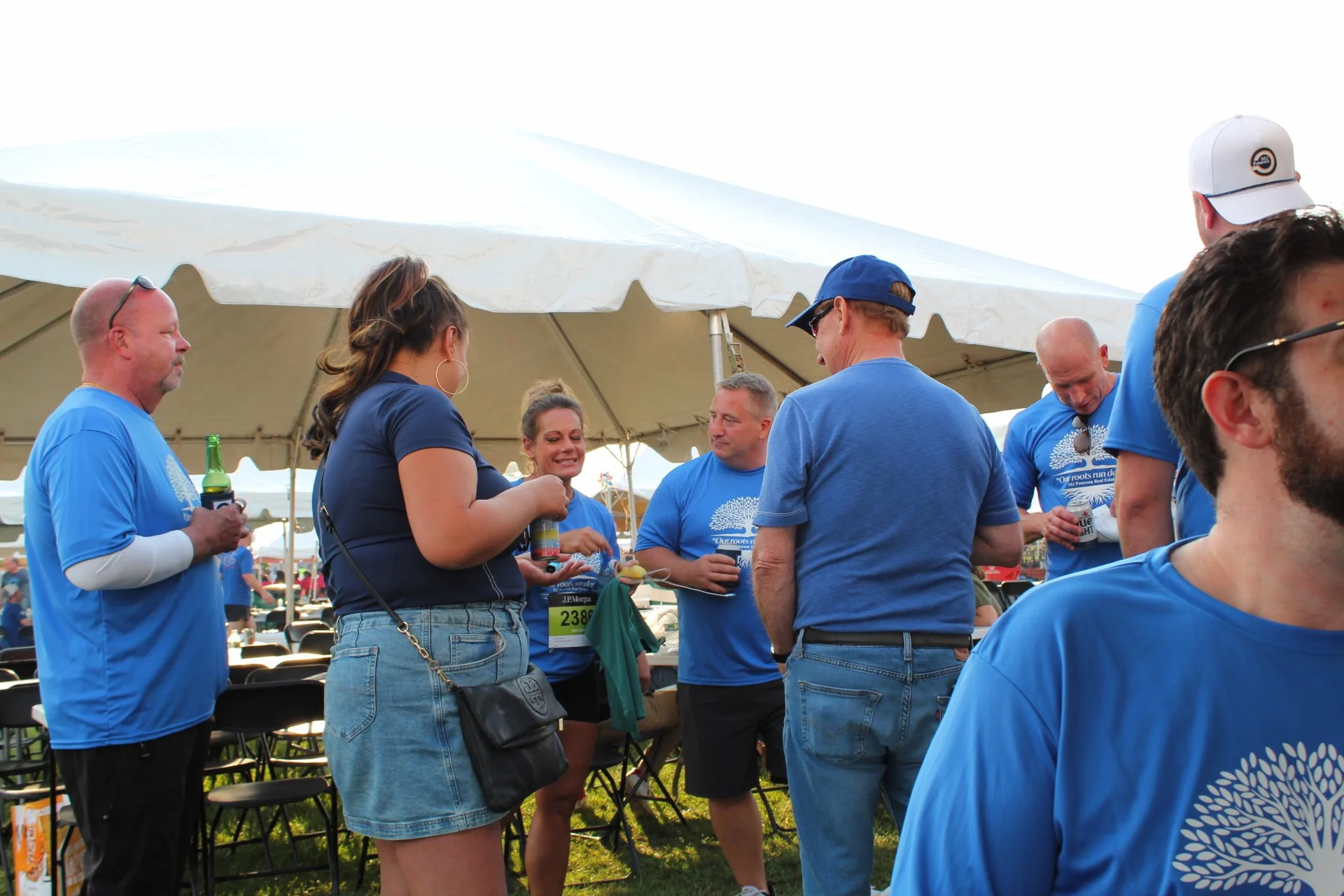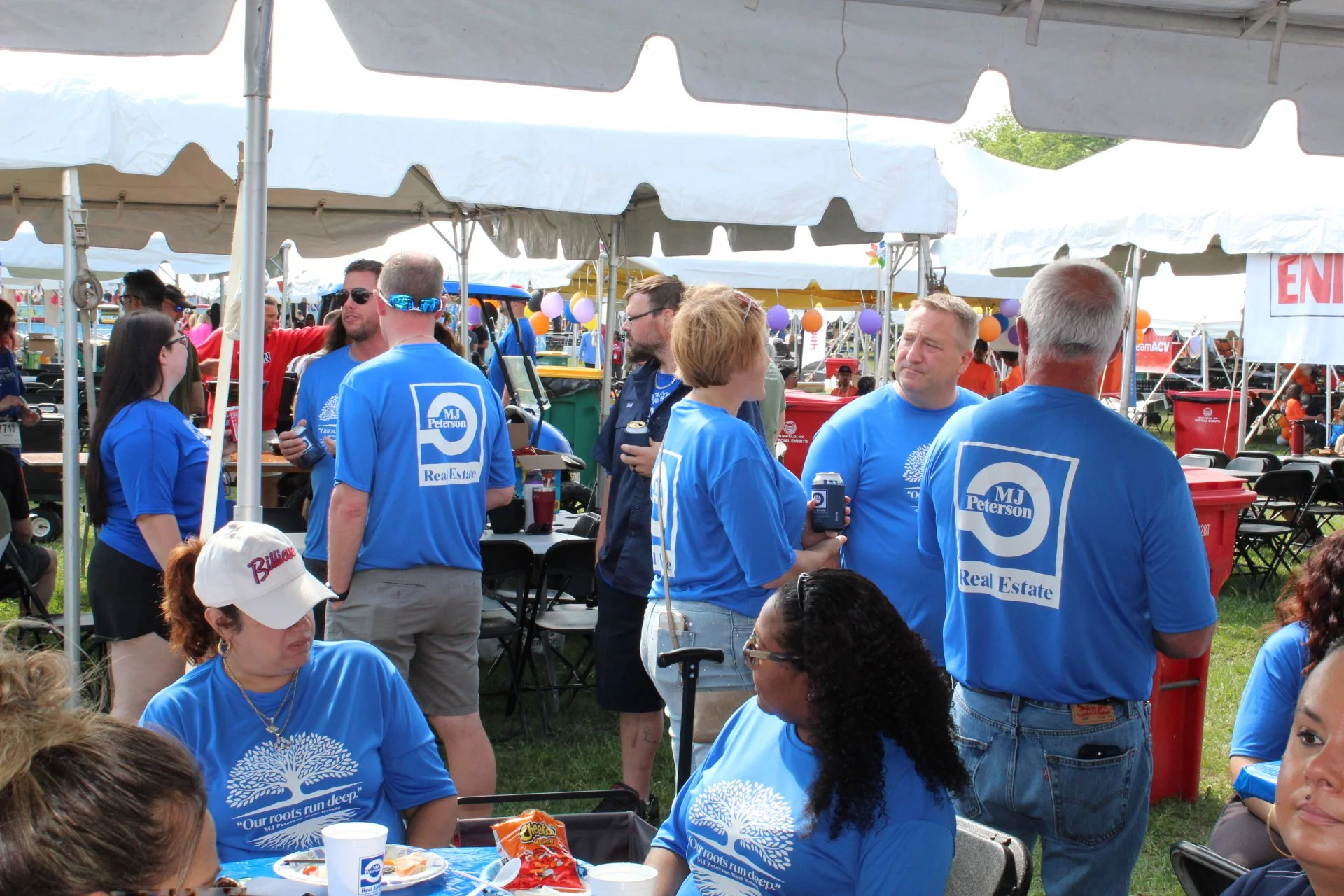 Group photo at the 2025 Corporate Challenge event, featuring people in blue shirts in front of tents and trees.
