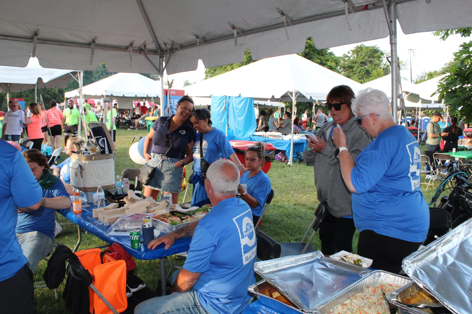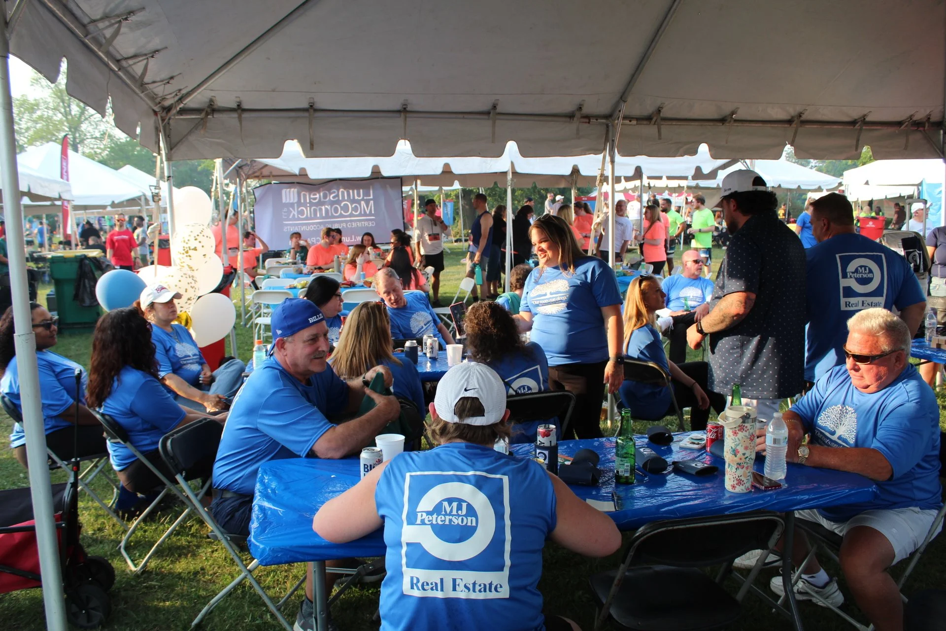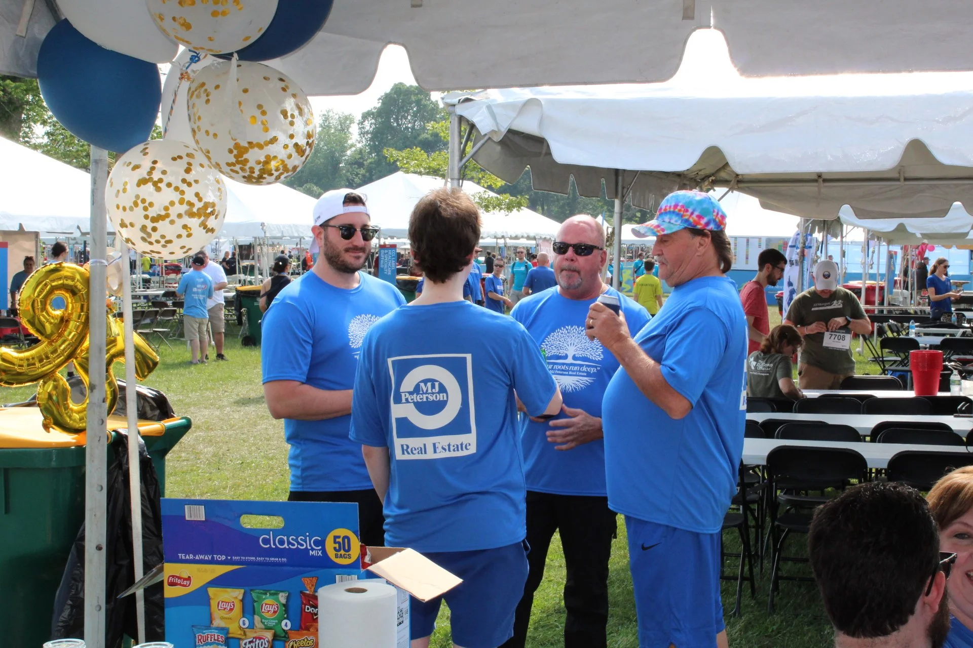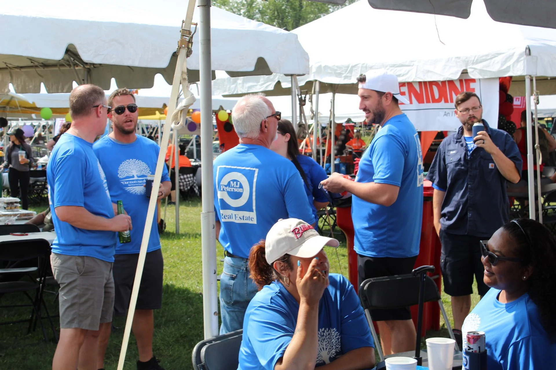 Group photo at the 2025 Corporate Challenge event, featuring people in blue shirts in front of tents and trees.