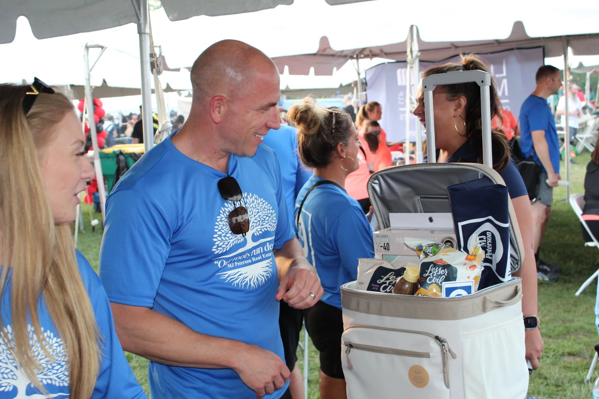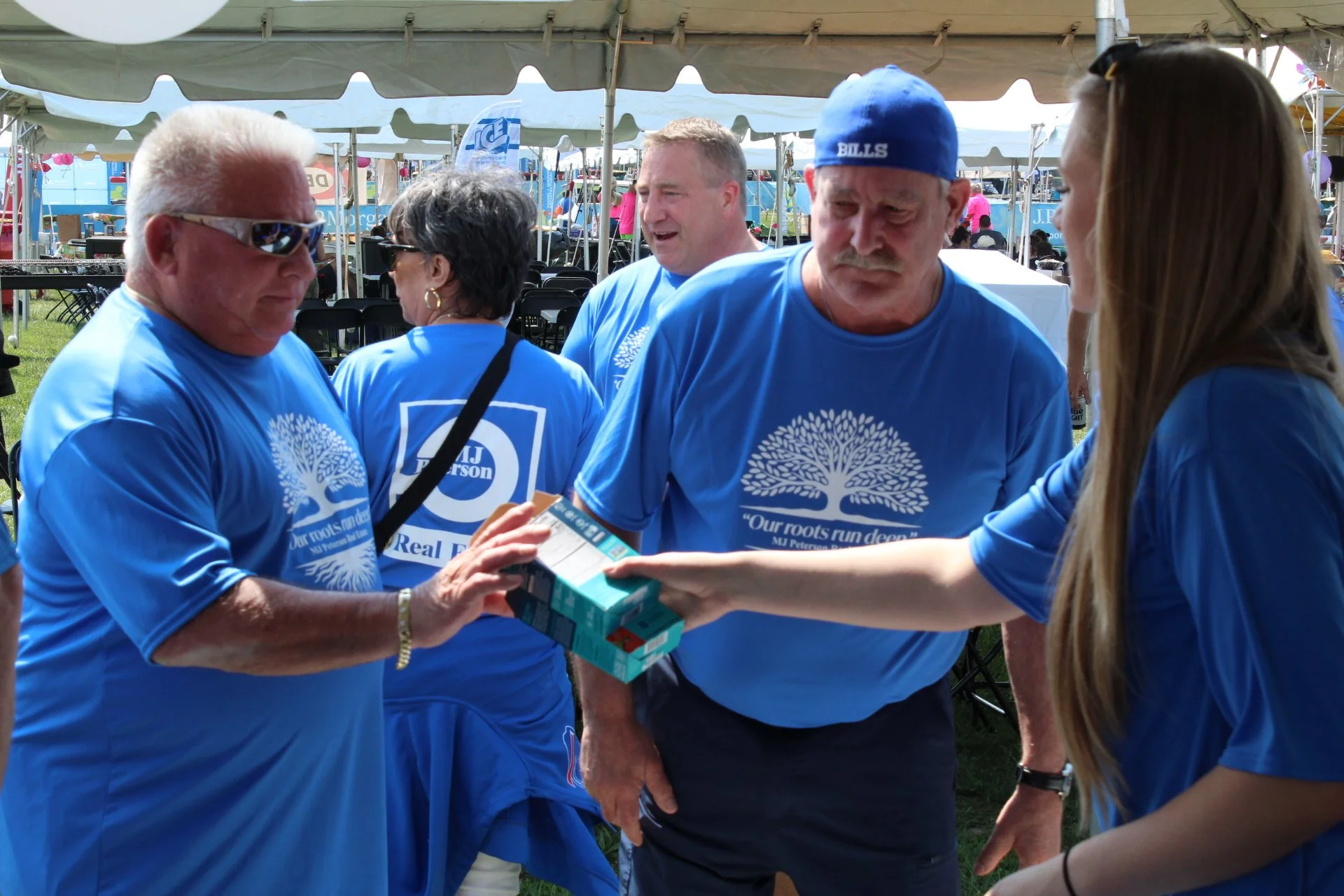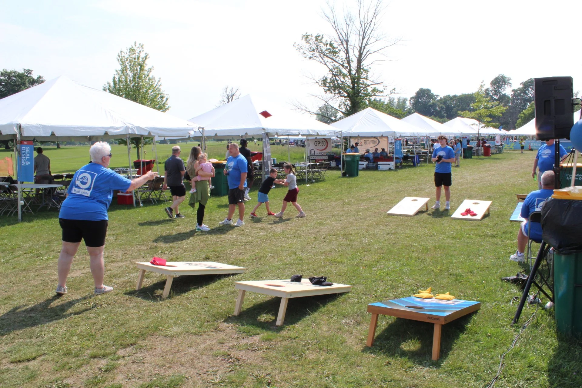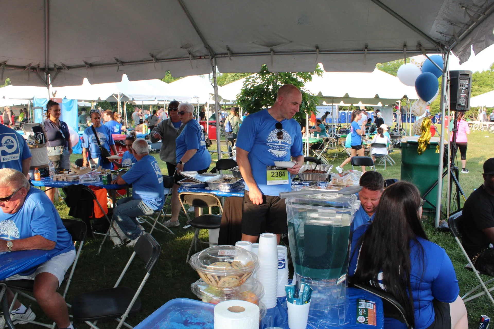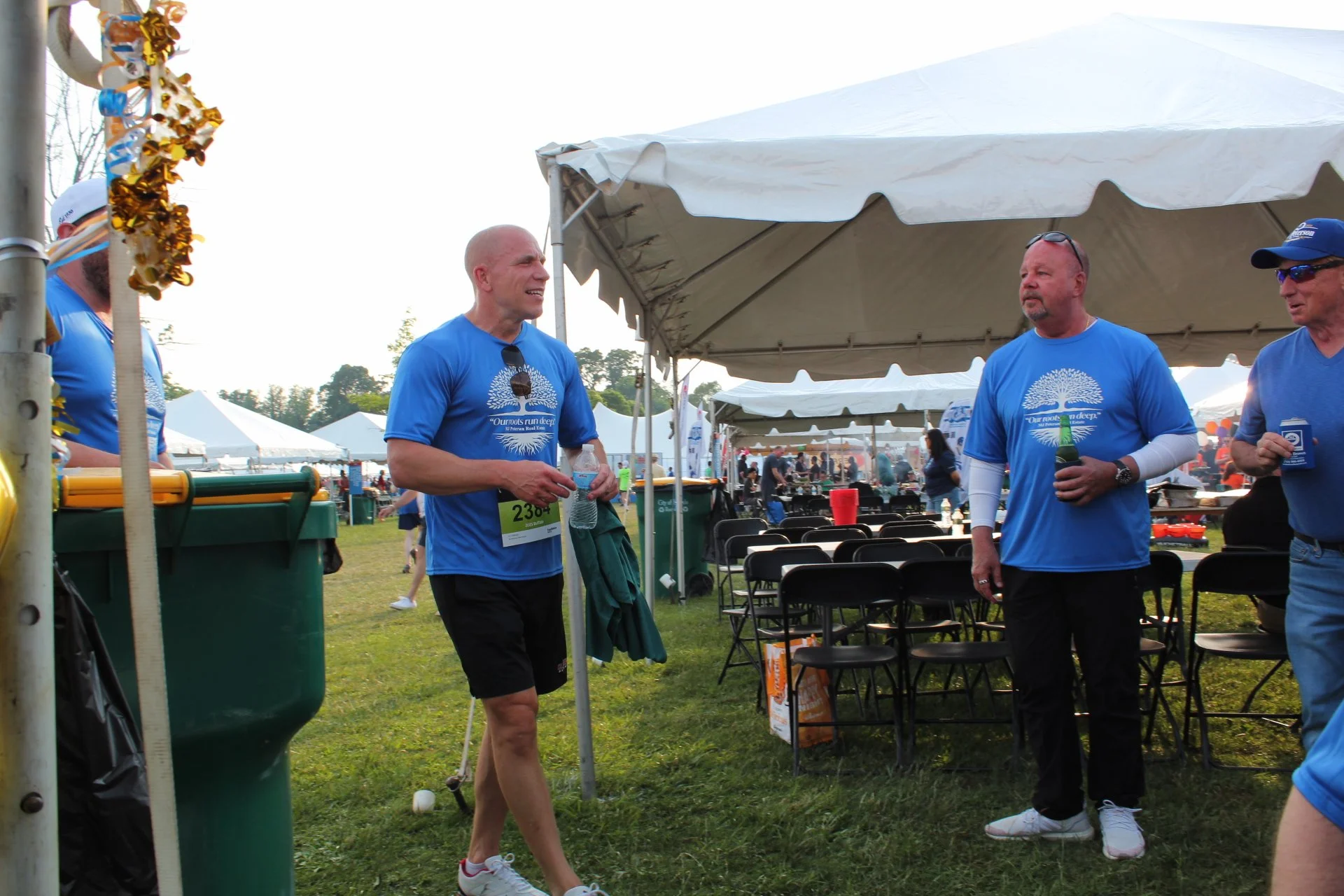 Group photo at the 2025 Corporate Challenge event, featuring people in blue shirts in front of tents and trees.