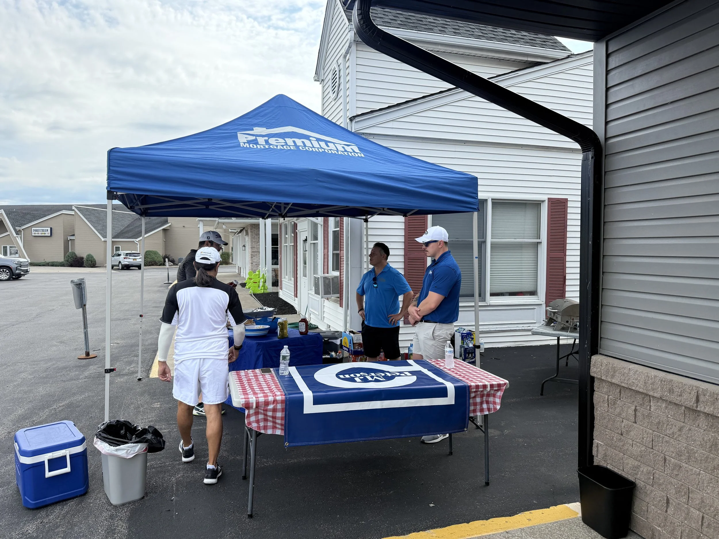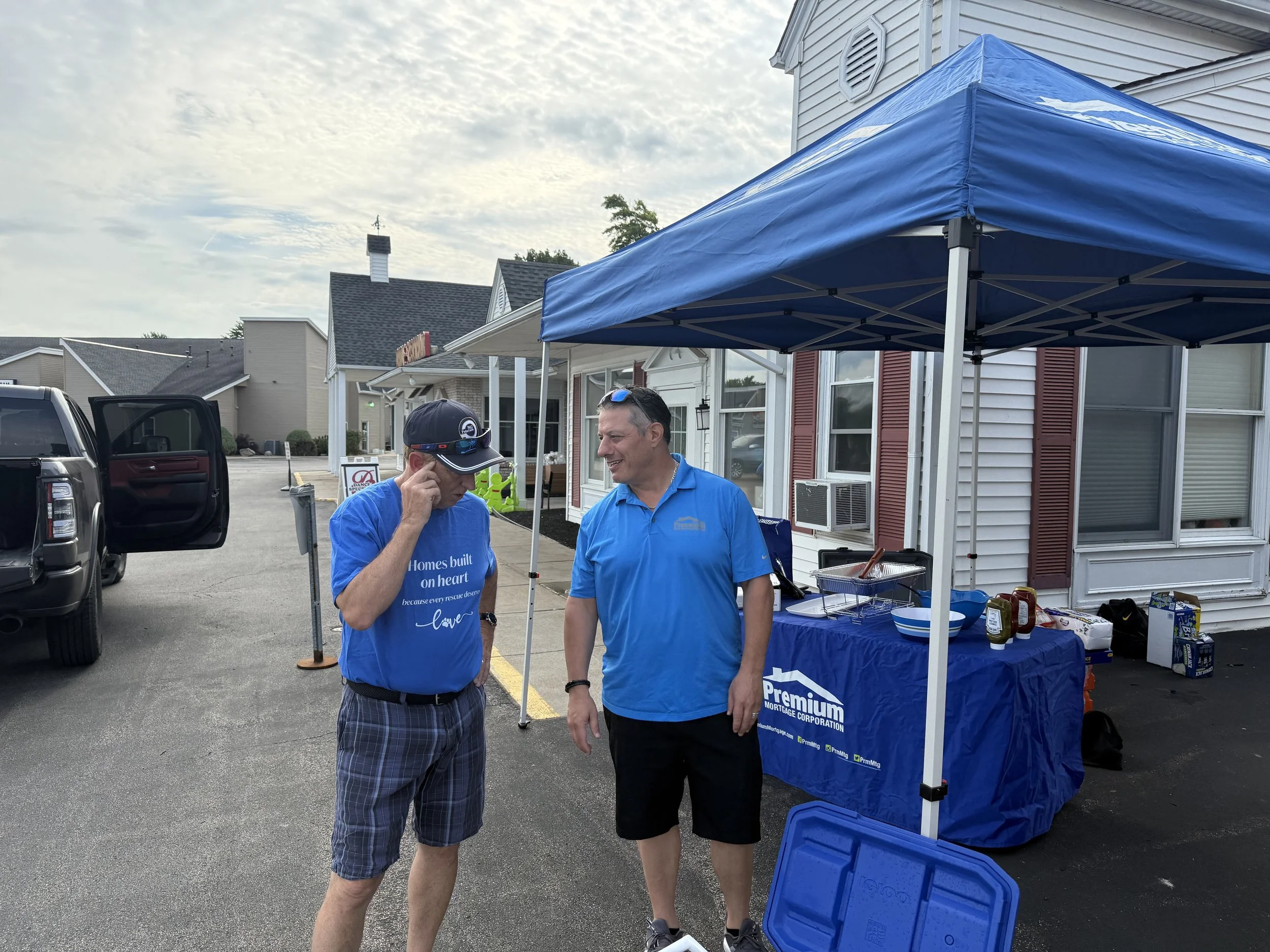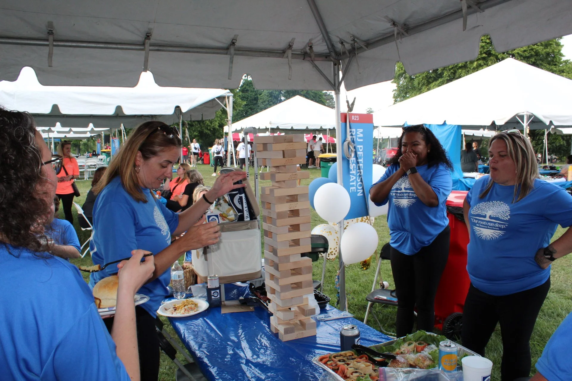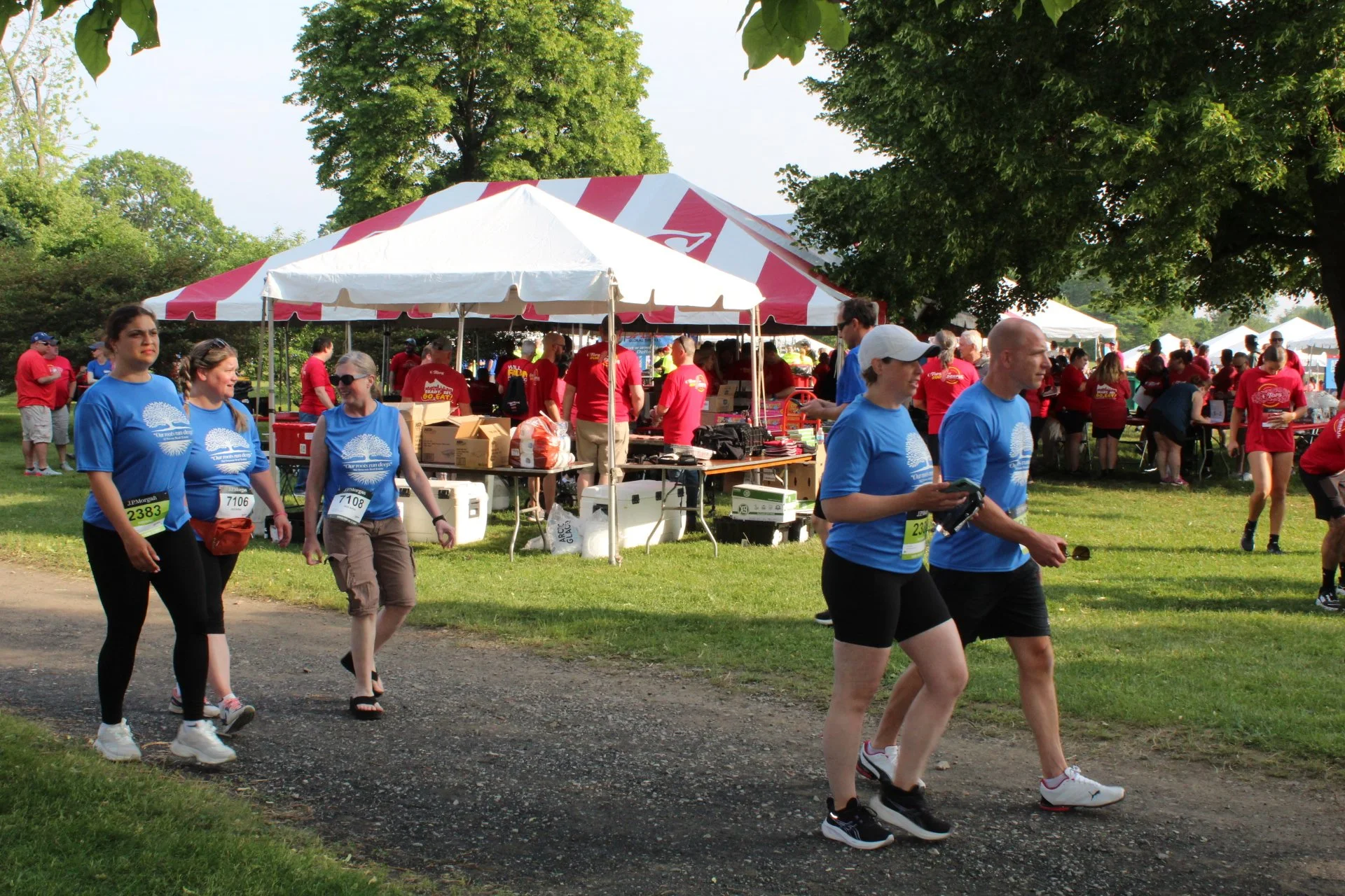 Group photo at the 2025 Corporate Challenge event, featuring people in blue shirts in front of tents and trees.