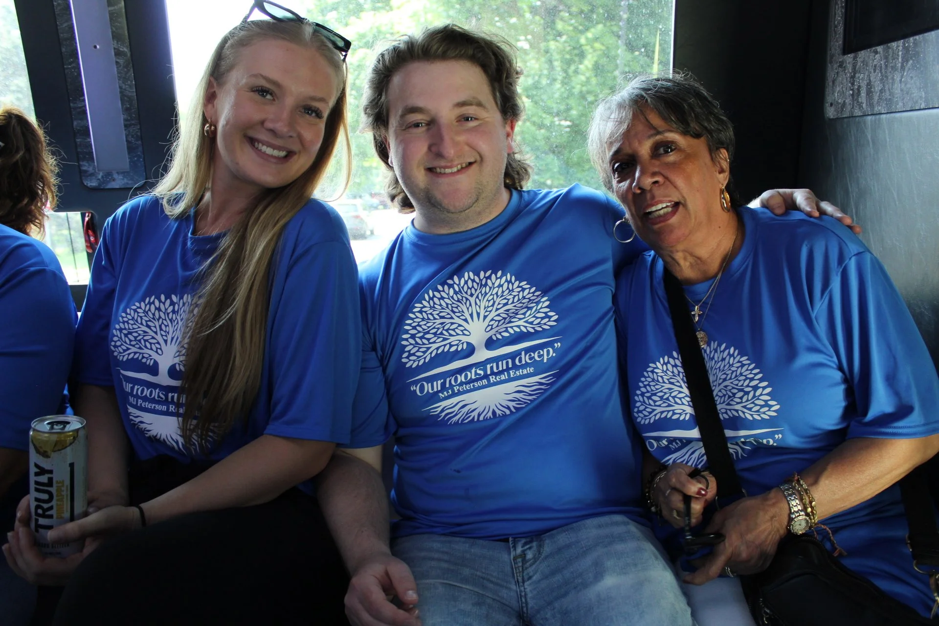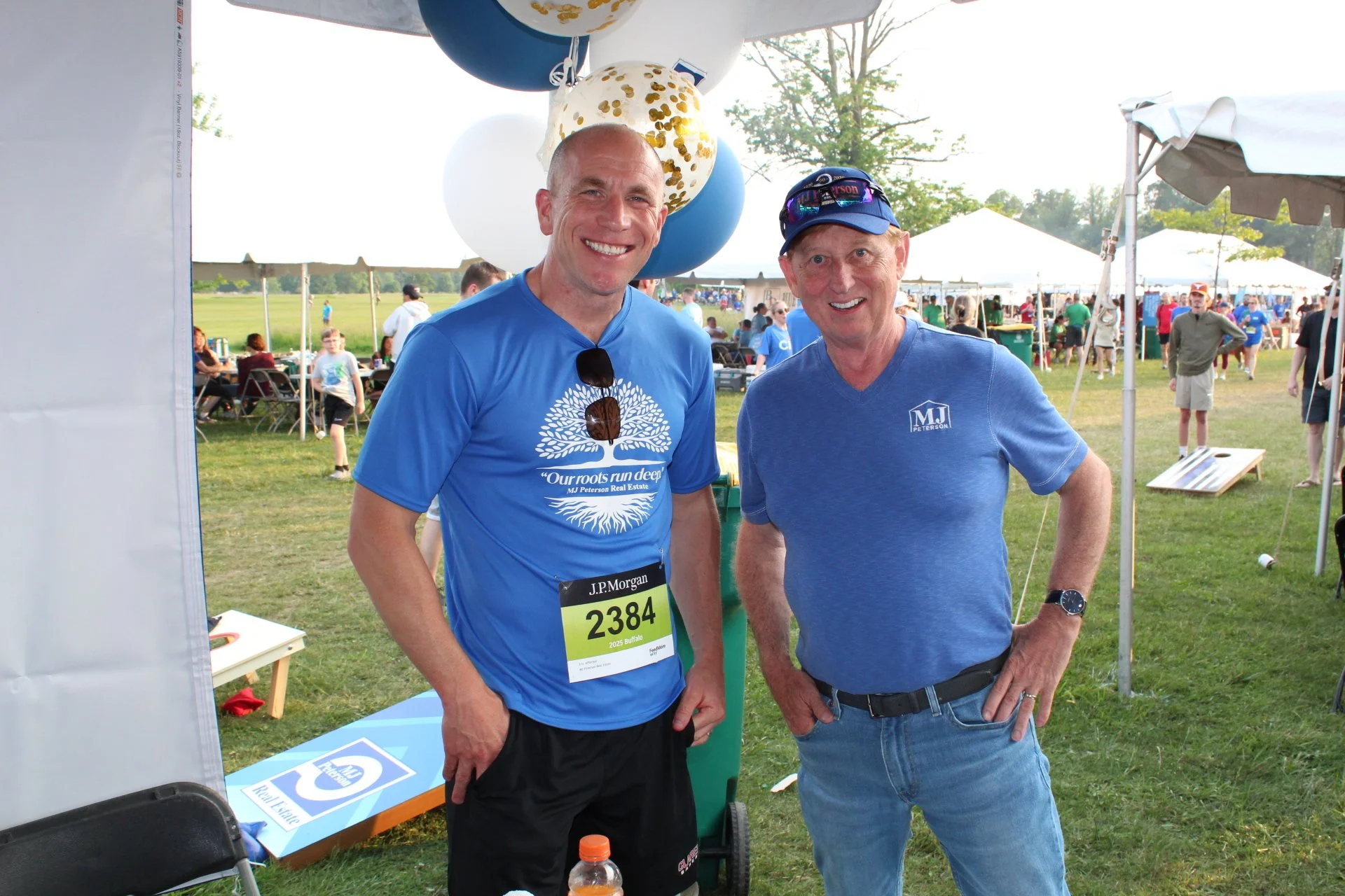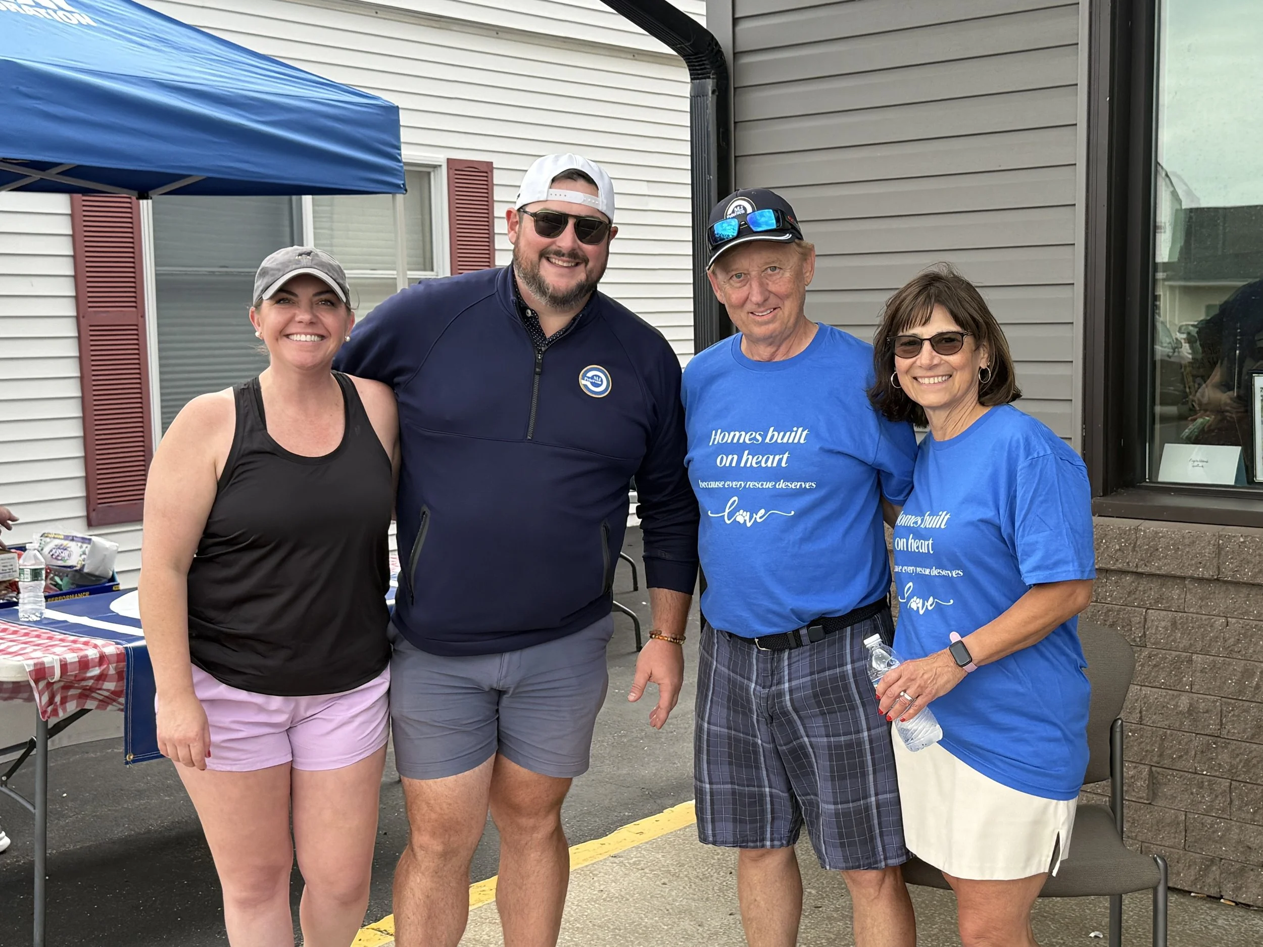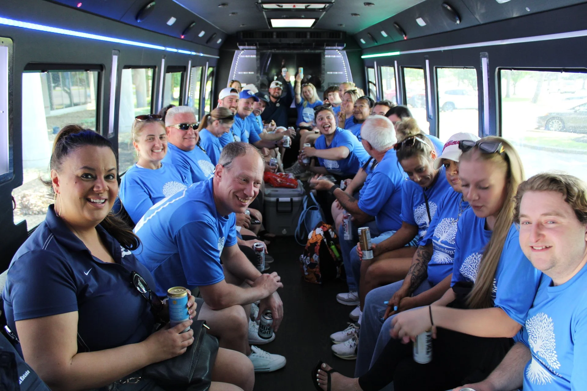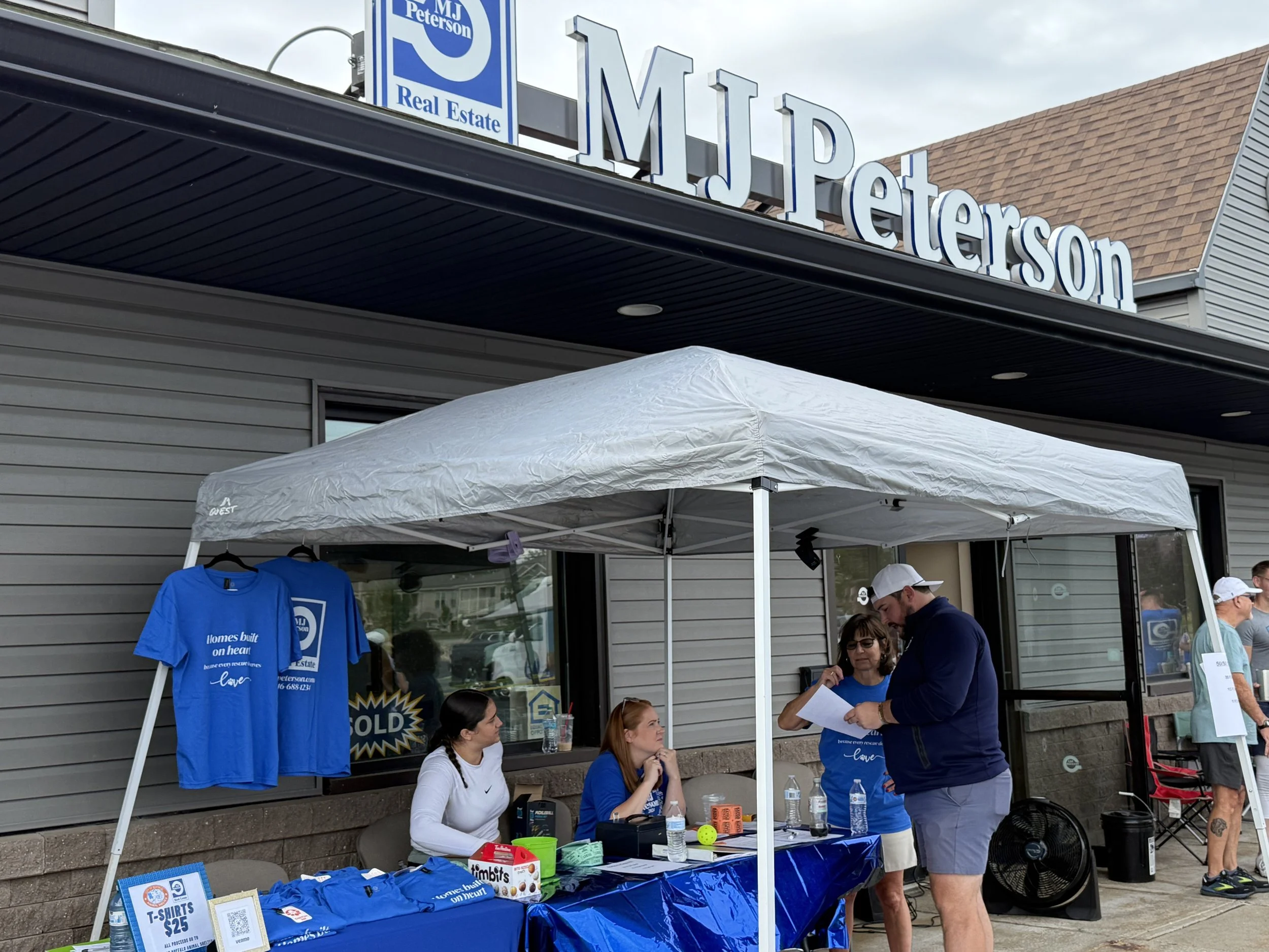 Group photo at the 2025 Corporate Challenge event, featuring people in blue shirts in front of tents and trees.