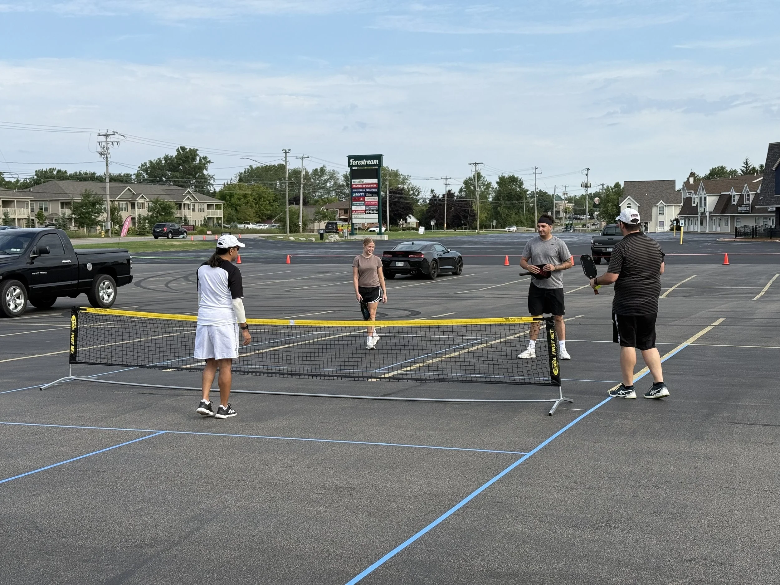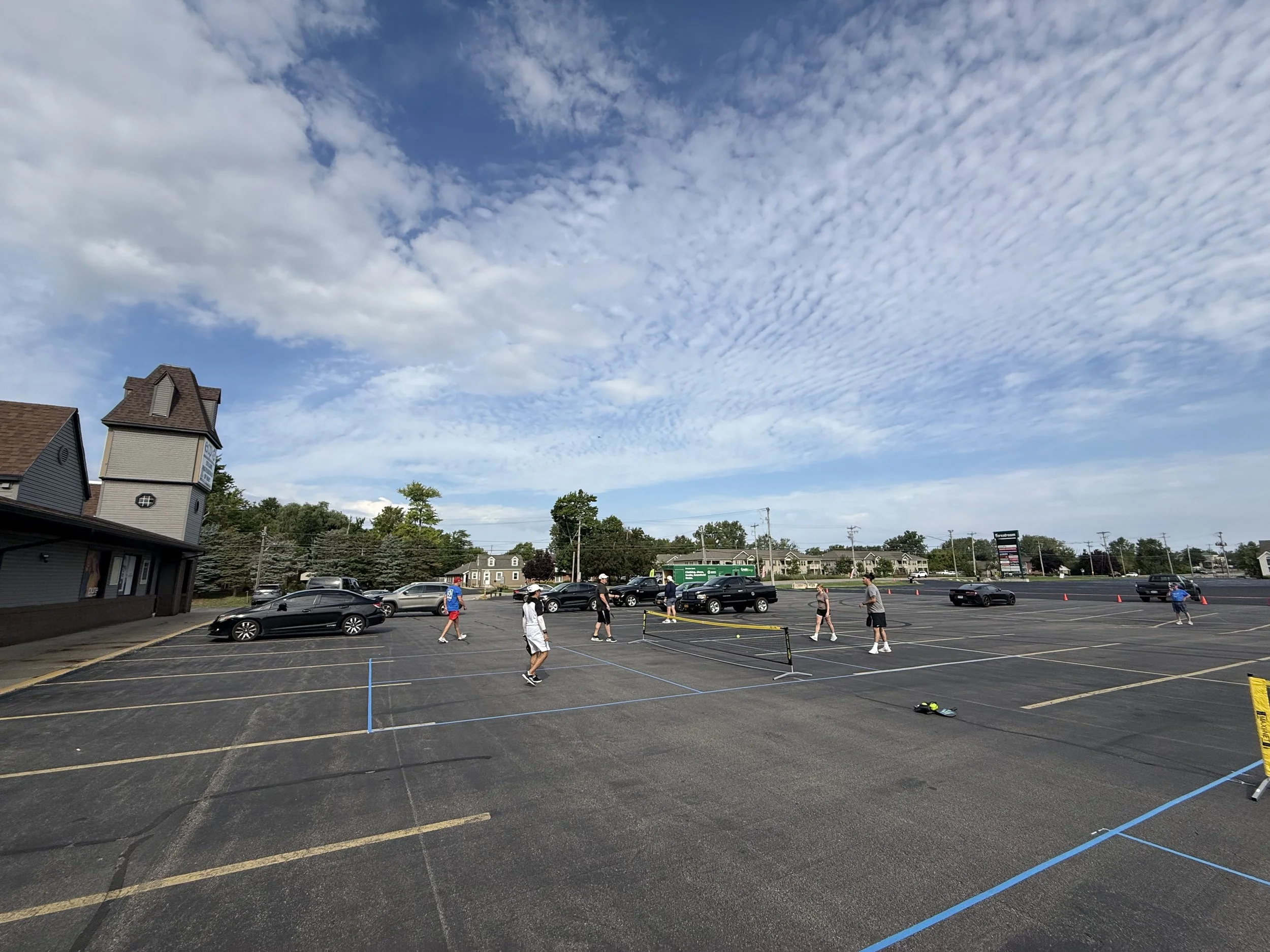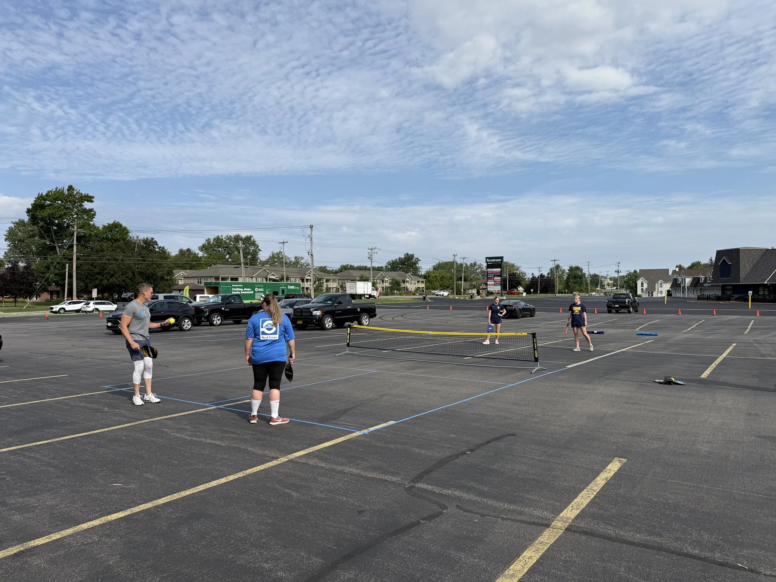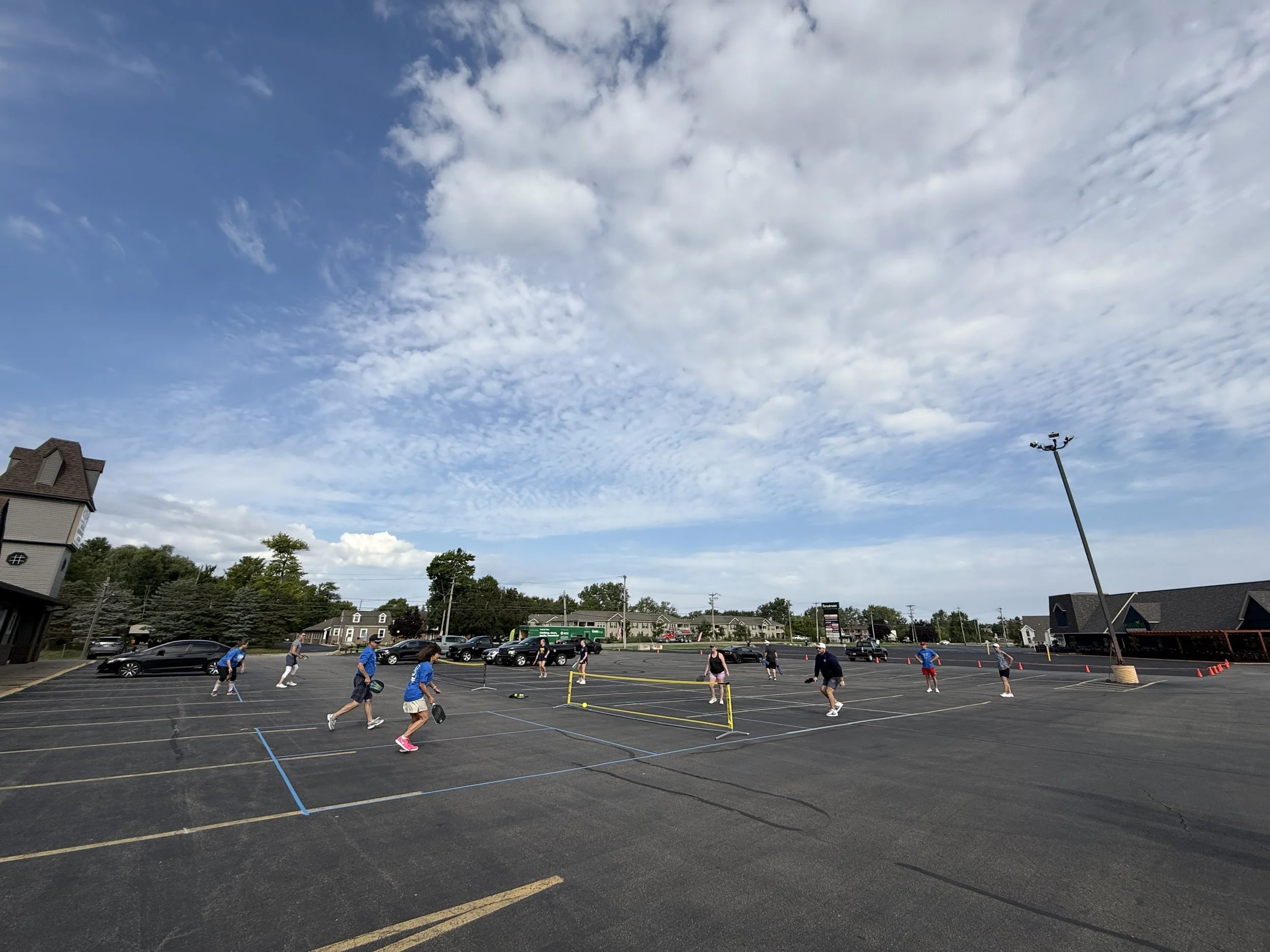 Group of people playing outdoor cornhole on a concrete court near trees, with a basketball hoop in the background.