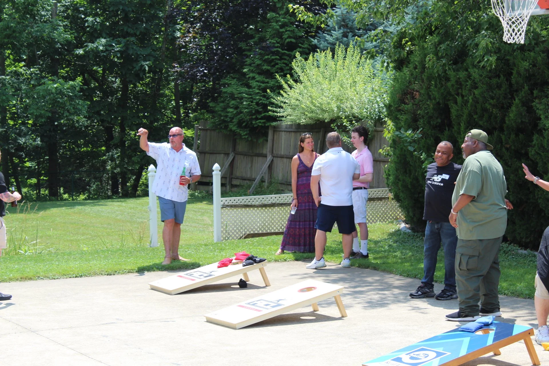 People gathered outdoors in a backyard, playing cornhole and socializing near a white building with large windows, surrounded by trees.