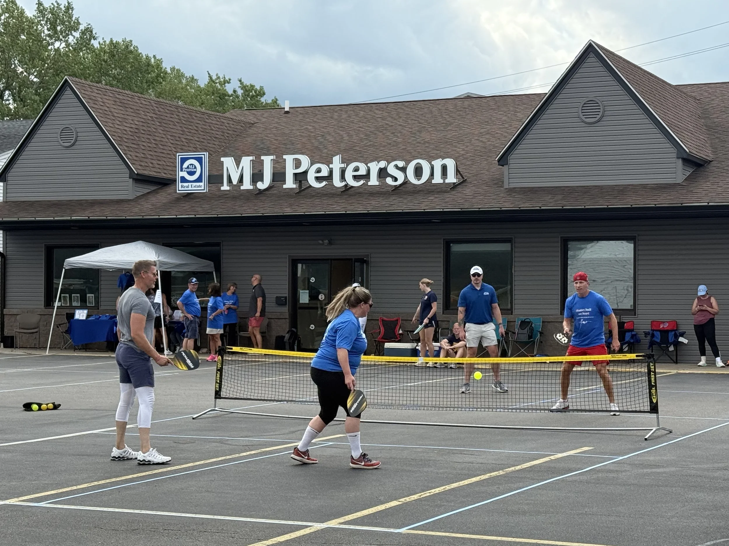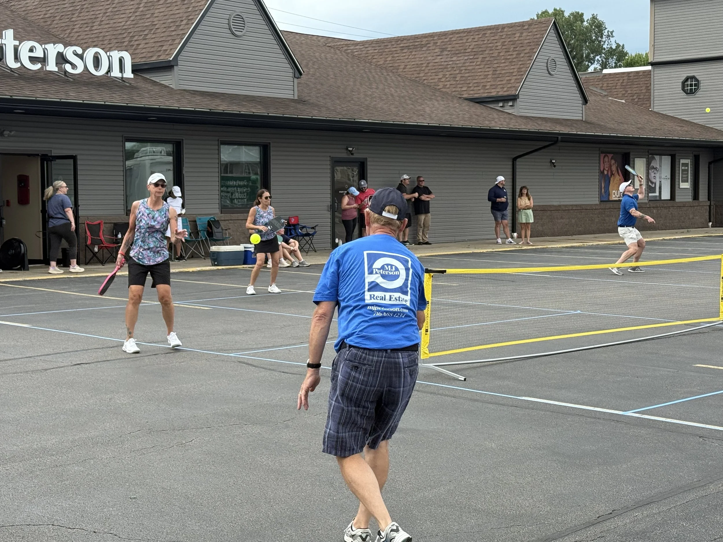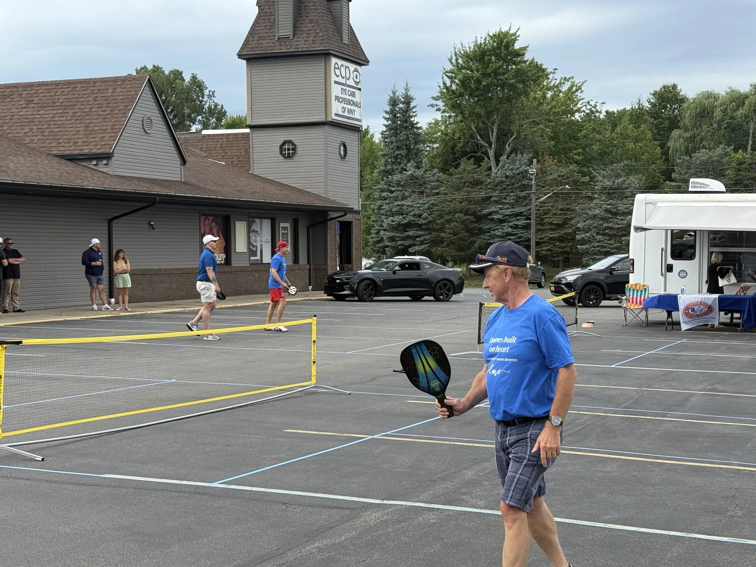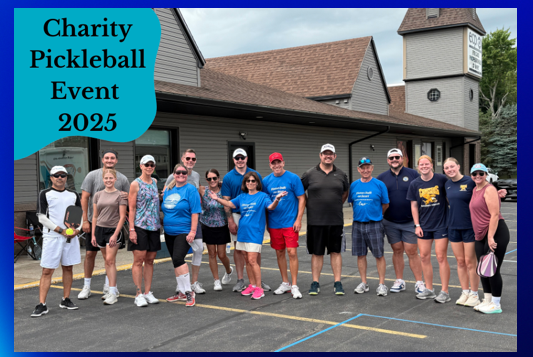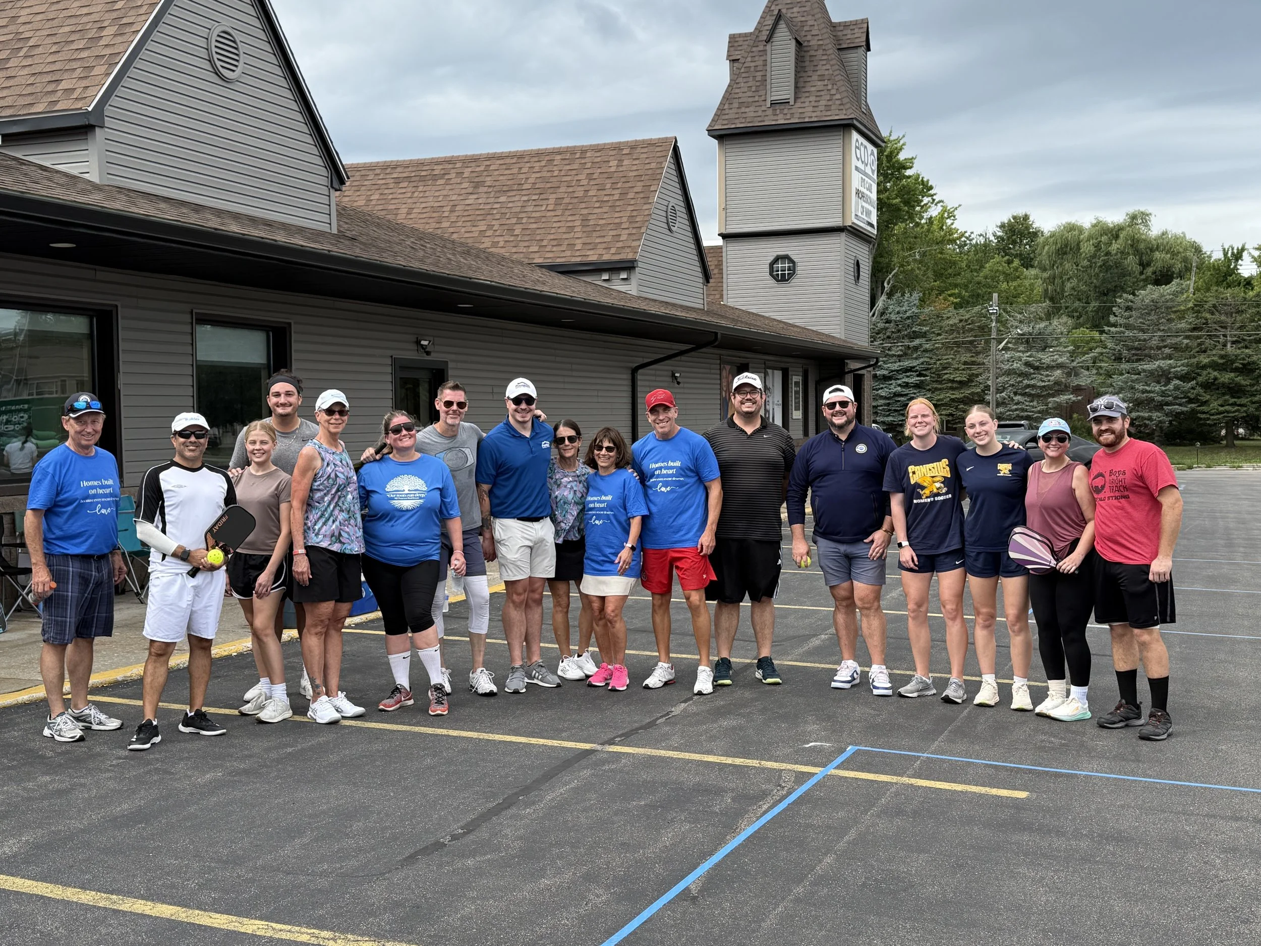 Group of people gathered outside for a charity pickleball event in 2025, posing in front of a building with a clock tower.
