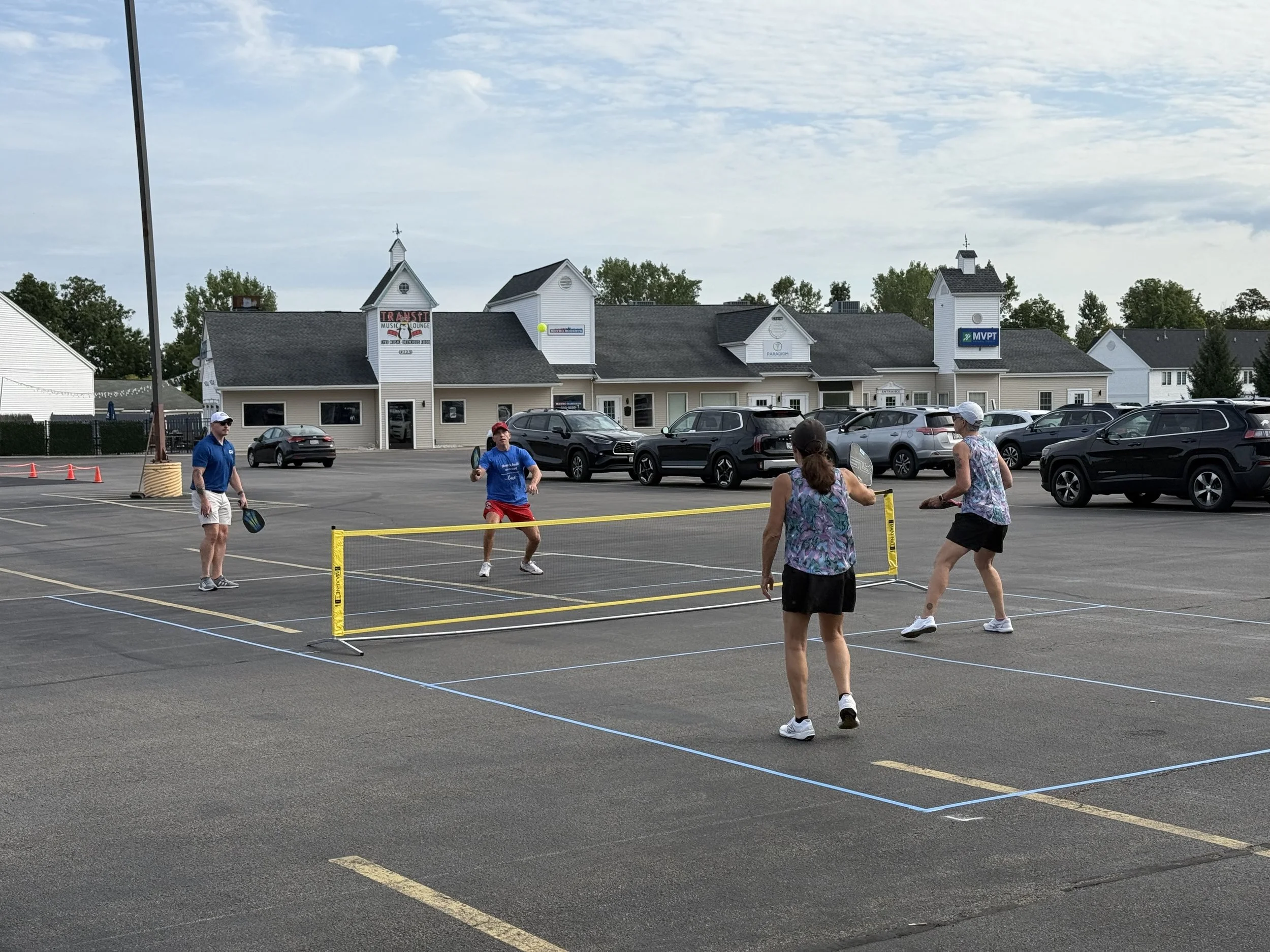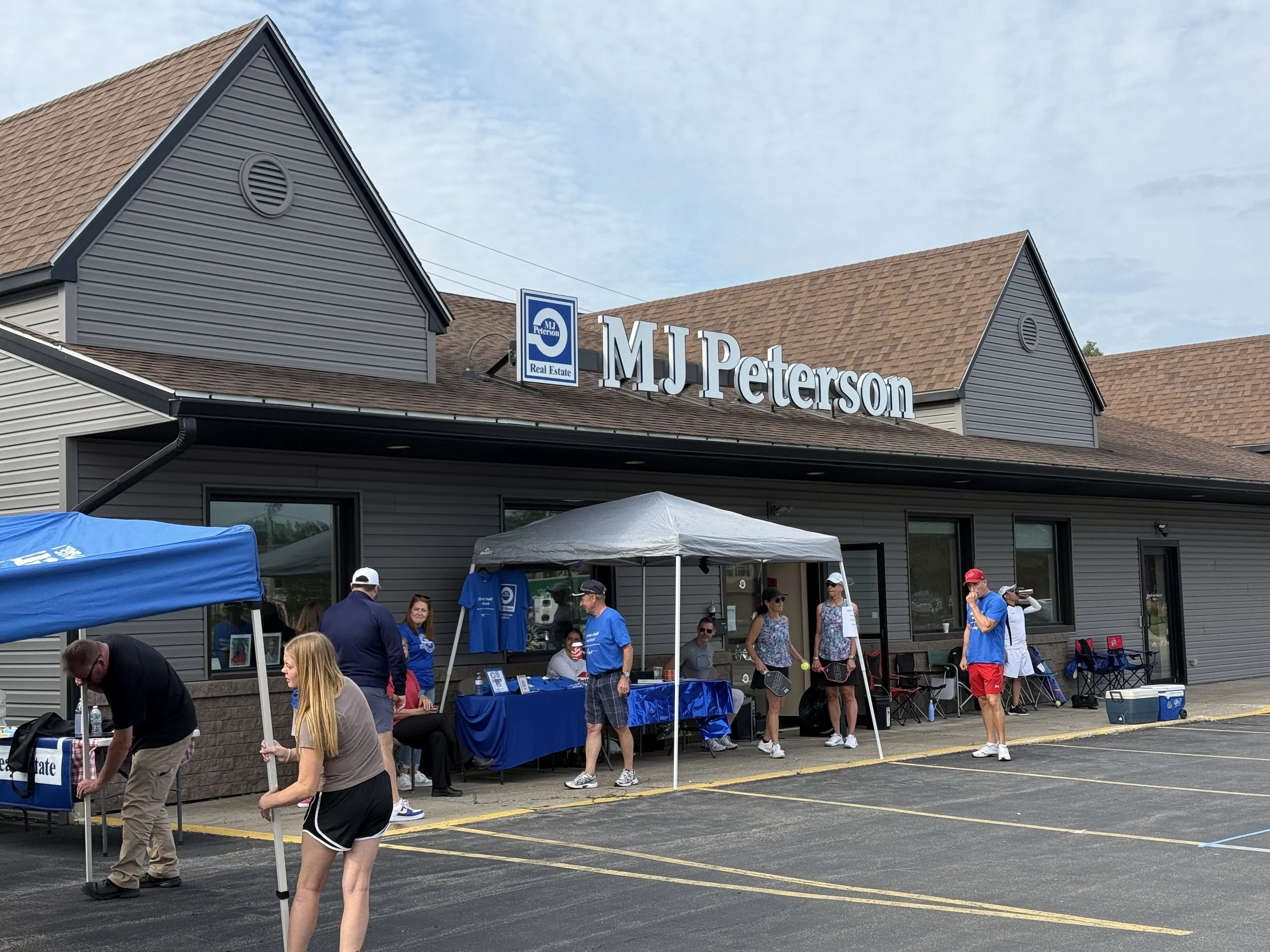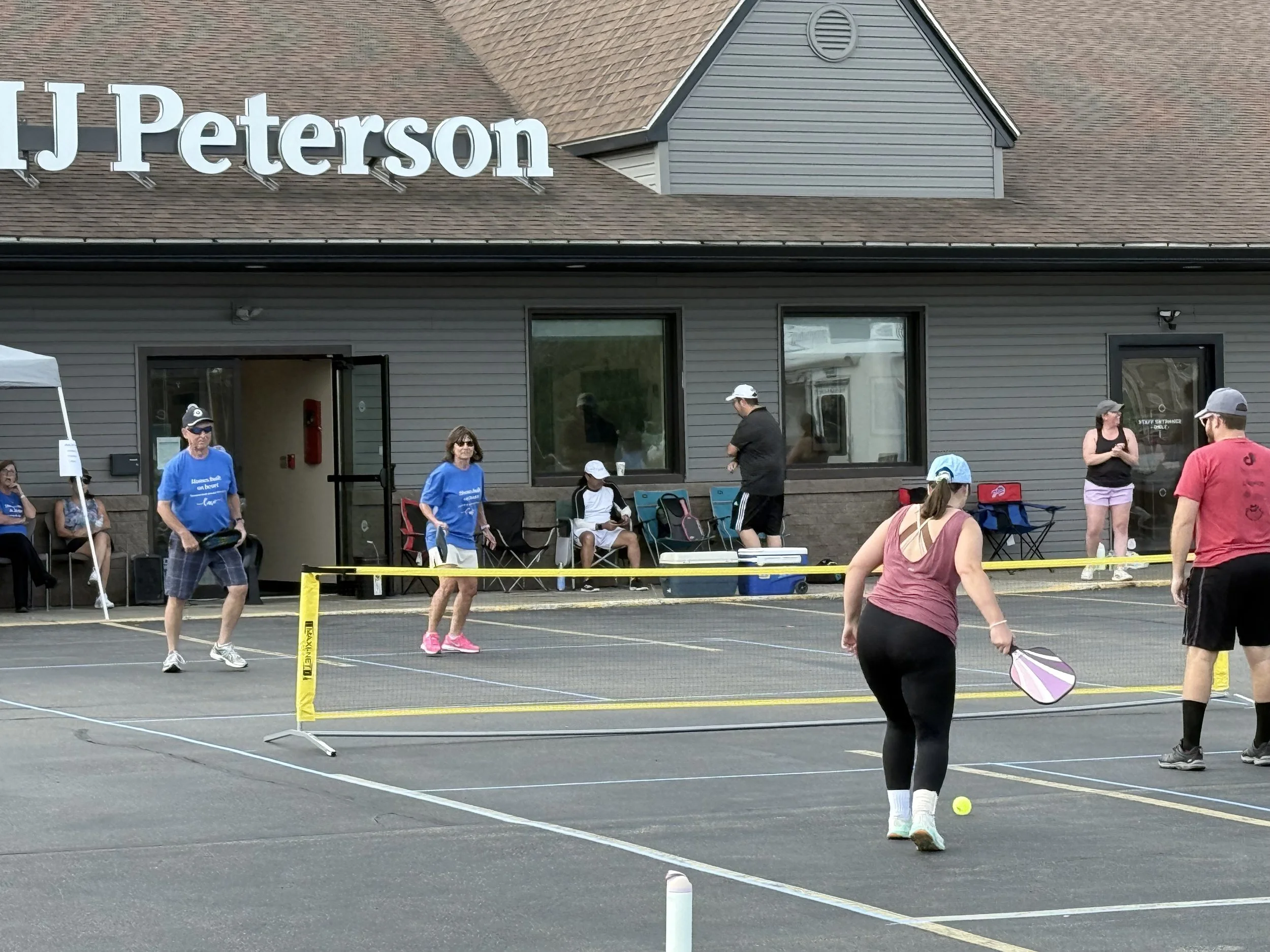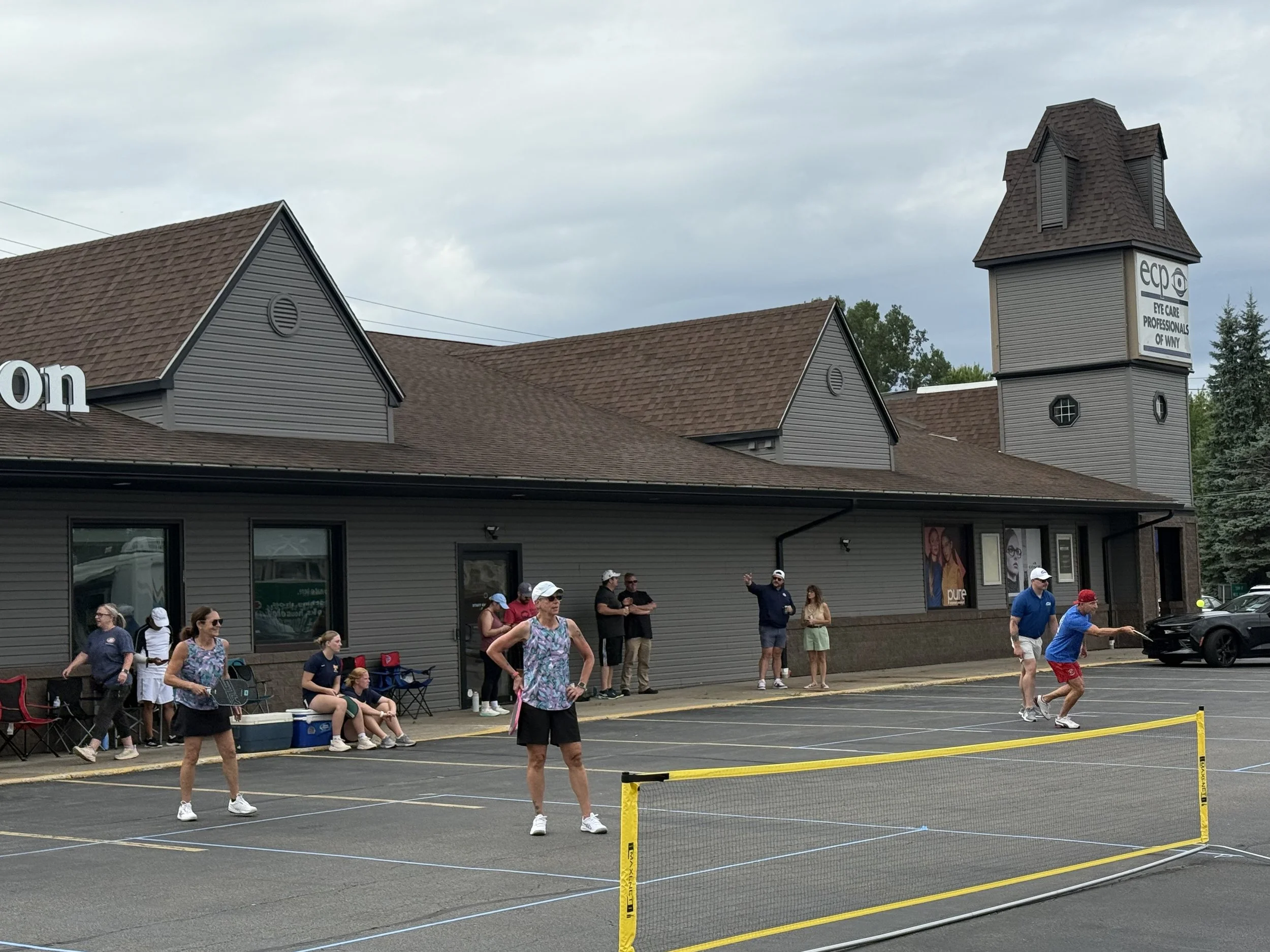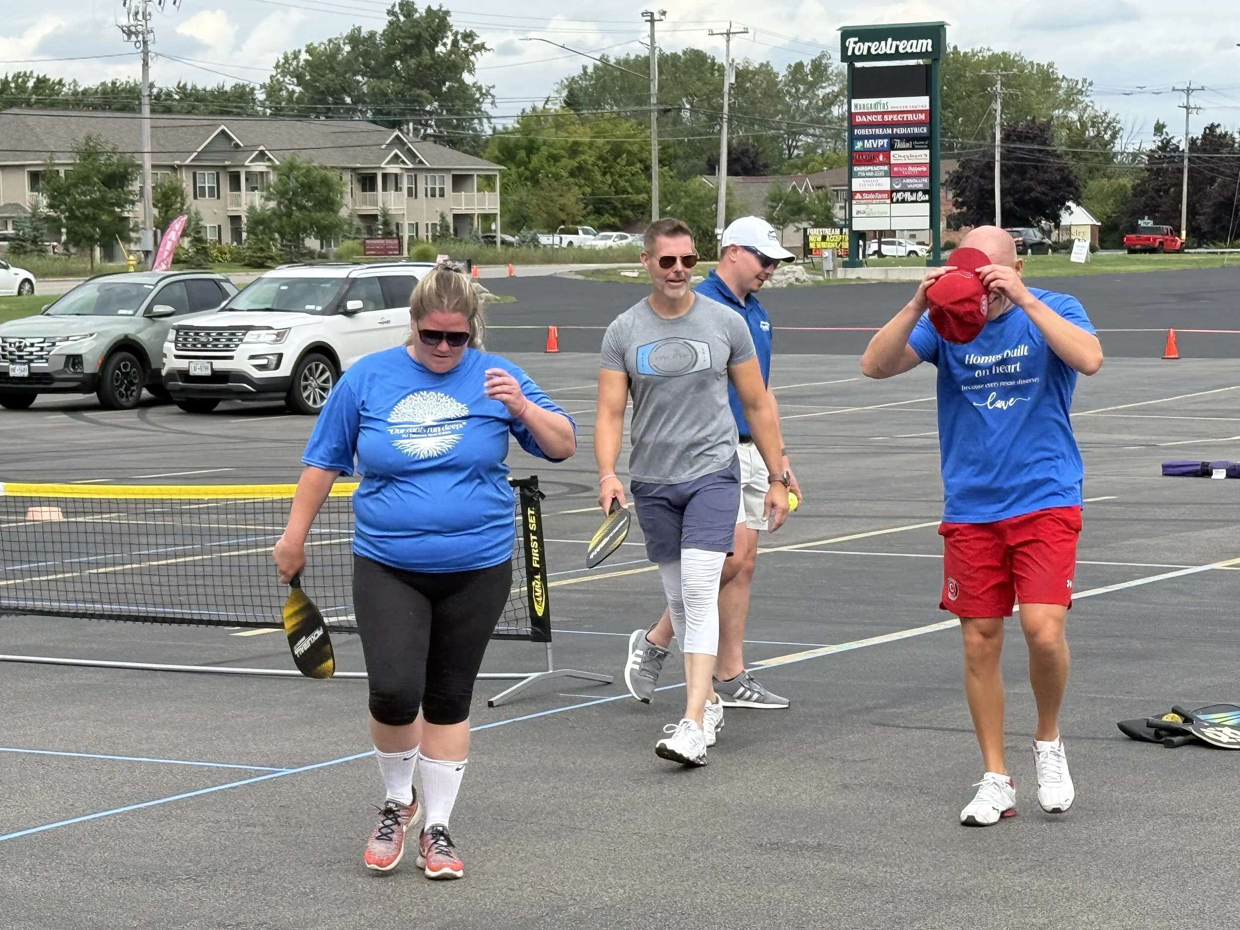 Group of people gathered outside for a charity pickleball event in 2025, posing in front of a building with a clock tower.