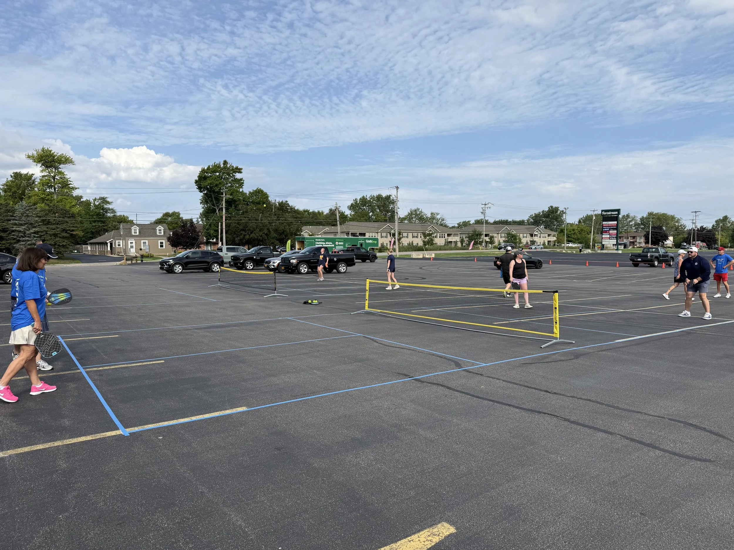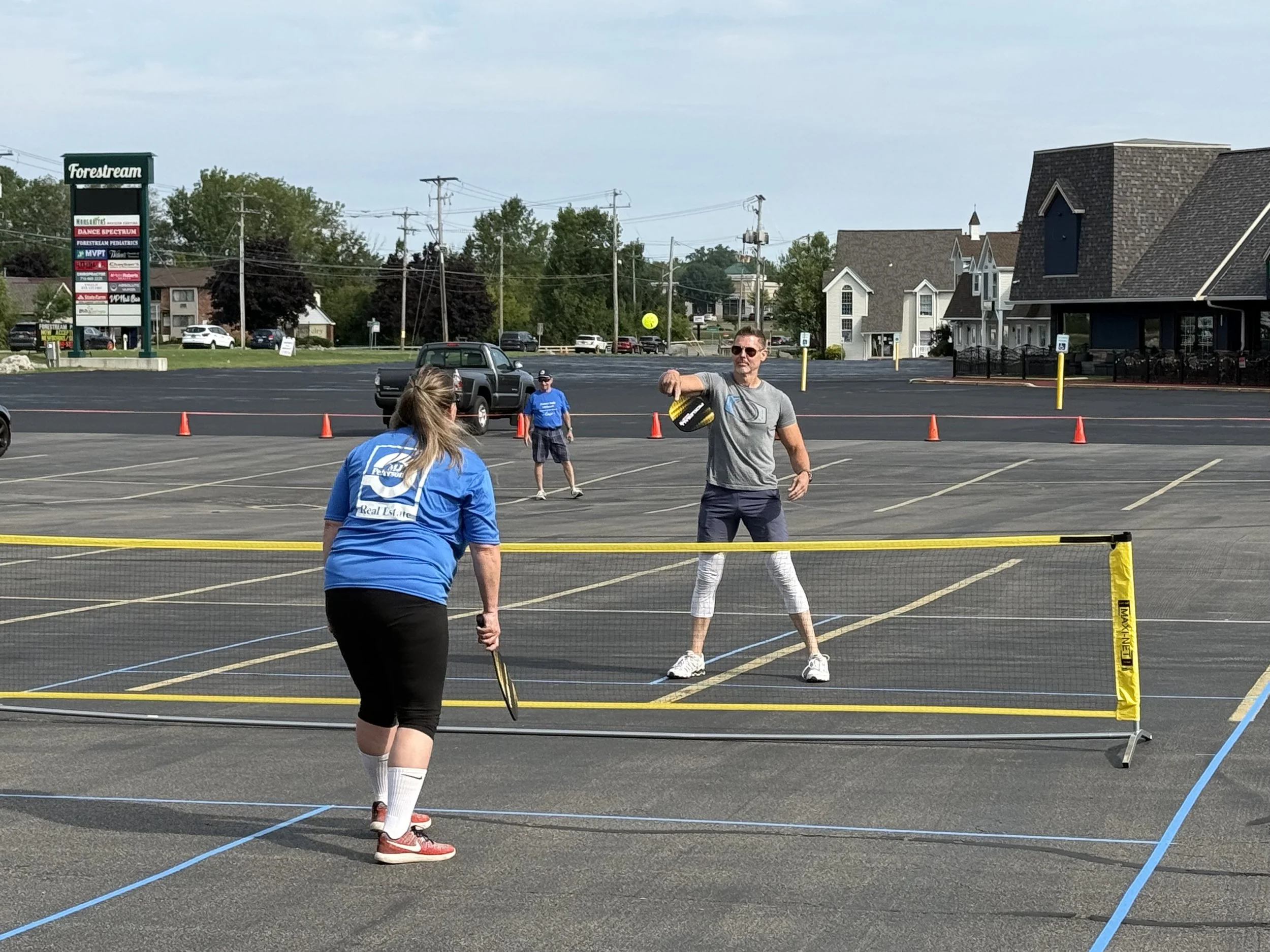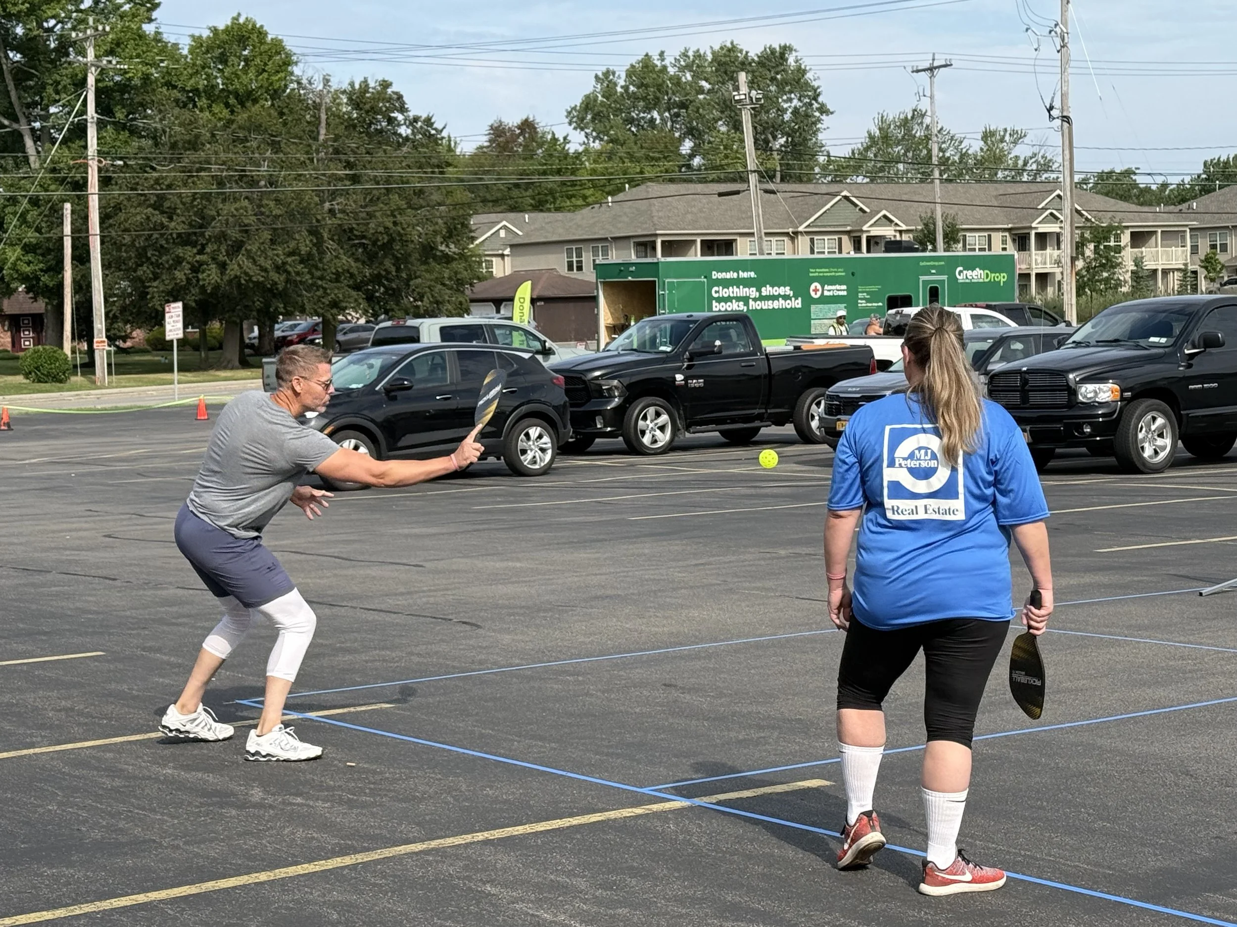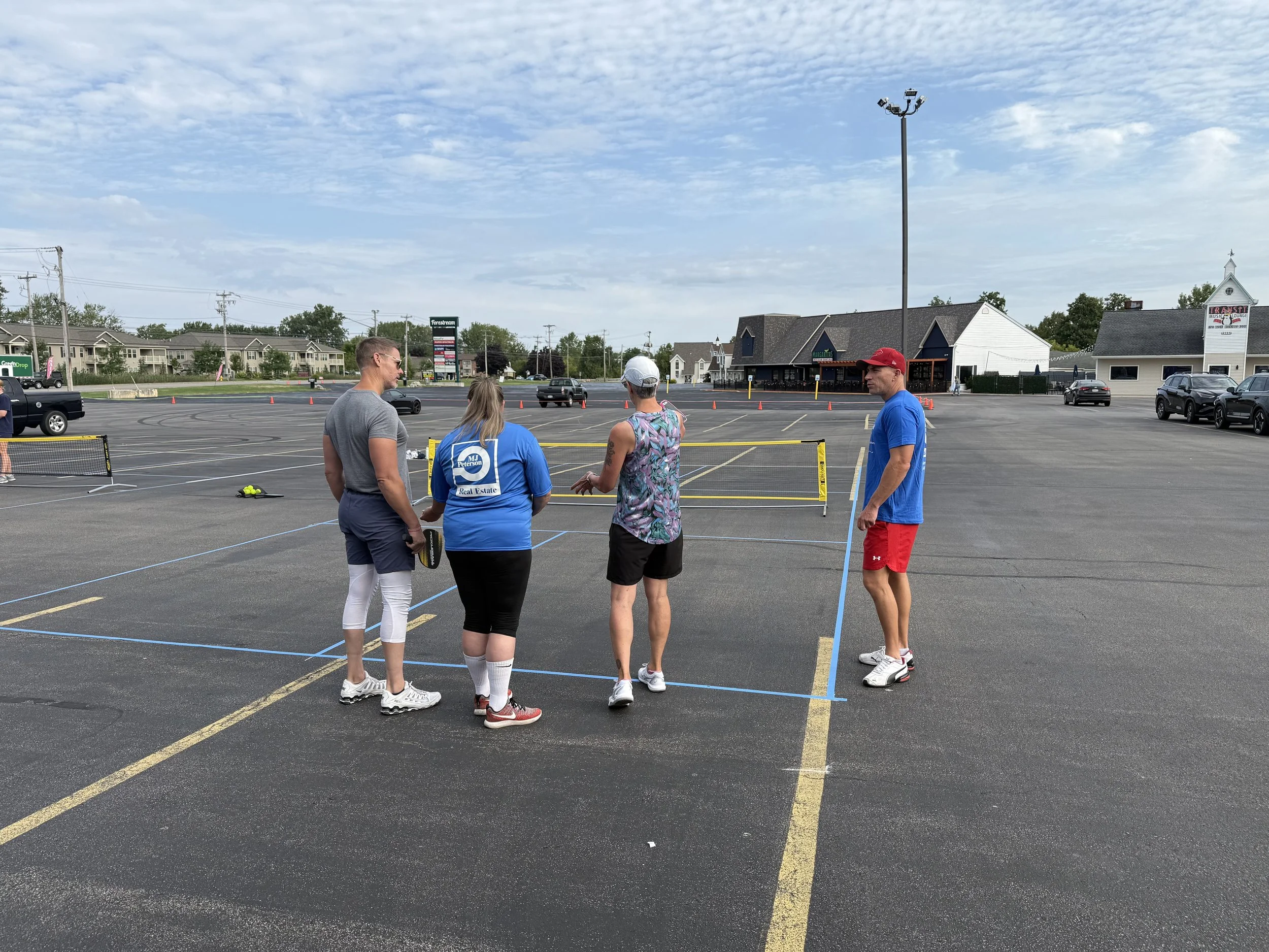 Group of people gathered outside for a charity pickleball event in 2025, posing in front of a building with a clock tower.