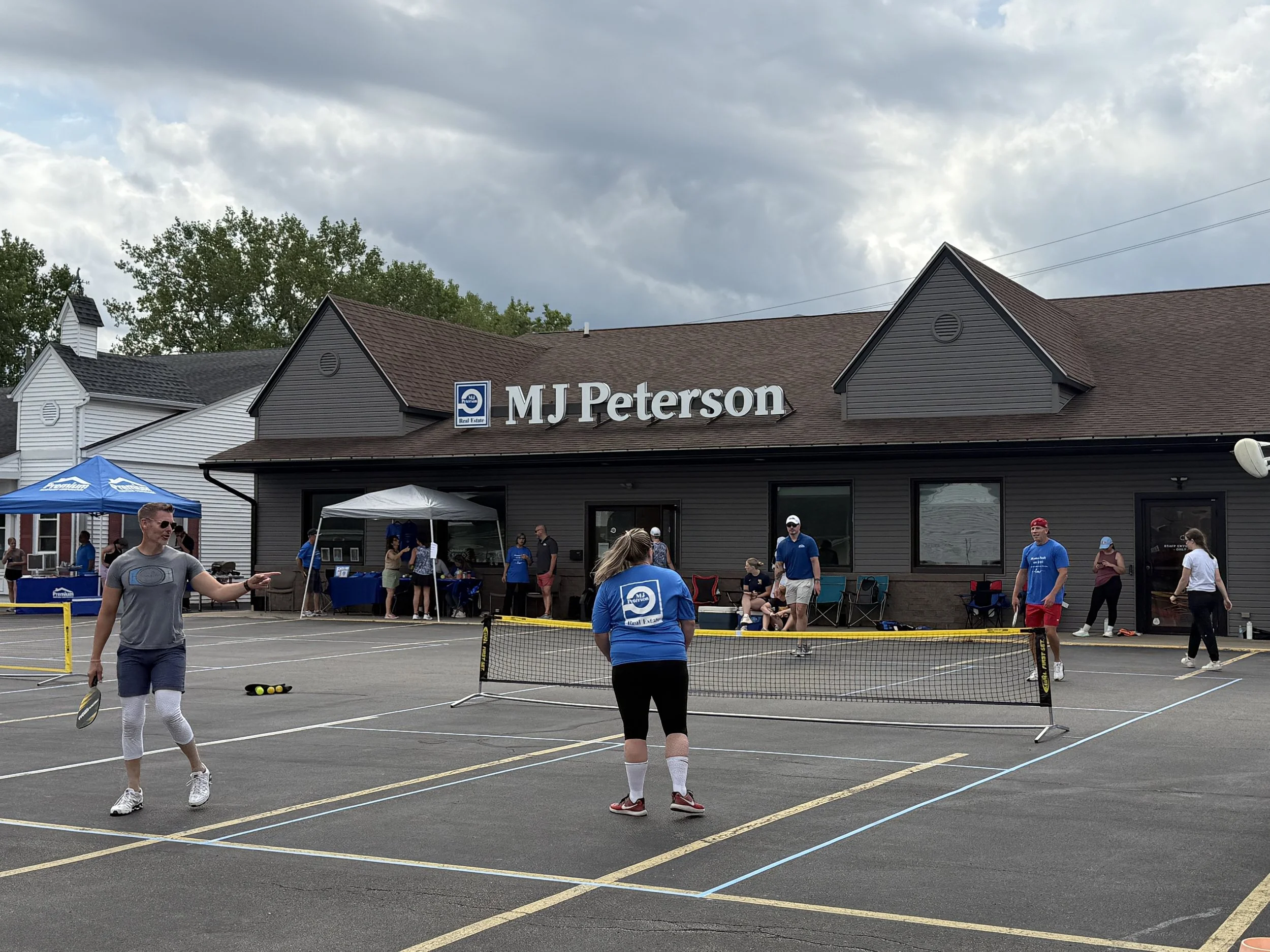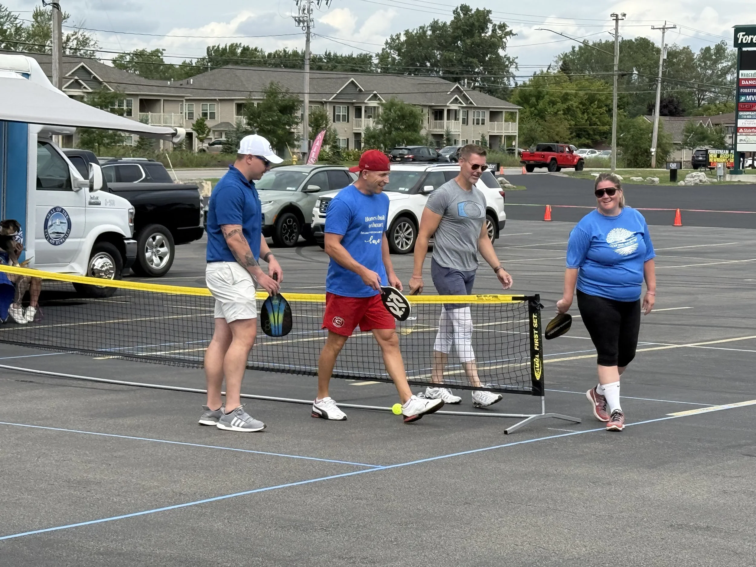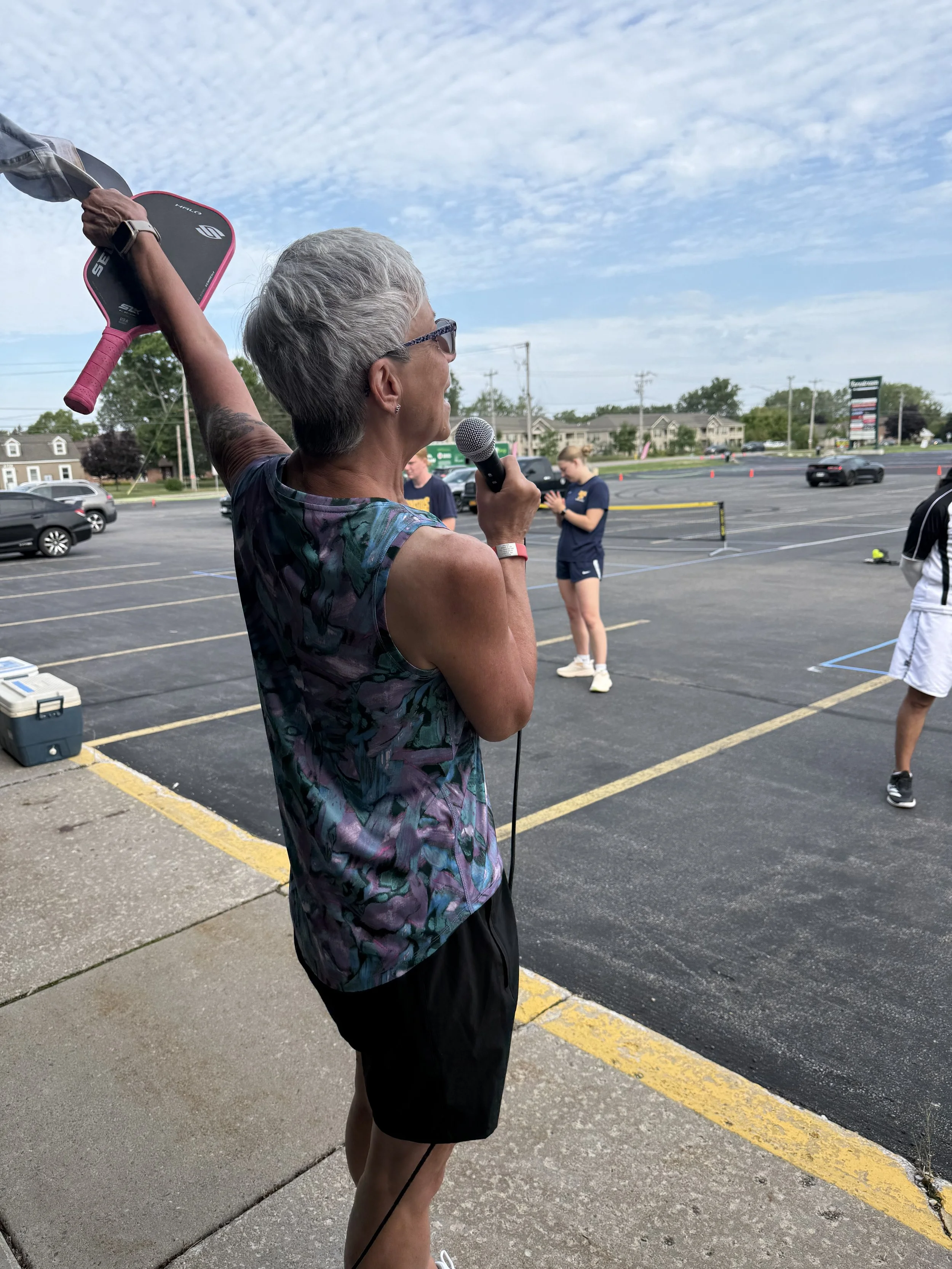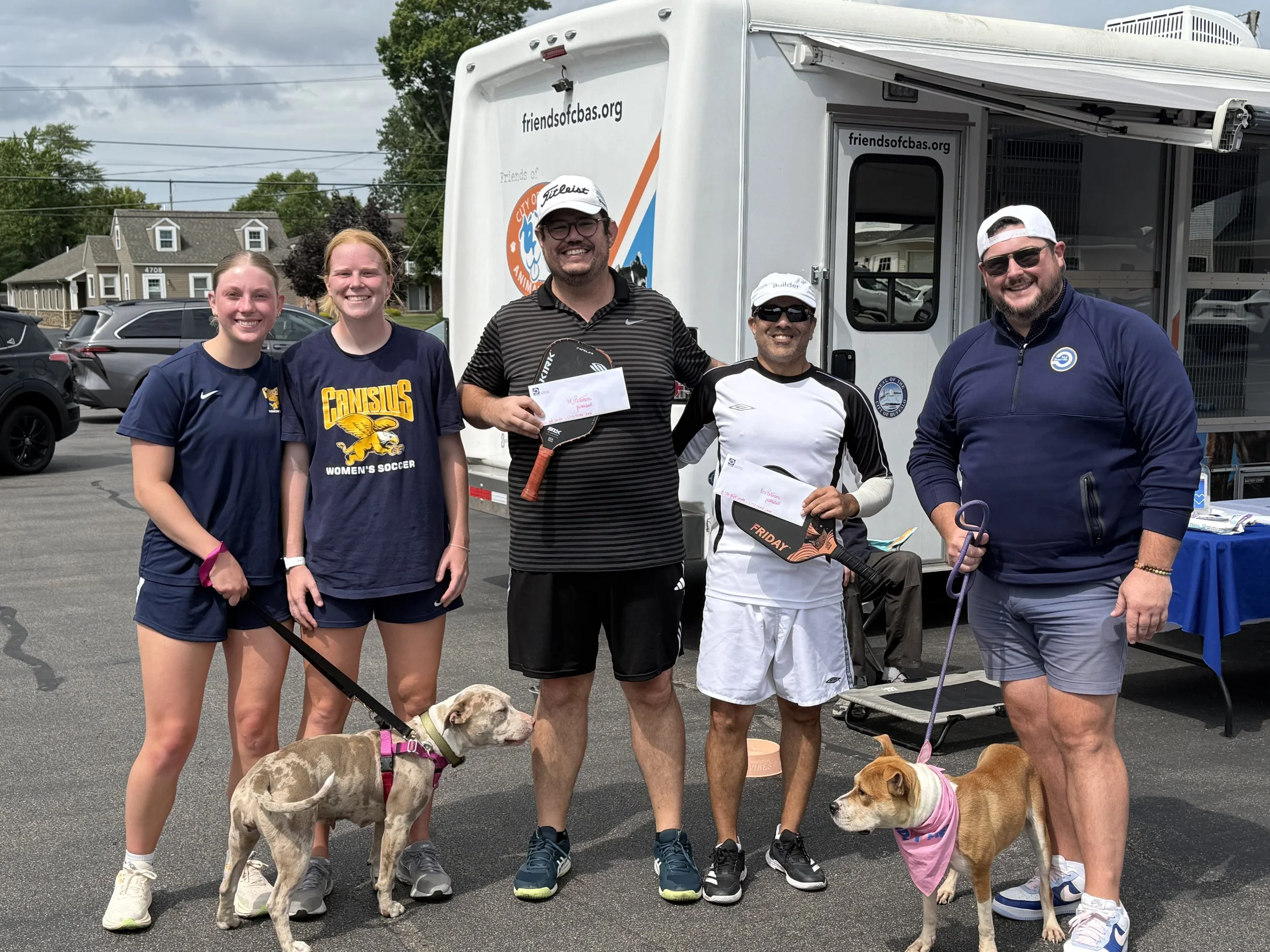 Group of people gathered outside for a charity pickleball event in 2025, posing in front of a building with a clock tower.