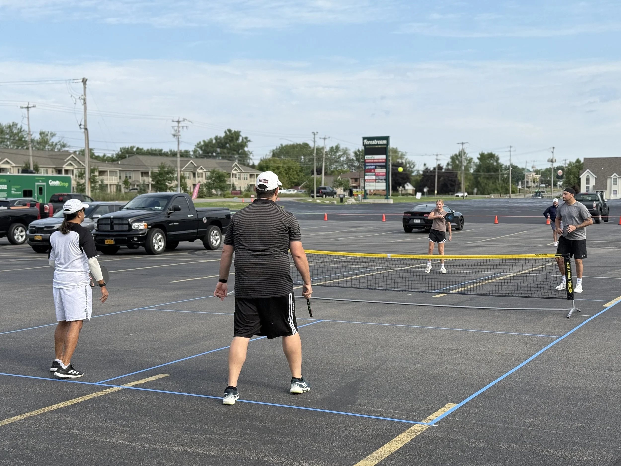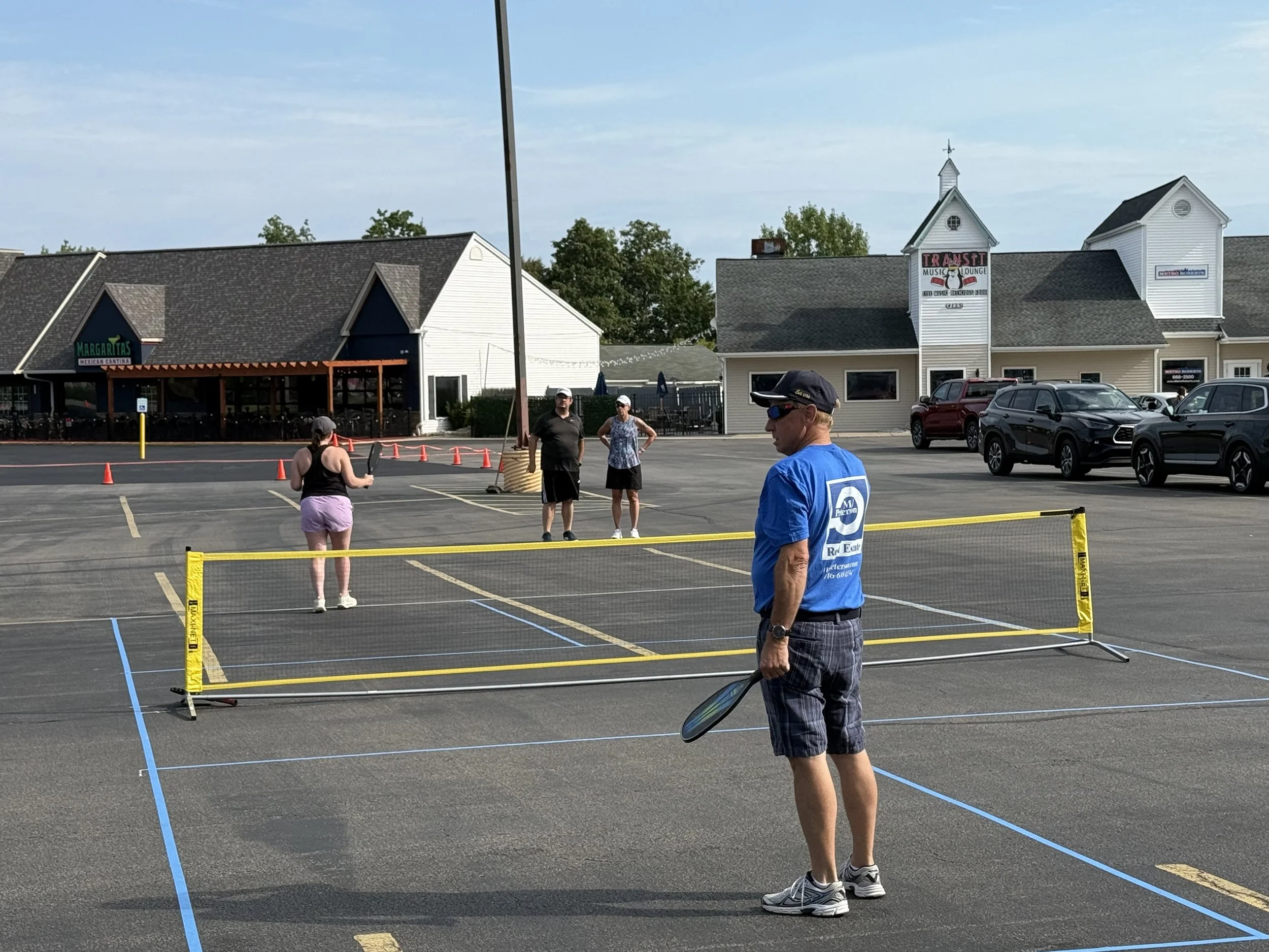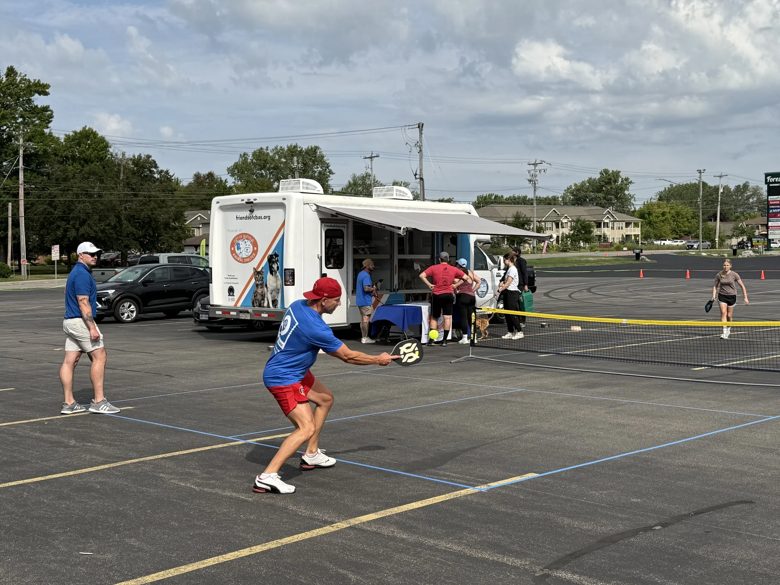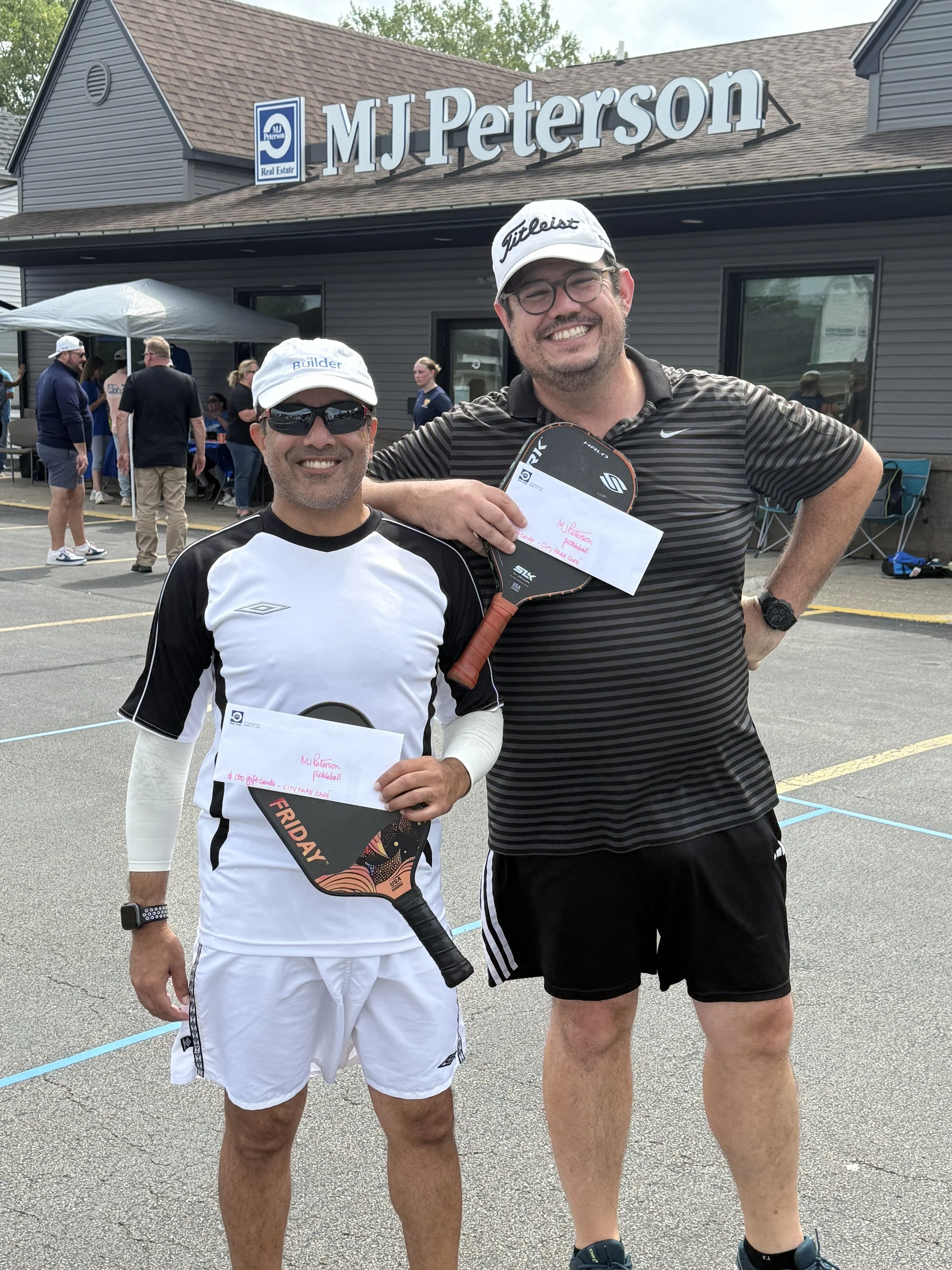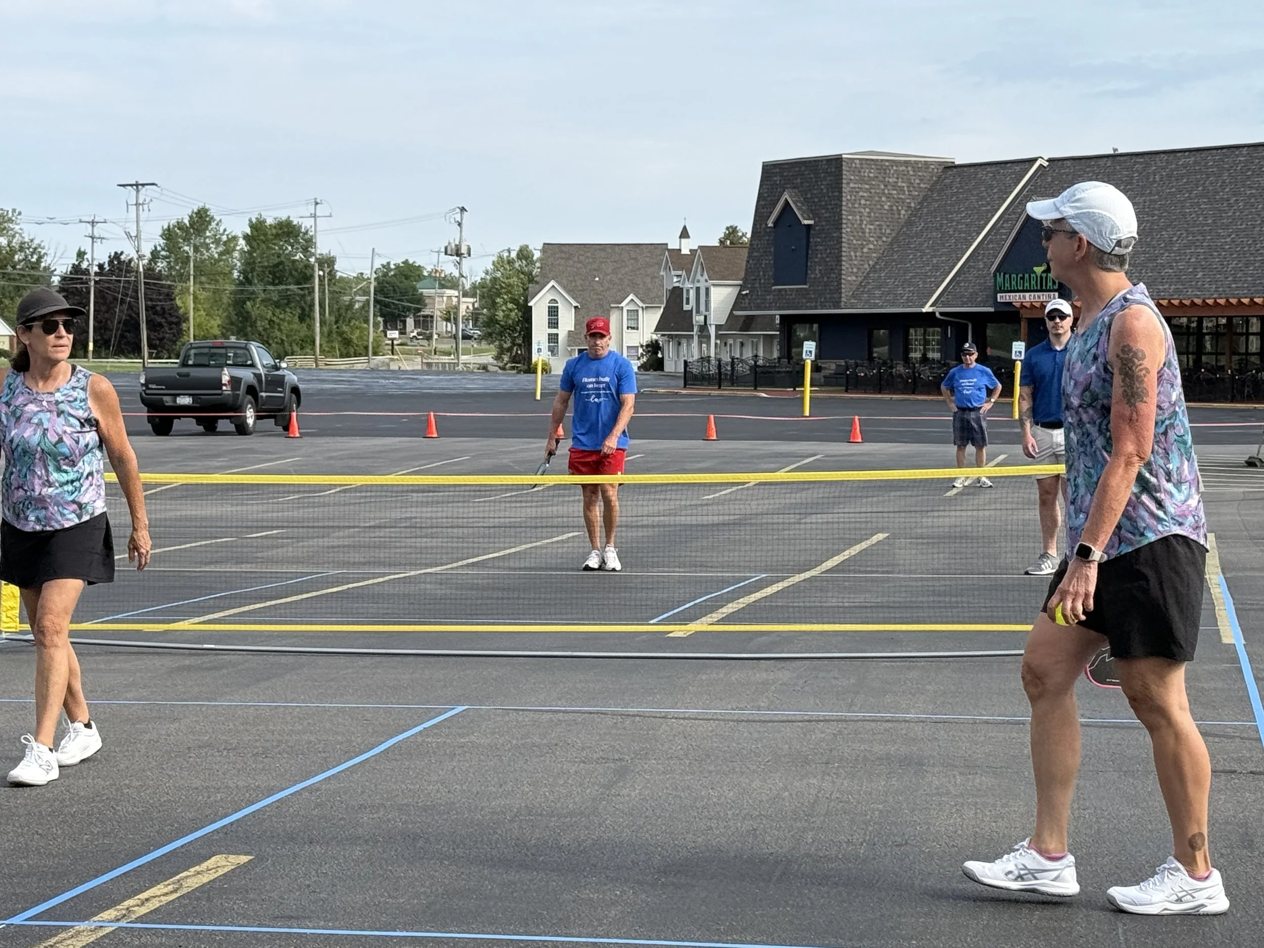 Group of people gathered outside for a charity pickleball event in 2025, posing in front of a building with a clock tower.