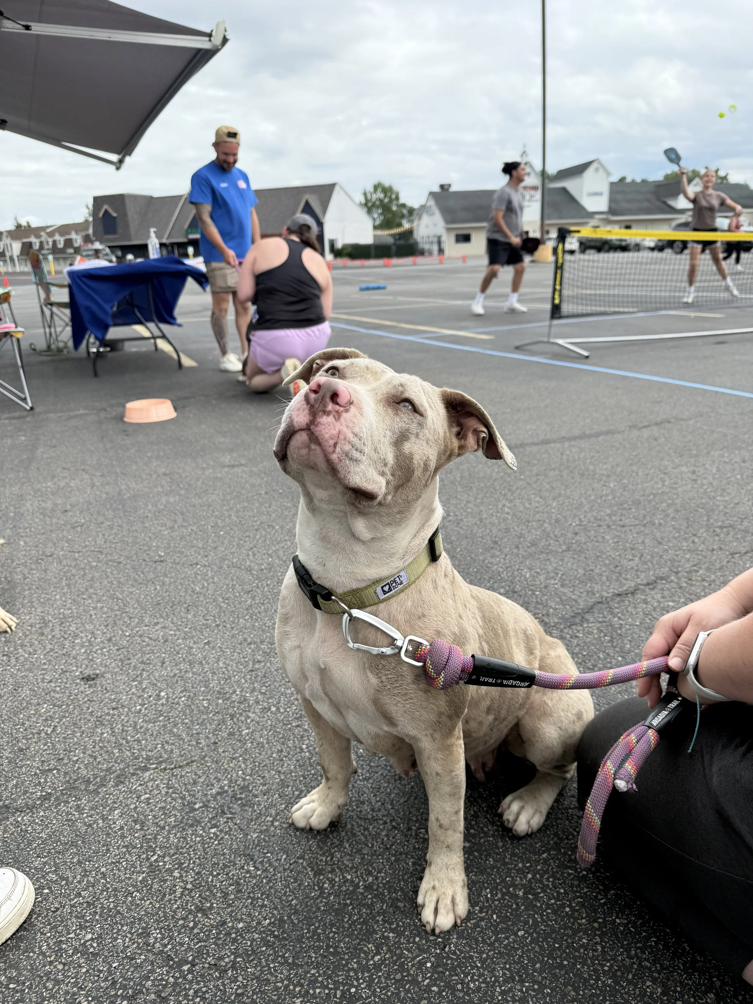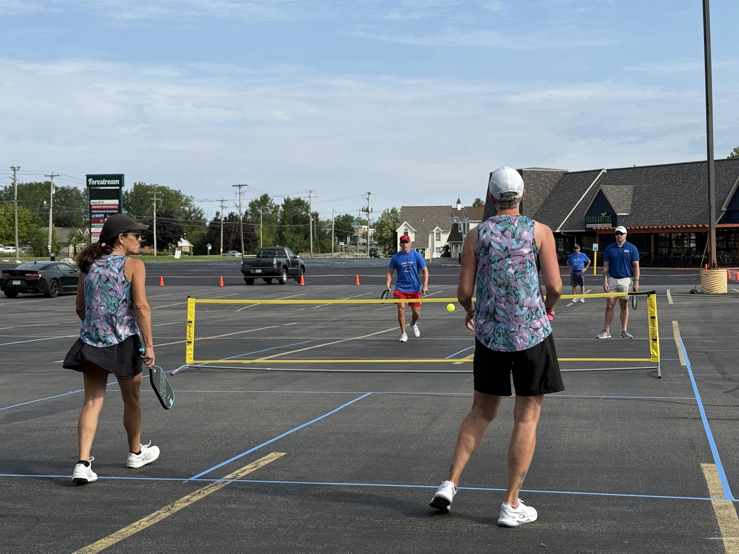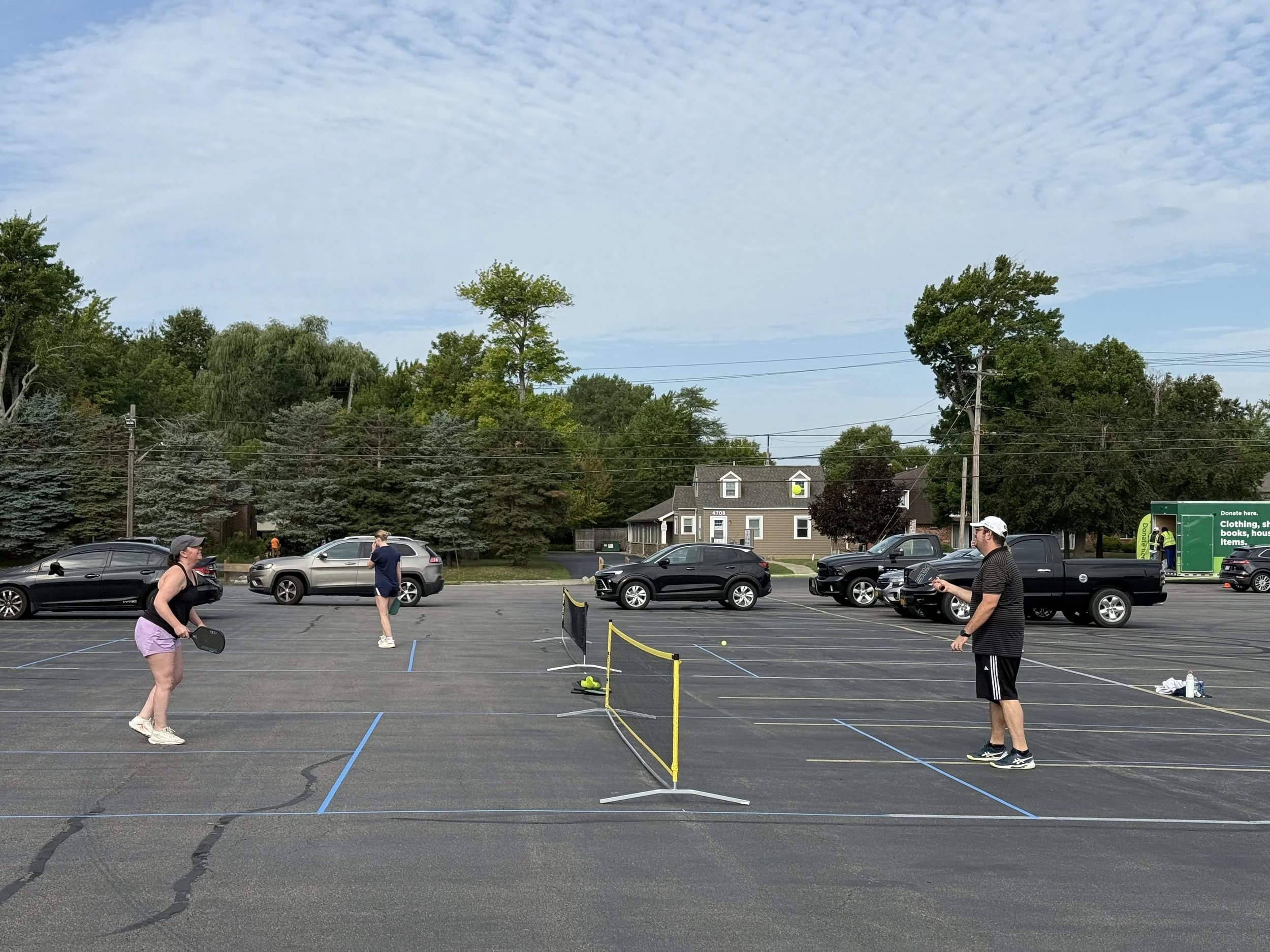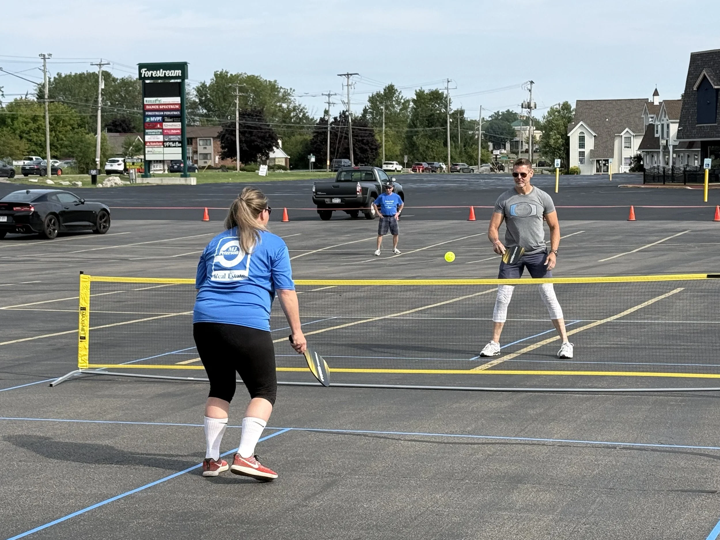 Group of people gathered outside for a charity pickleball event in 2025, posing in front of a building with a clock tower.