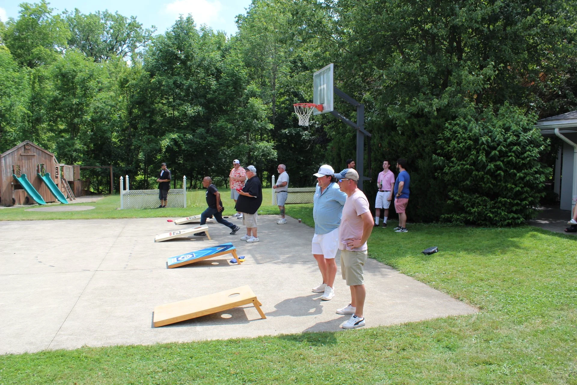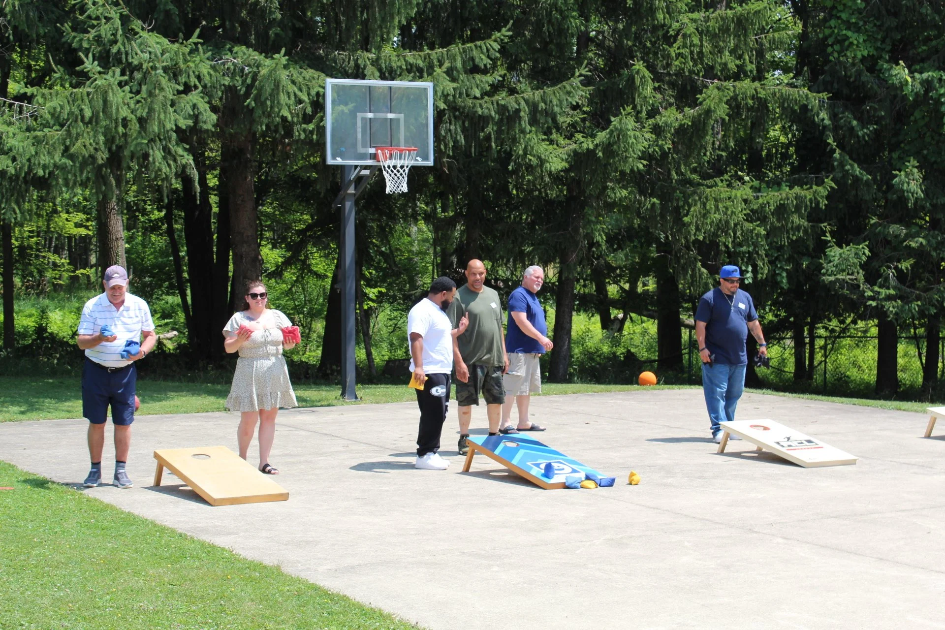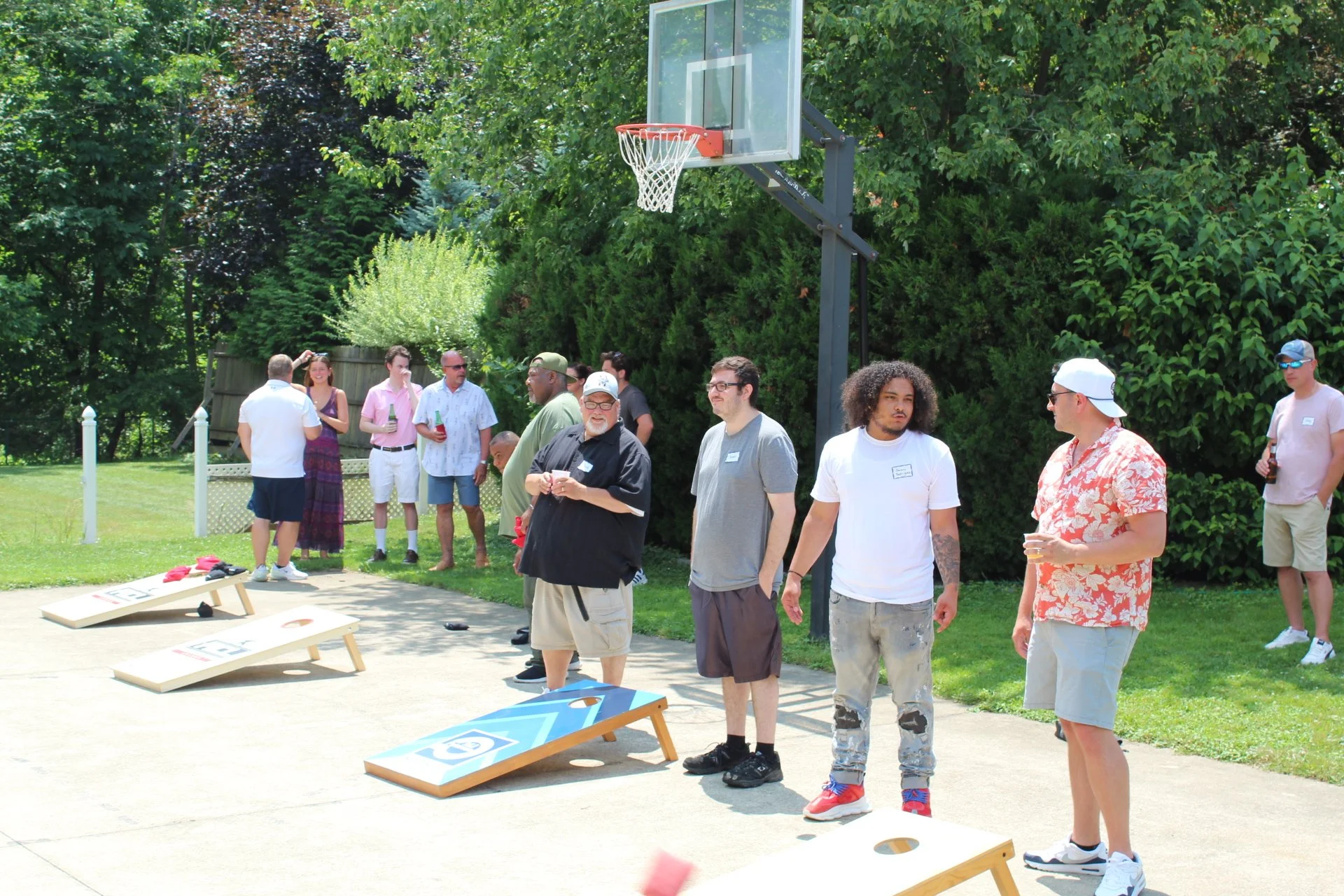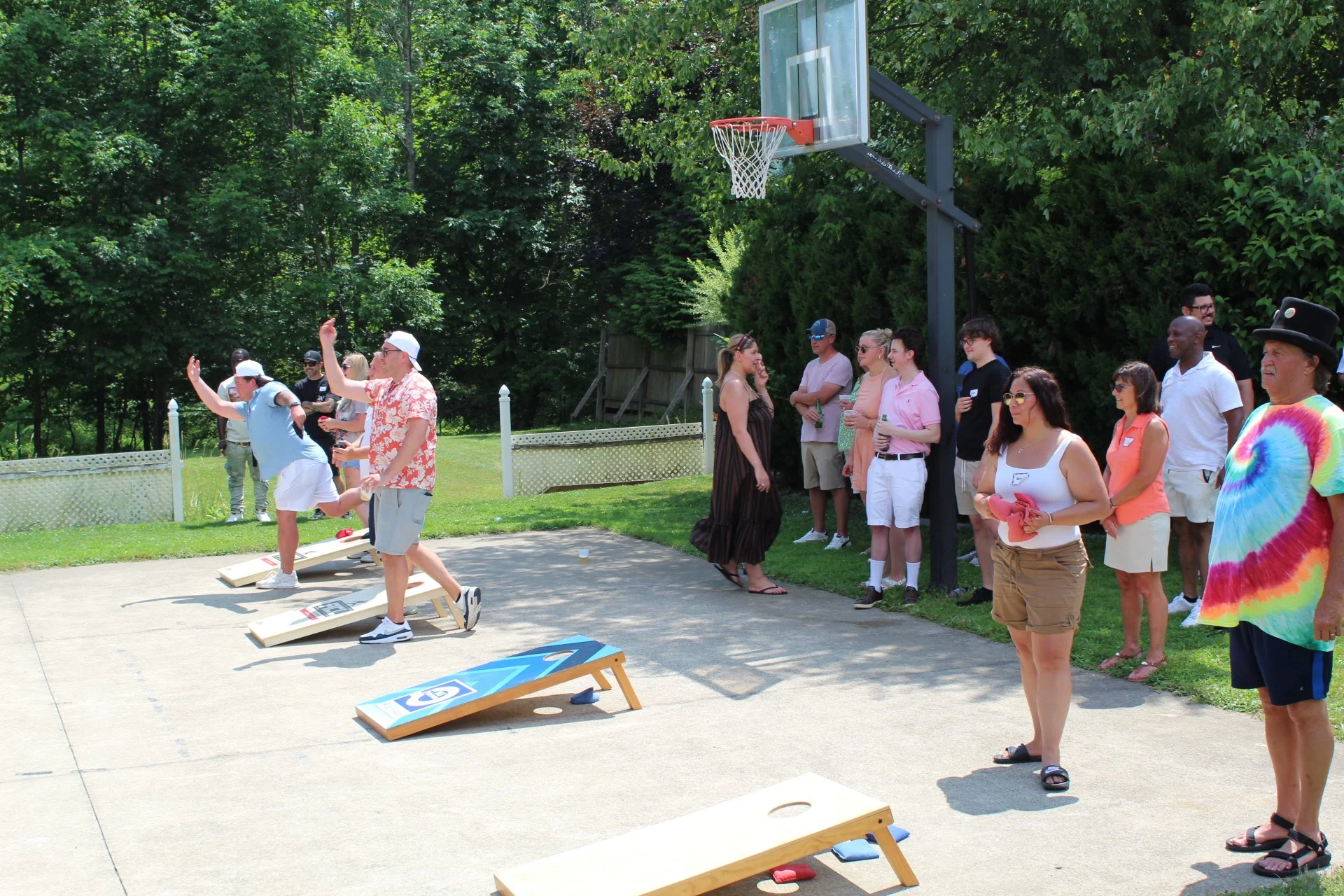 People gathered outdoors on a sunny day, playing cornhole, with some watching and others participating. There is a basketball hoop and green trees in the background.