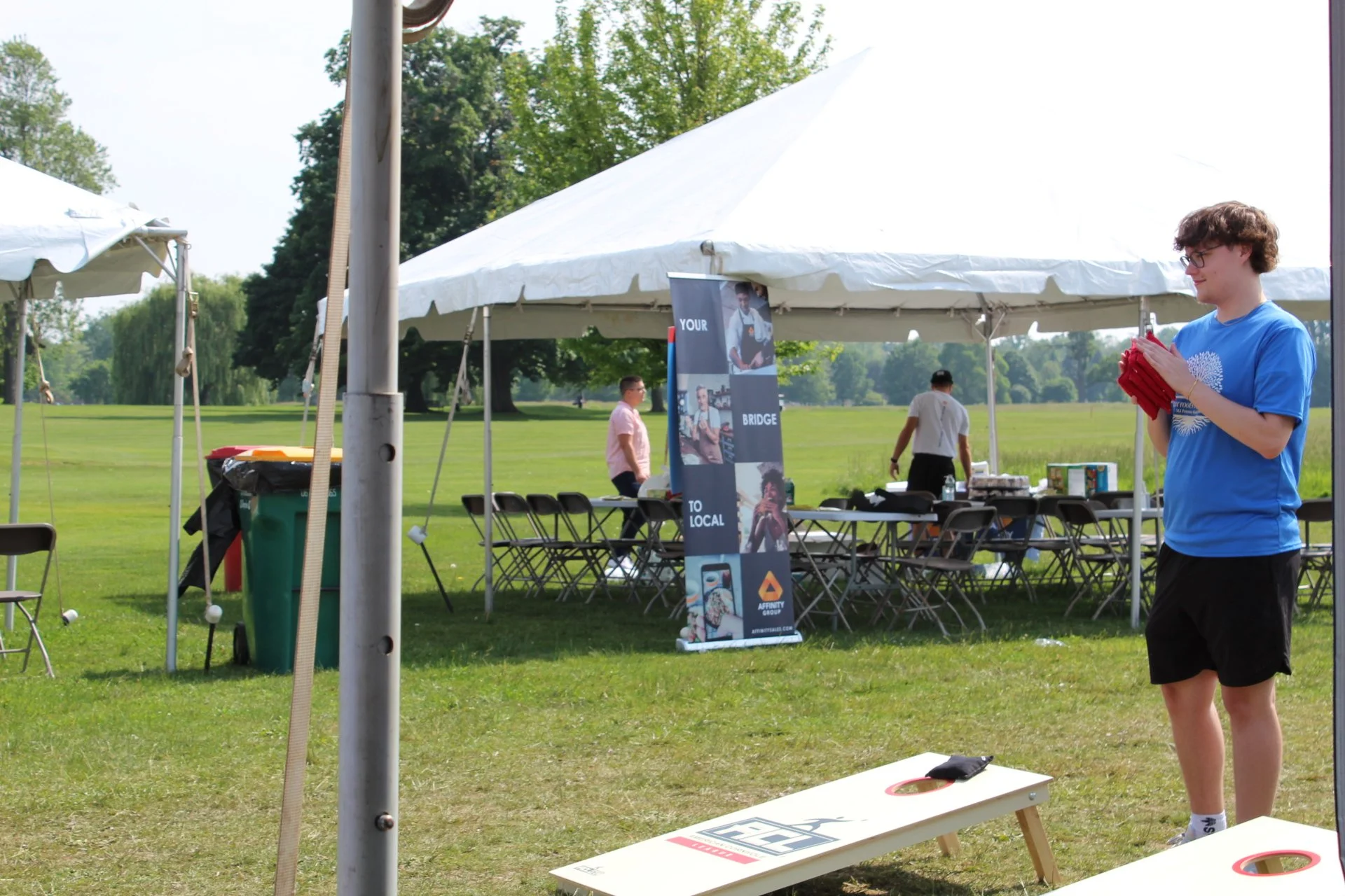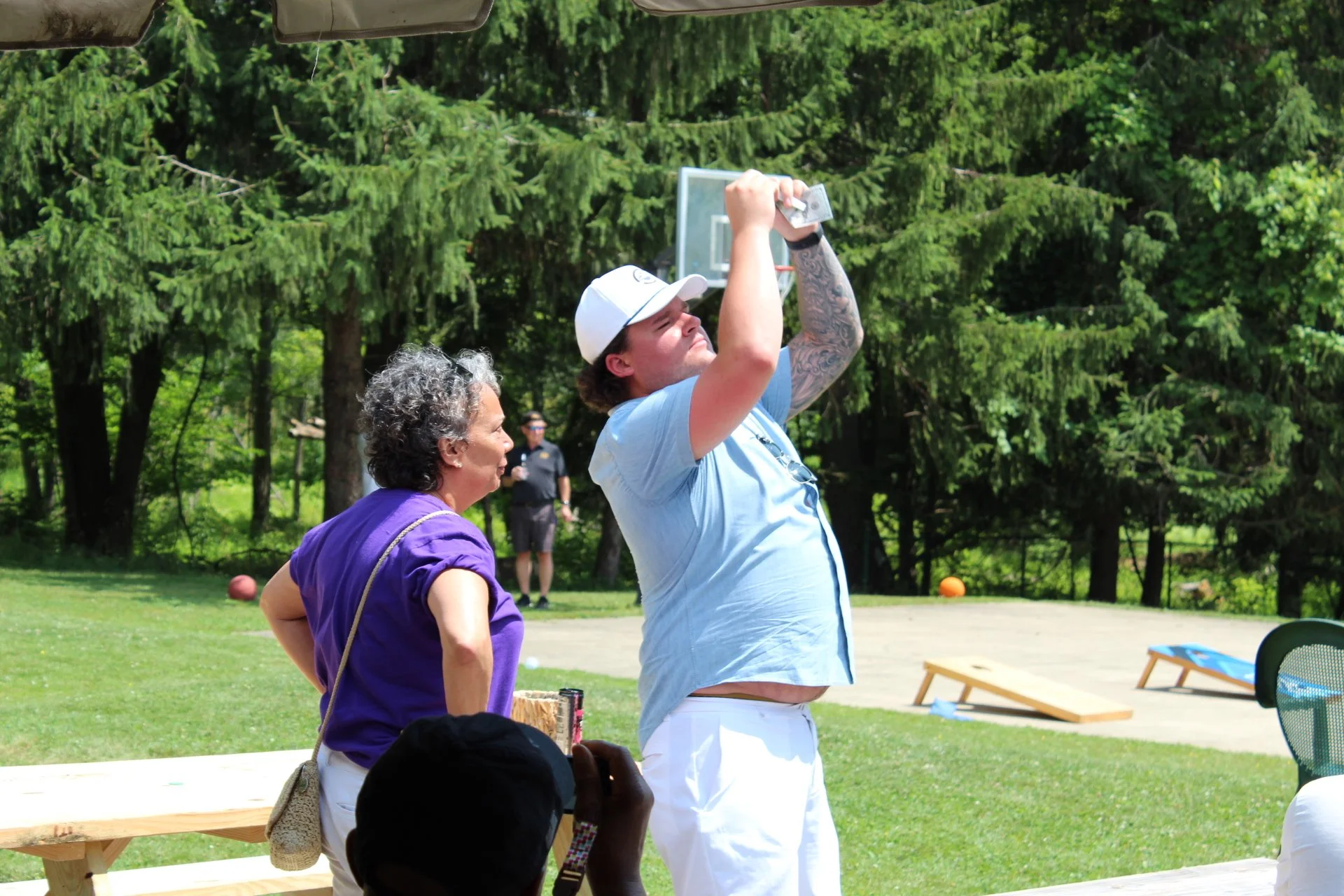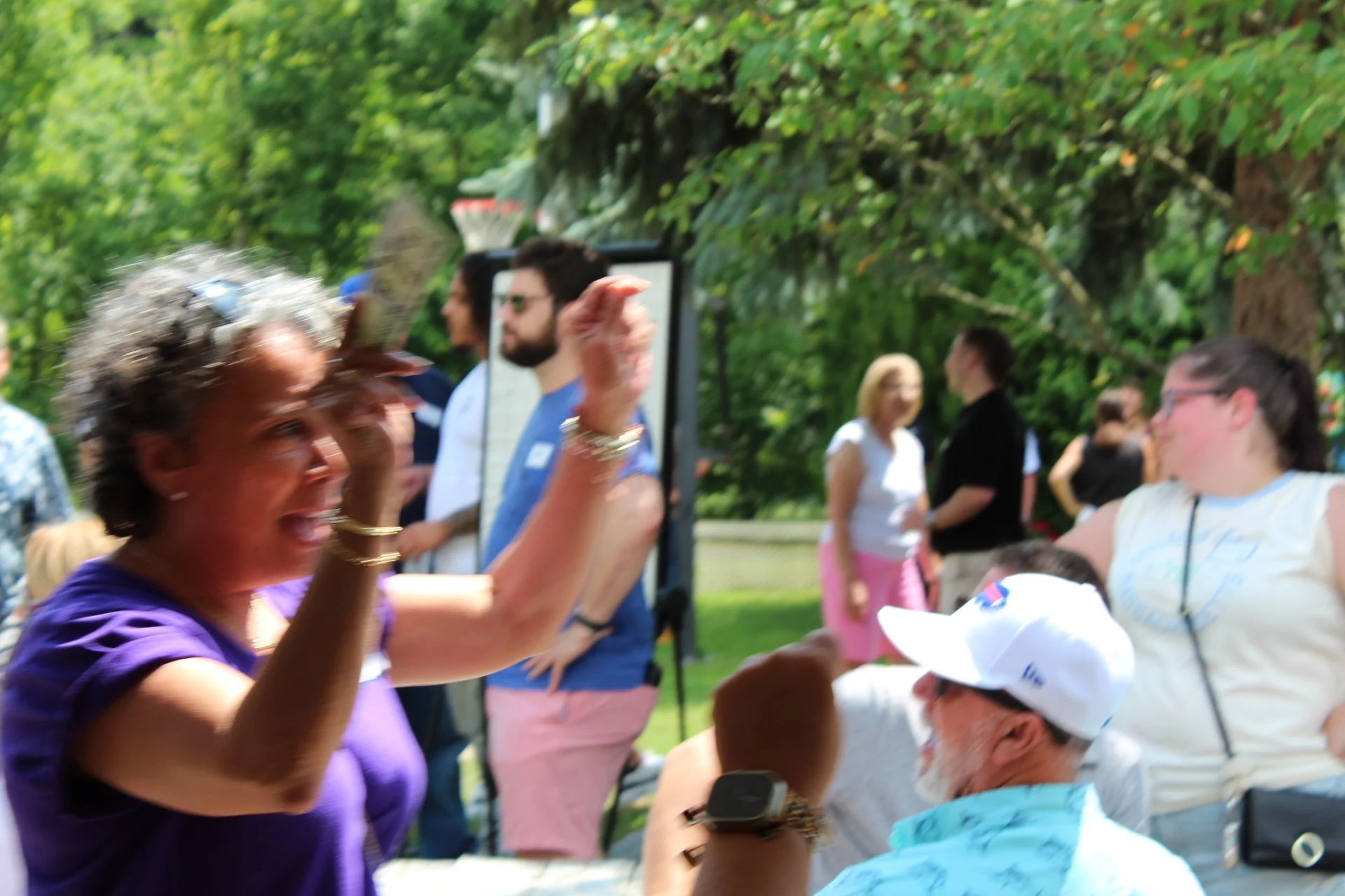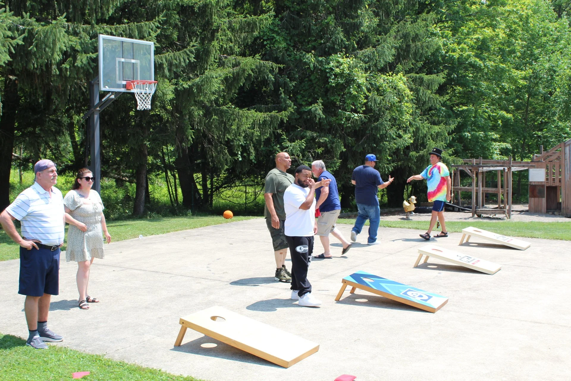 People gathered outdoors on a sunny day, playing cornhole, with some watching and others participating. There is a basketball hoop and green trees in the background.