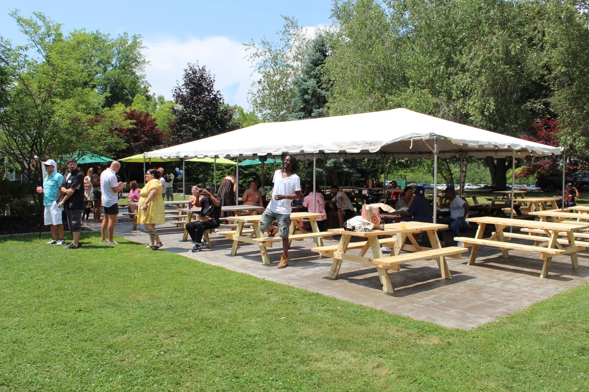 People gathered at a picnic area with wooden tables and a white canopy, surrounded by green trees and grass, on a sunny day.
