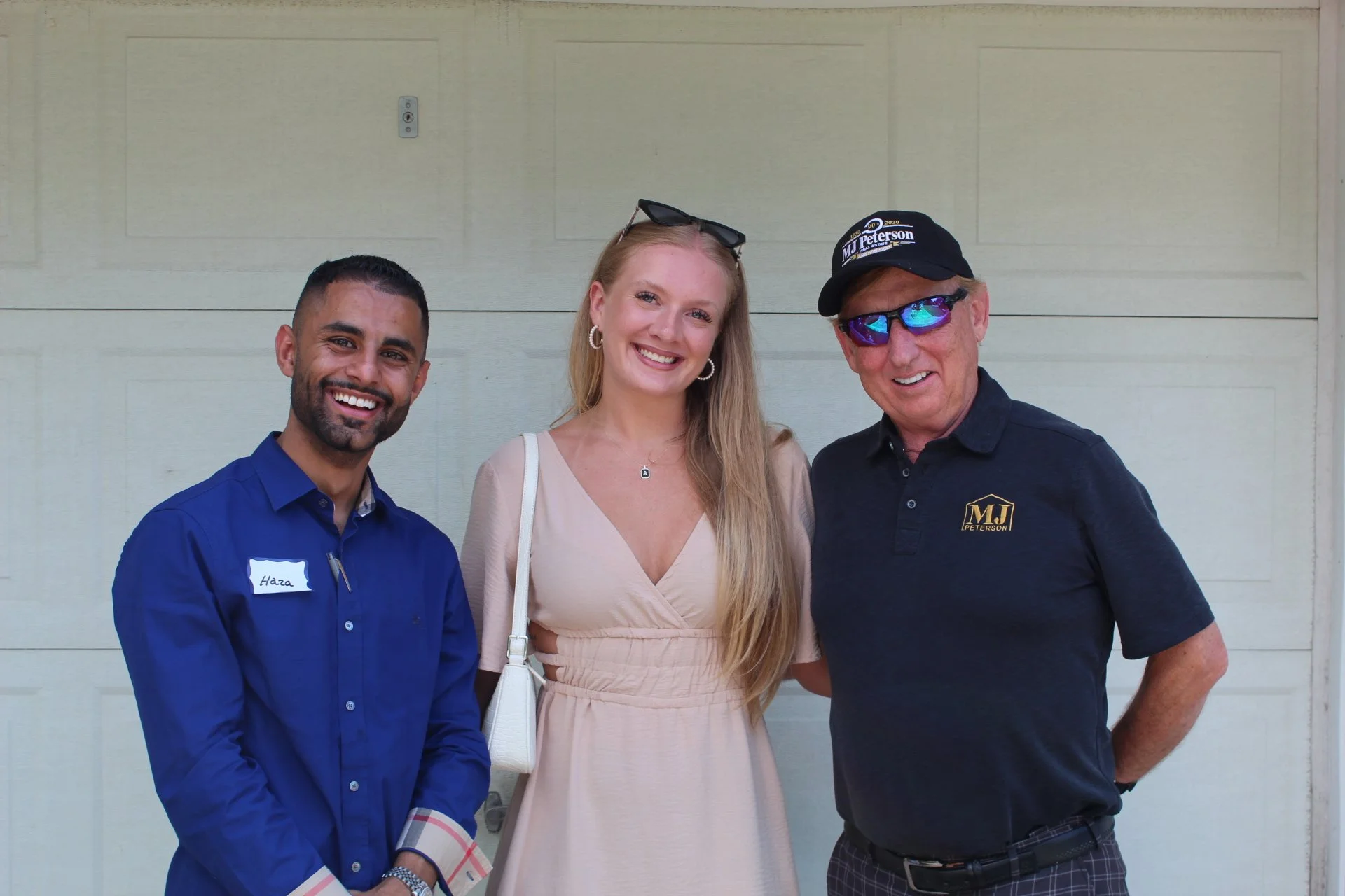 Three people standing in front of a garage door, smiling at the camera. The person on the left is a man with a beard wearing a blue shirt with a name tag that says 'Haza.' The person in the middle is a woman with long blonde hair, wearing a beige dre
