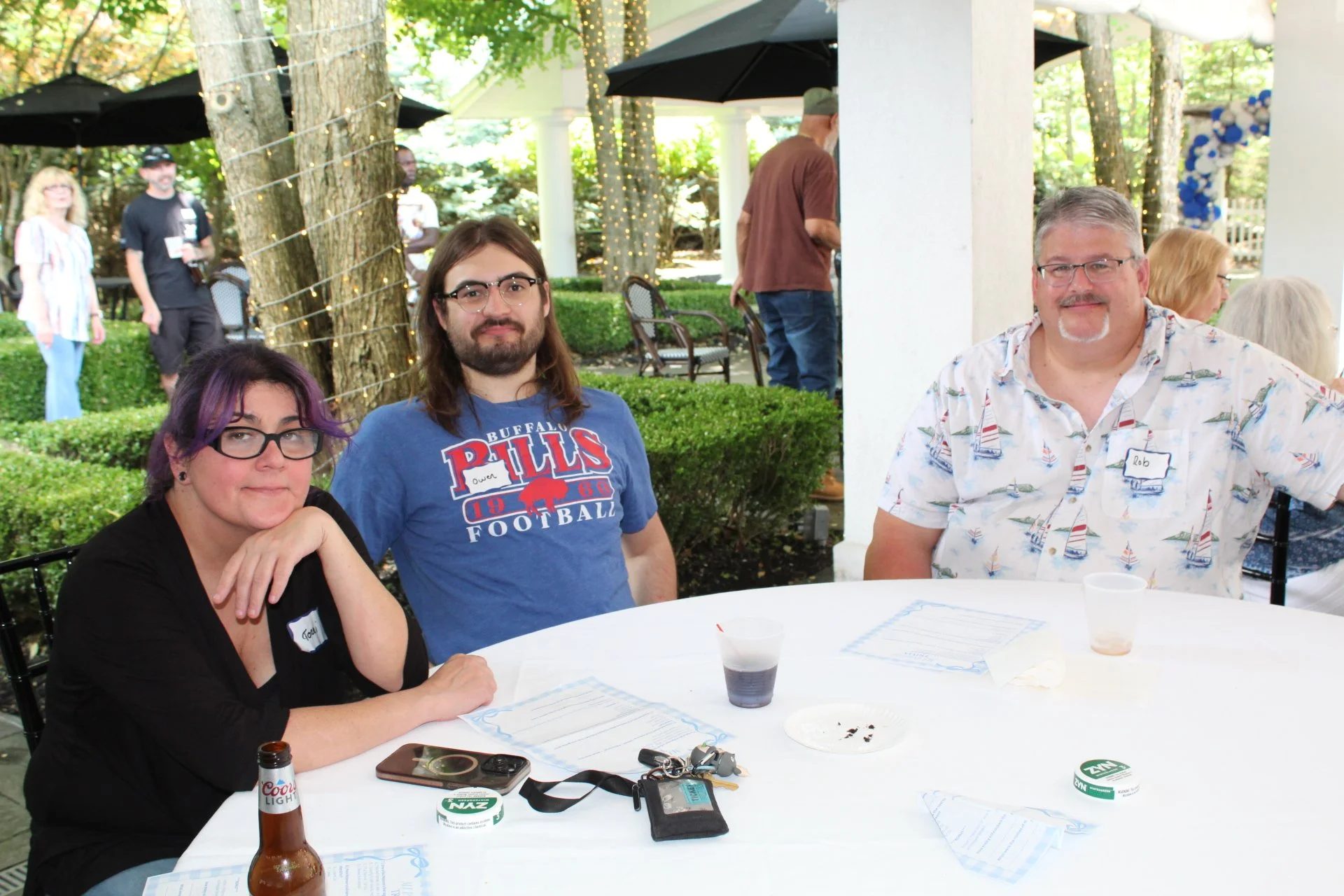 Three people sitting at a round table outdoors. The woman on the left has purple hair, glasses, and a black shirt. The man in the middle has long brown hair, glasses, and a blue football-themed t-shirt. The man on the right has gray hair, a mustache,