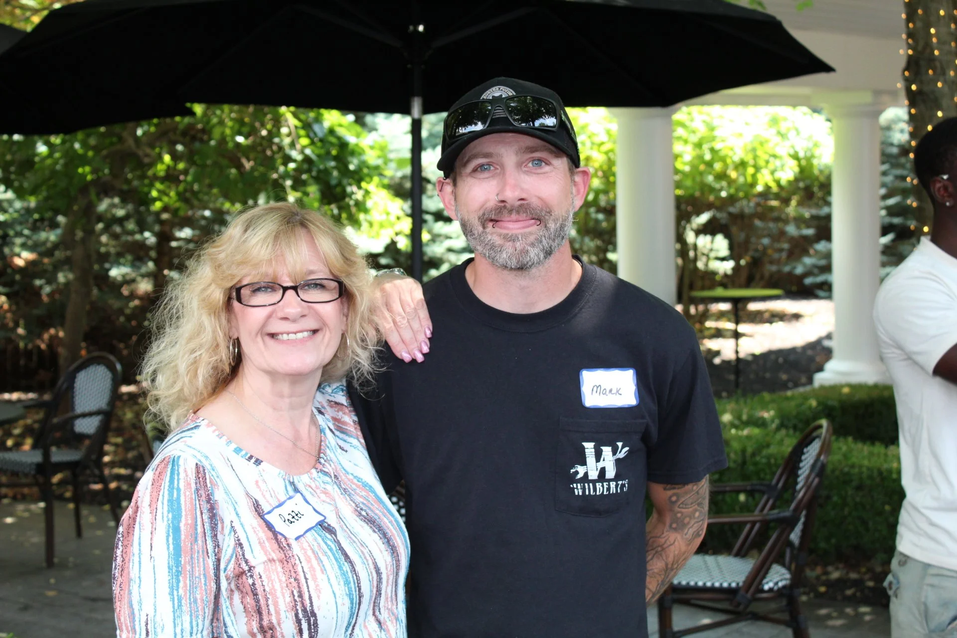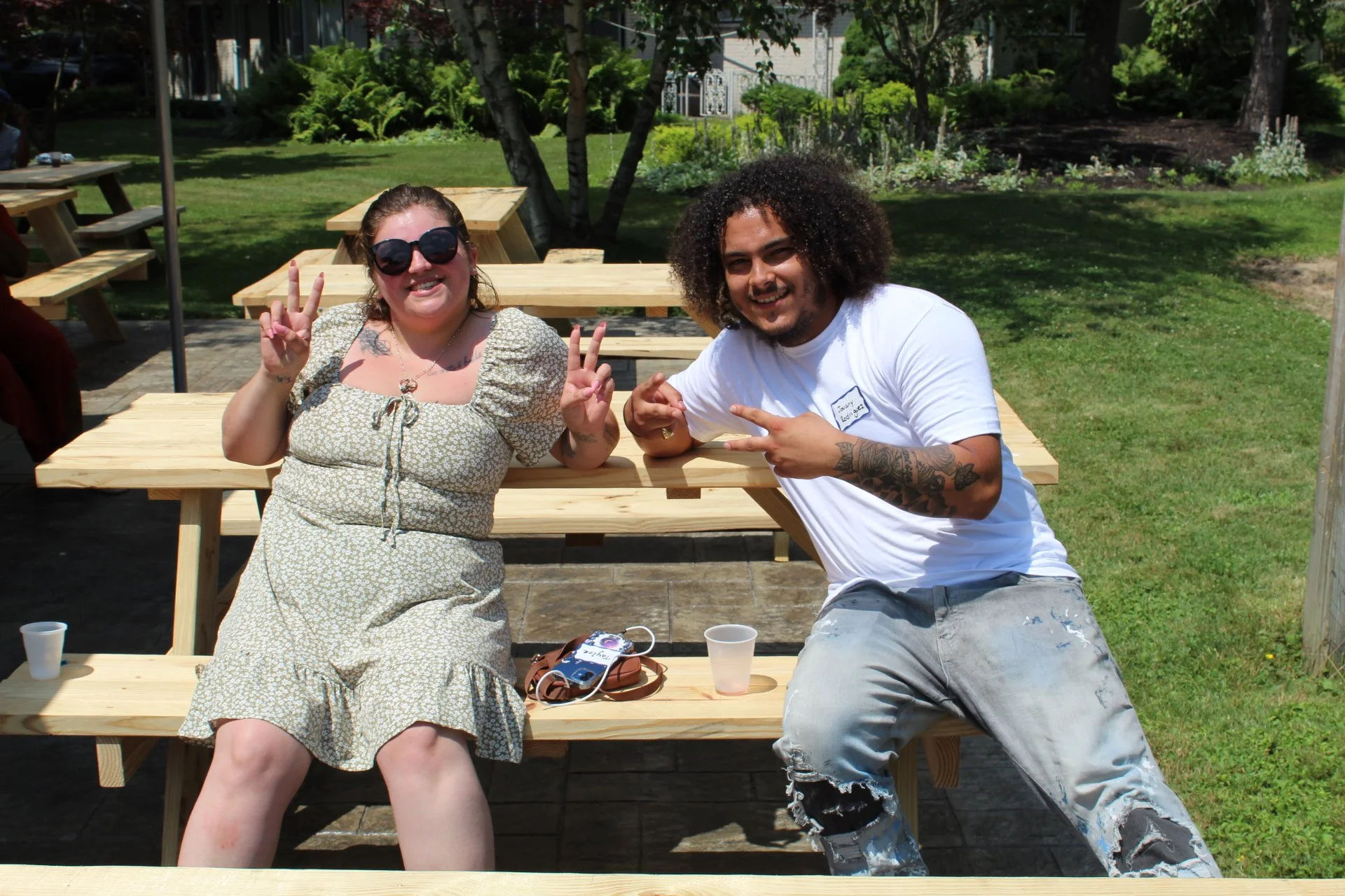 Two people smiling and embracing at a social gathering, sitting at a round table with a white tablecloth, with other attendees mingling in the background under a covered outdoor area.