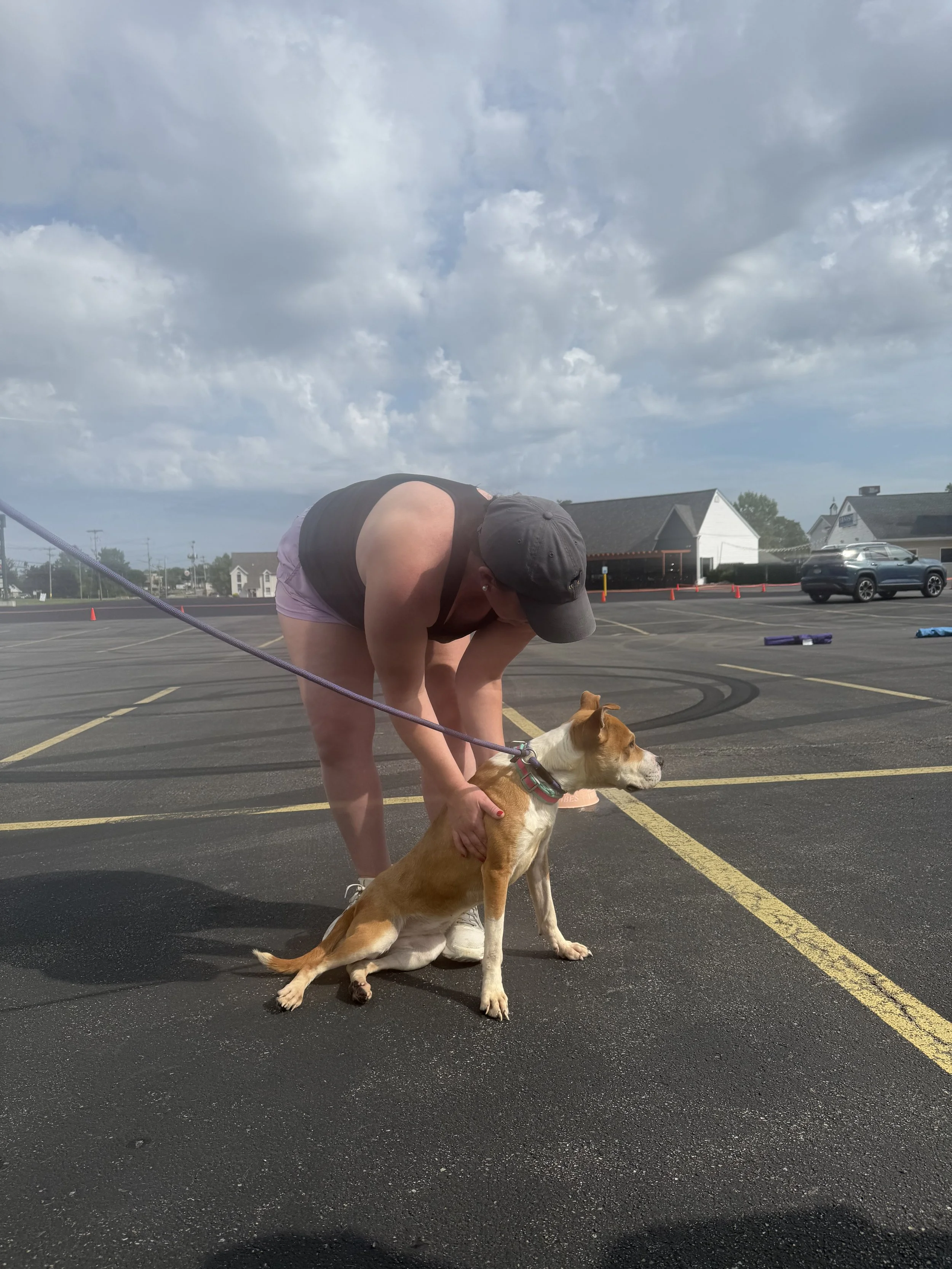 Young woman smiling, wearing a peach dress, holding a smartphone and a drink, with a name tag that reads 'Cait,' at an outdoor celebration or gathering.