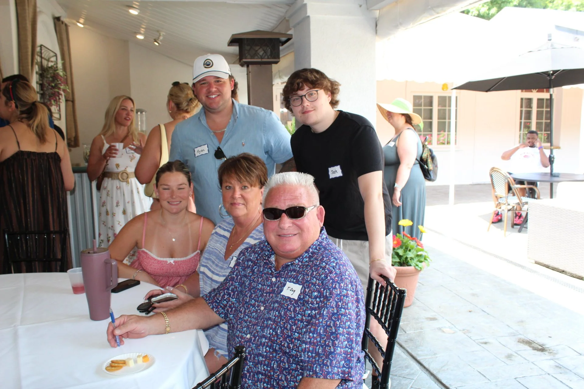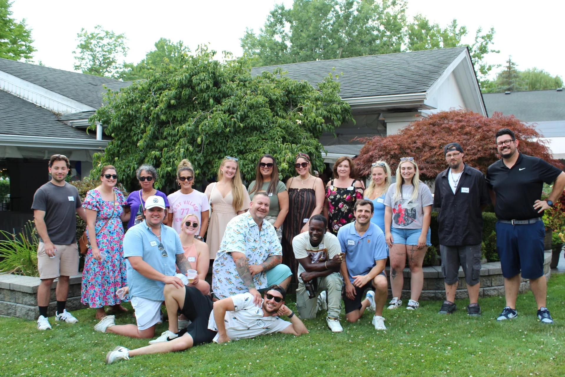 Group of people gathered around a table at an outdoor company picnic in 2025, with some standing and others sitting, smiling and posing for the photo.