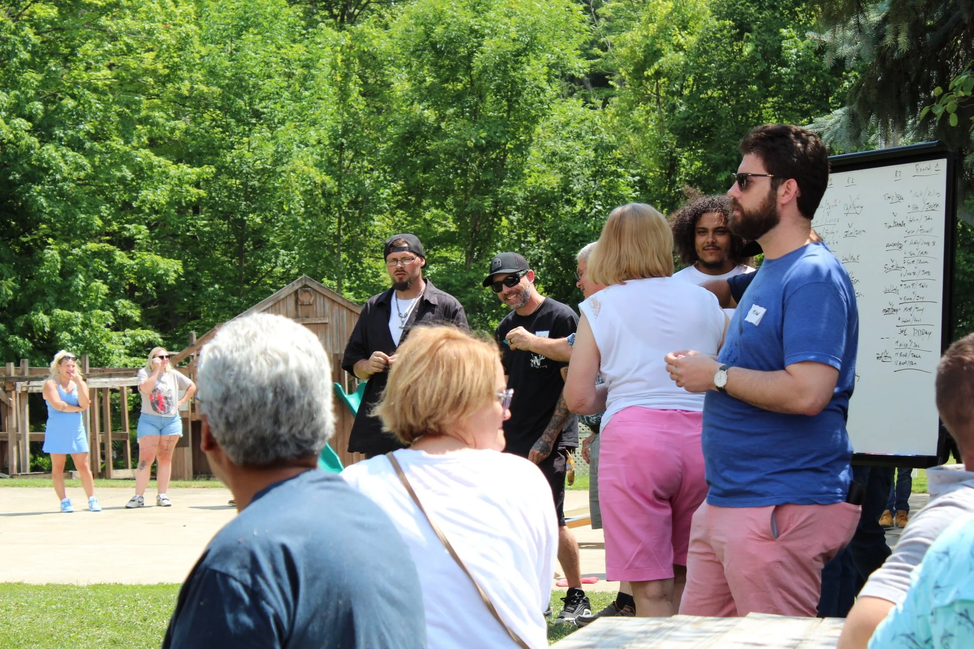 Group of people gathered outdoors for a meeting or event, with some standing near a whiteboard filled with notes, on a sunny day with green trees in the background.
