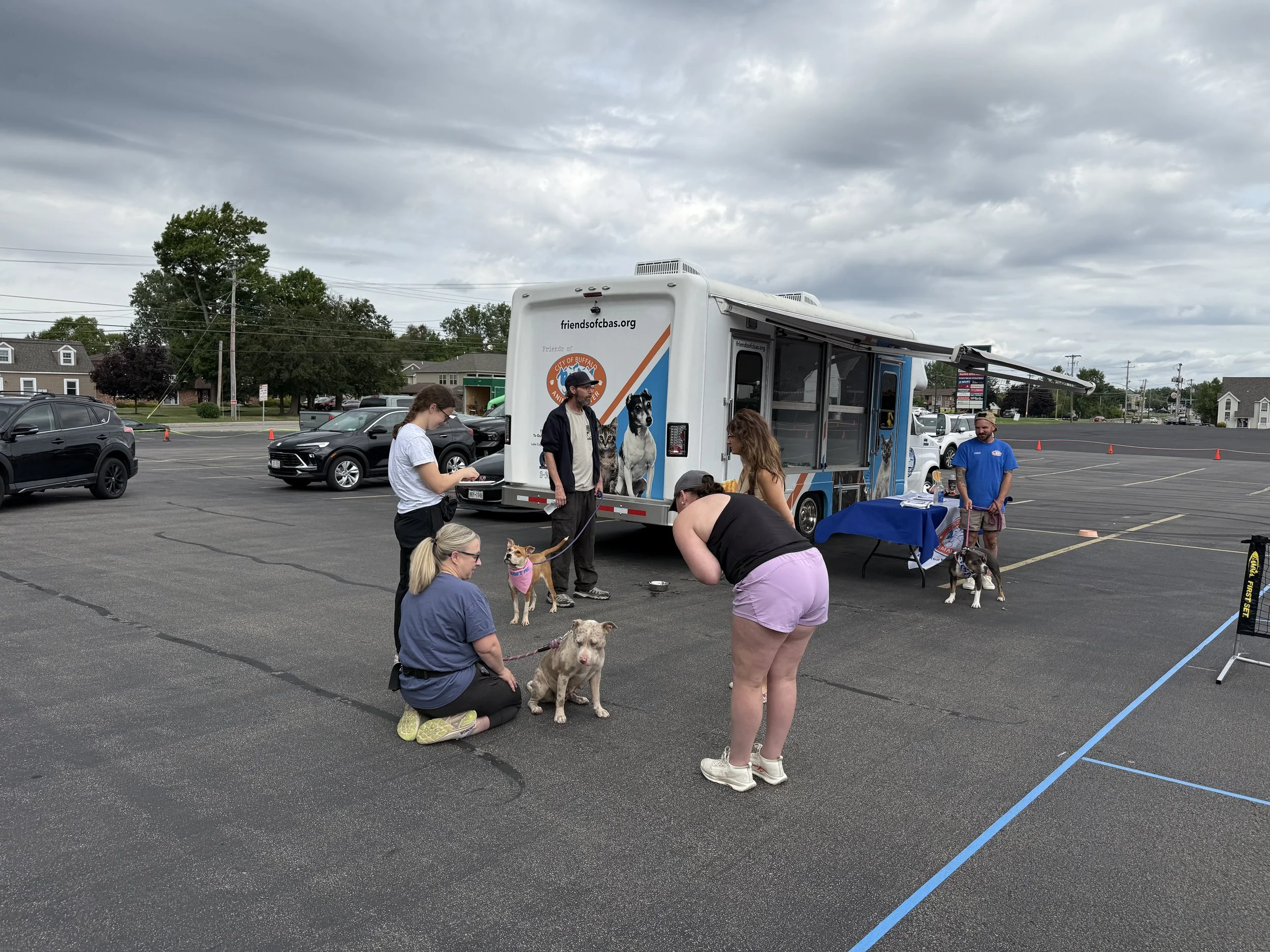 Group of women at a table outdoors at a social event, with some women talking and smiling, and others standing nearby, engaging in conversation. The table has informational materials, cups, and pens.