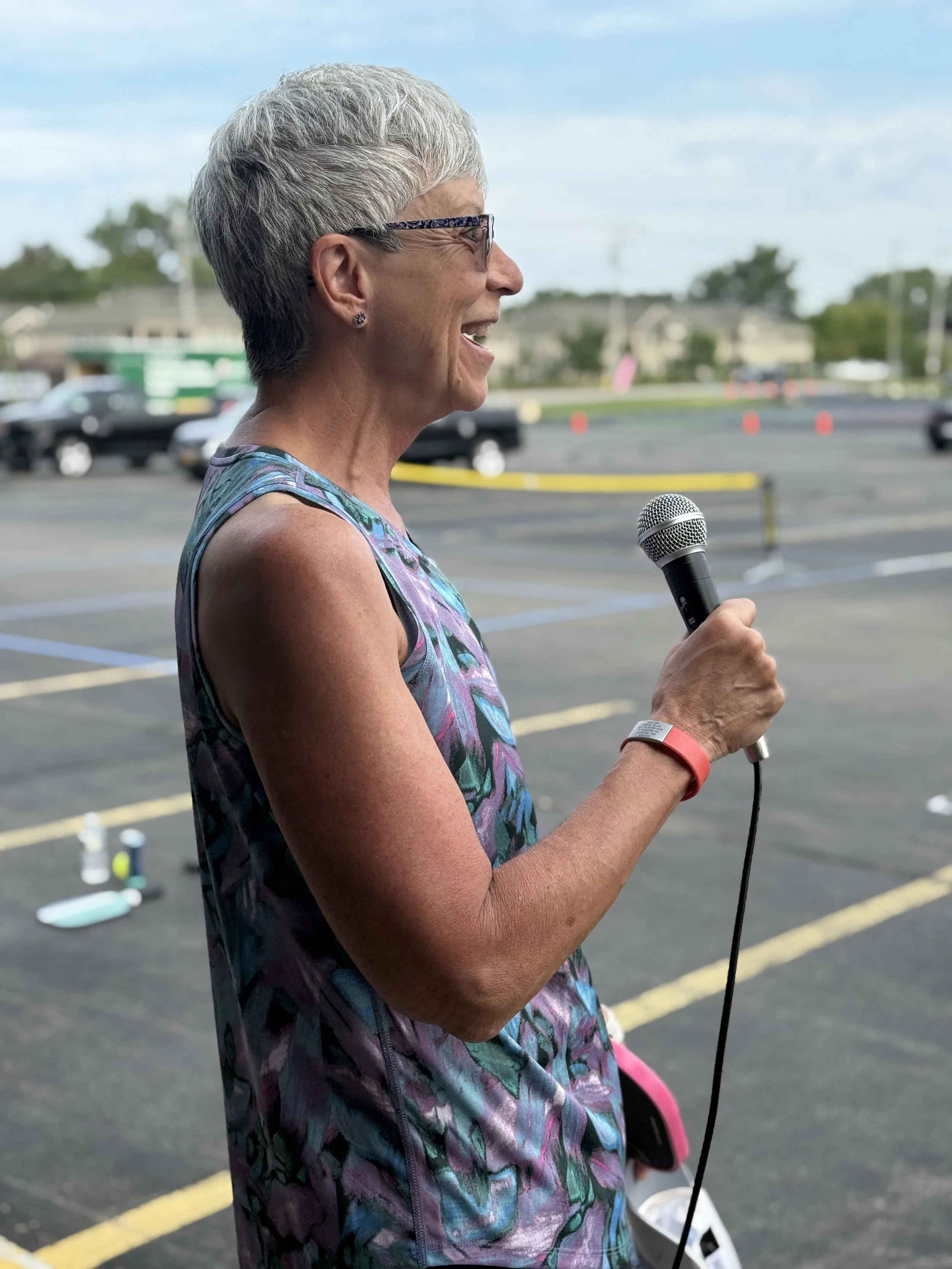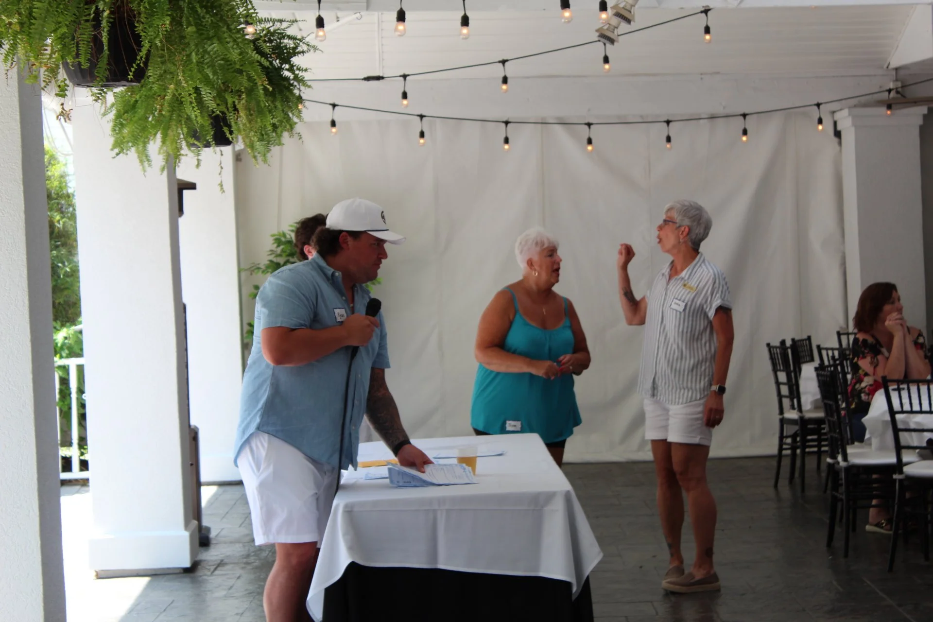 People at an outdoor event, with one man speaking into a microphone and two women standing near a table under a patio umbrella.