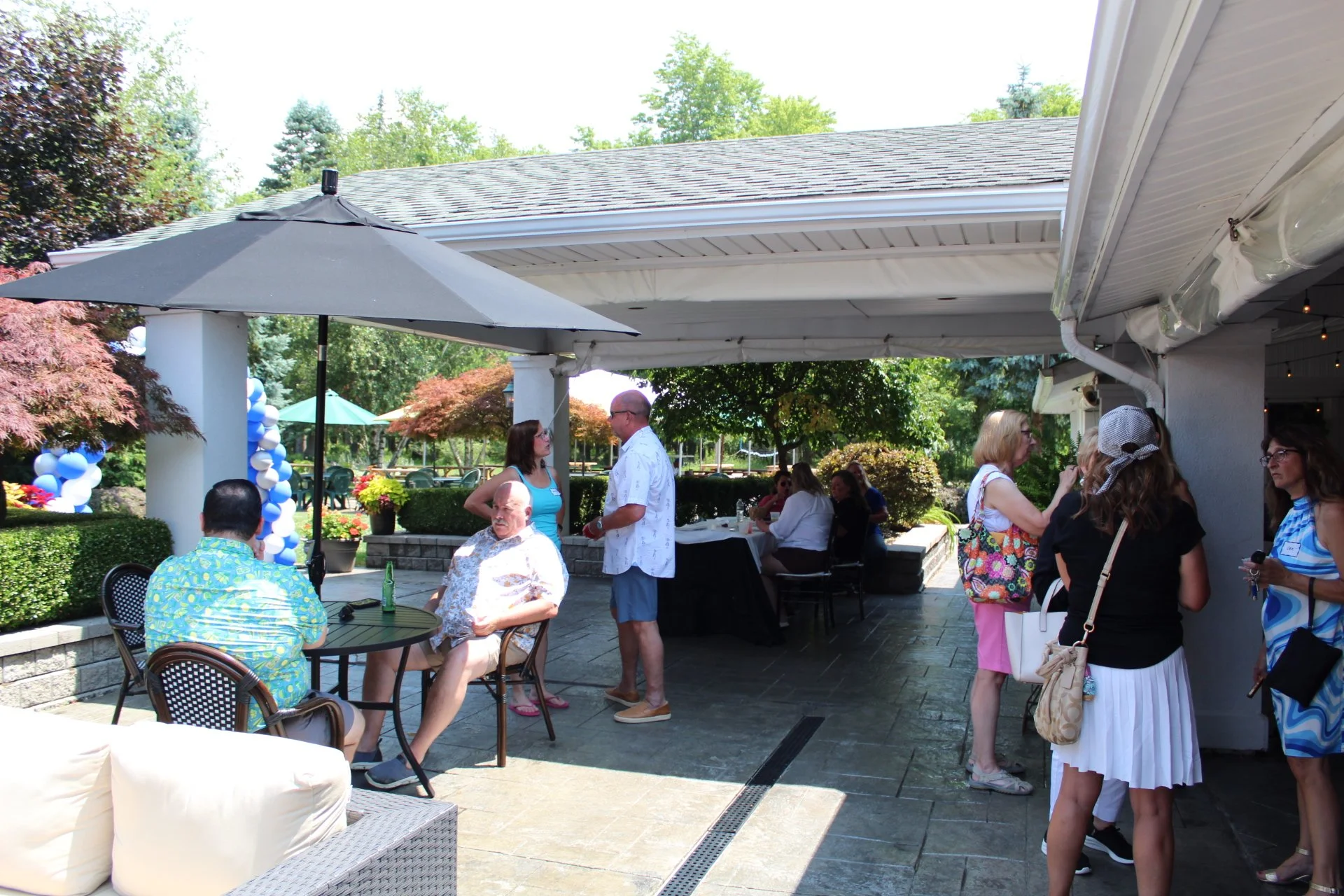 People socializing at an outdoor gathering under a covered patio with trees and balloons in the background