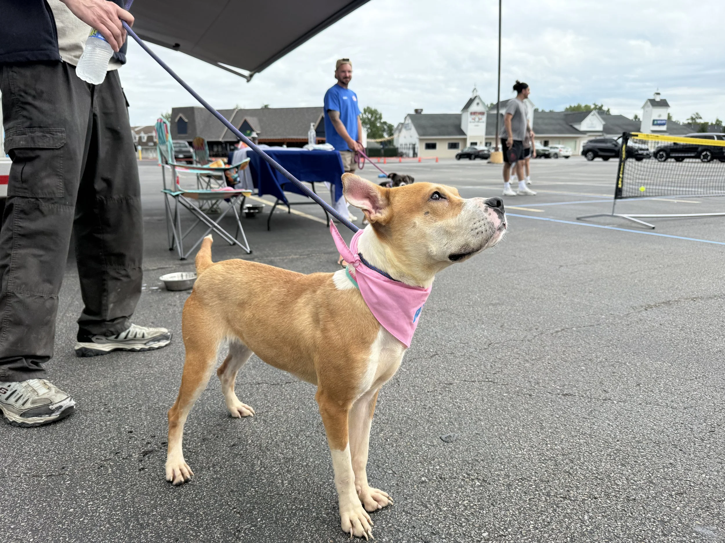 A smiling woman wearing glasses, a pink T-shirt with a name tag that says 'Denise', a pink cap, holding a plastic cup, standing outdoors near trees, with a white gazebo and patio furniture in the background.
