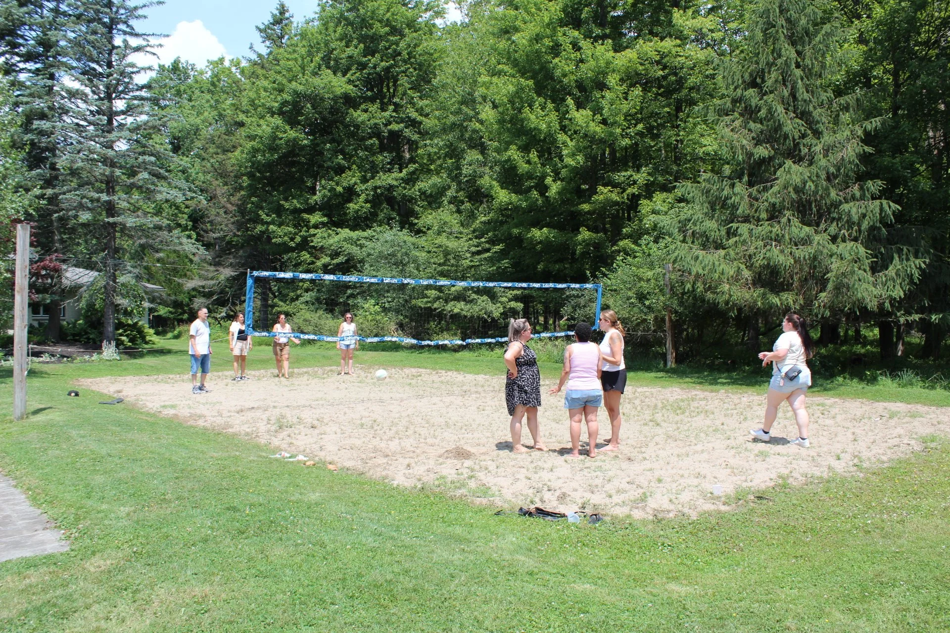 Group of people playing volleyball on a sunny day in a backyard with green trees in the background.