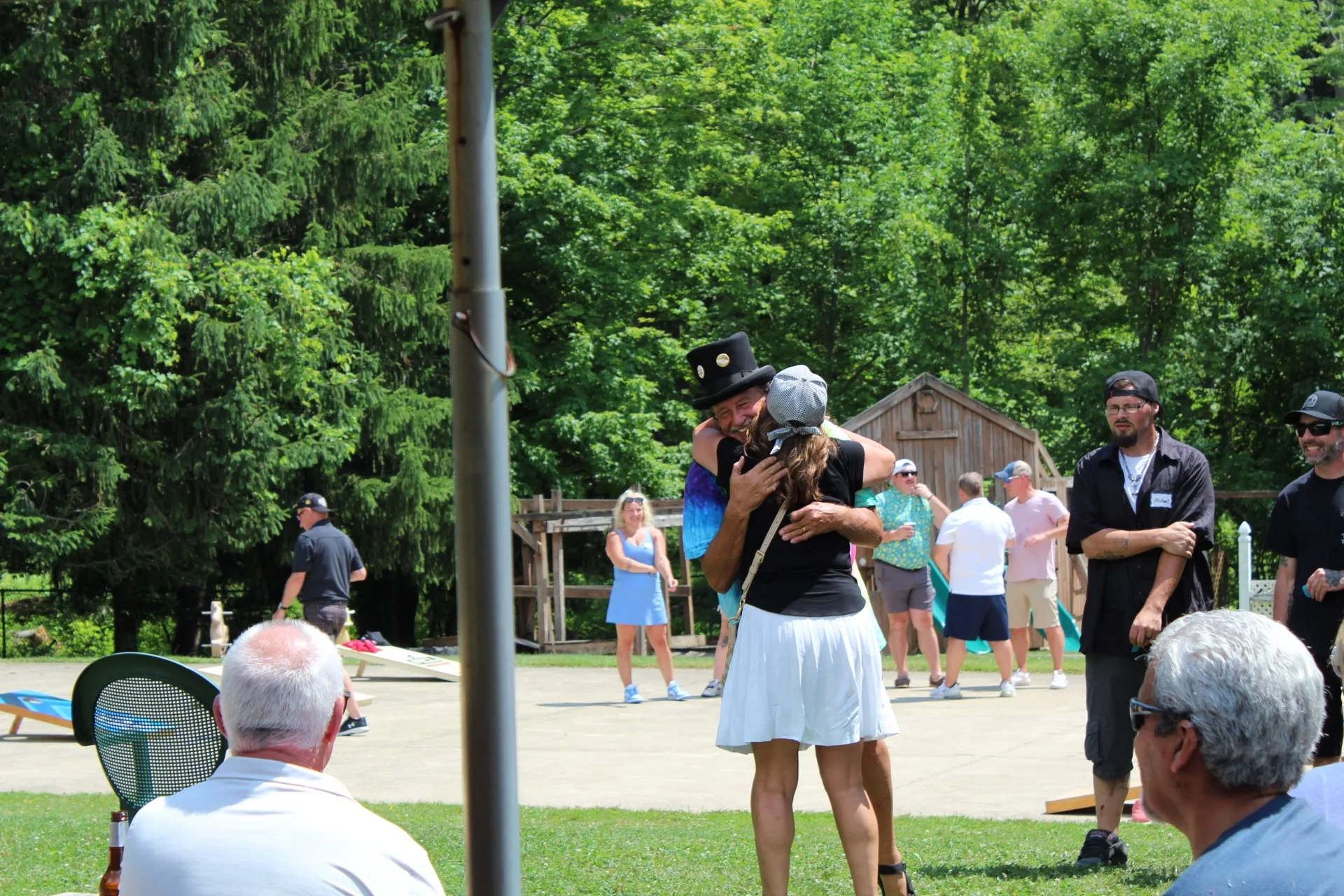 A group of people at an outdoor gathering, with one man hugging a woman, wearing a black top hat, while others look on or engage in activities, surrounded by lush green trees.