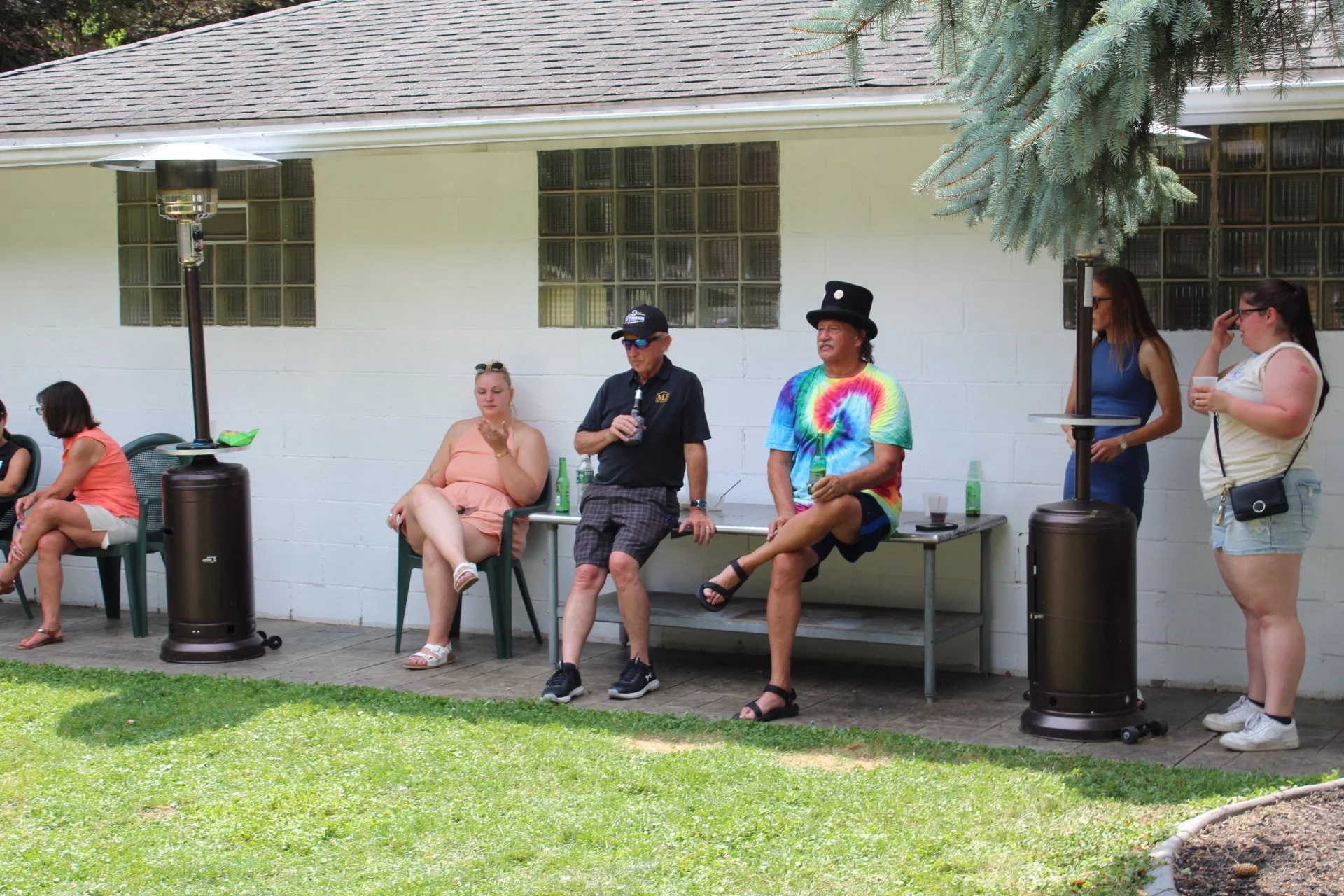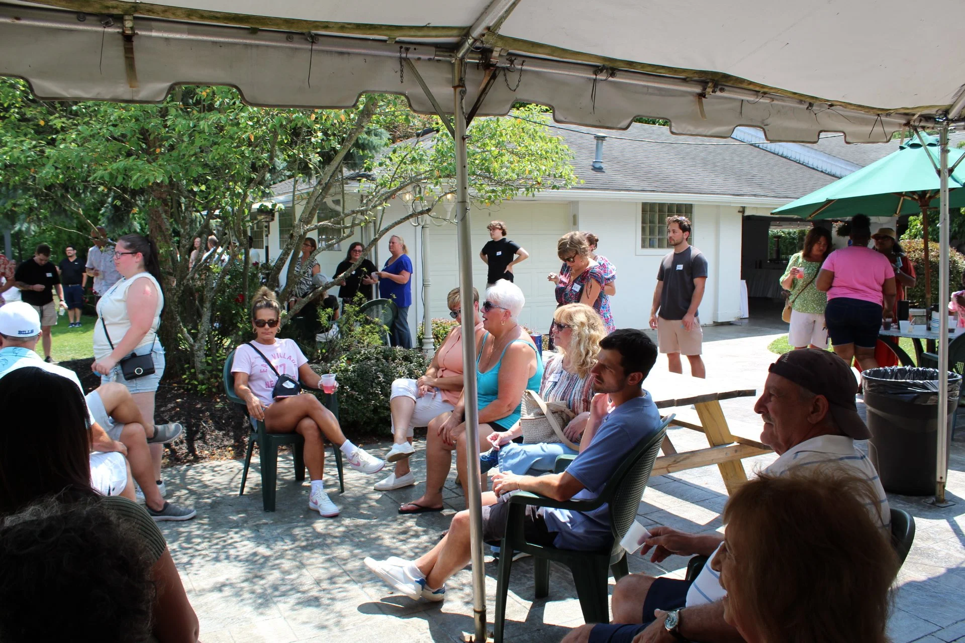 People gathered around a table at an outdoor event, engaging in conversation with a gazebo and outdoor furniture in the background.