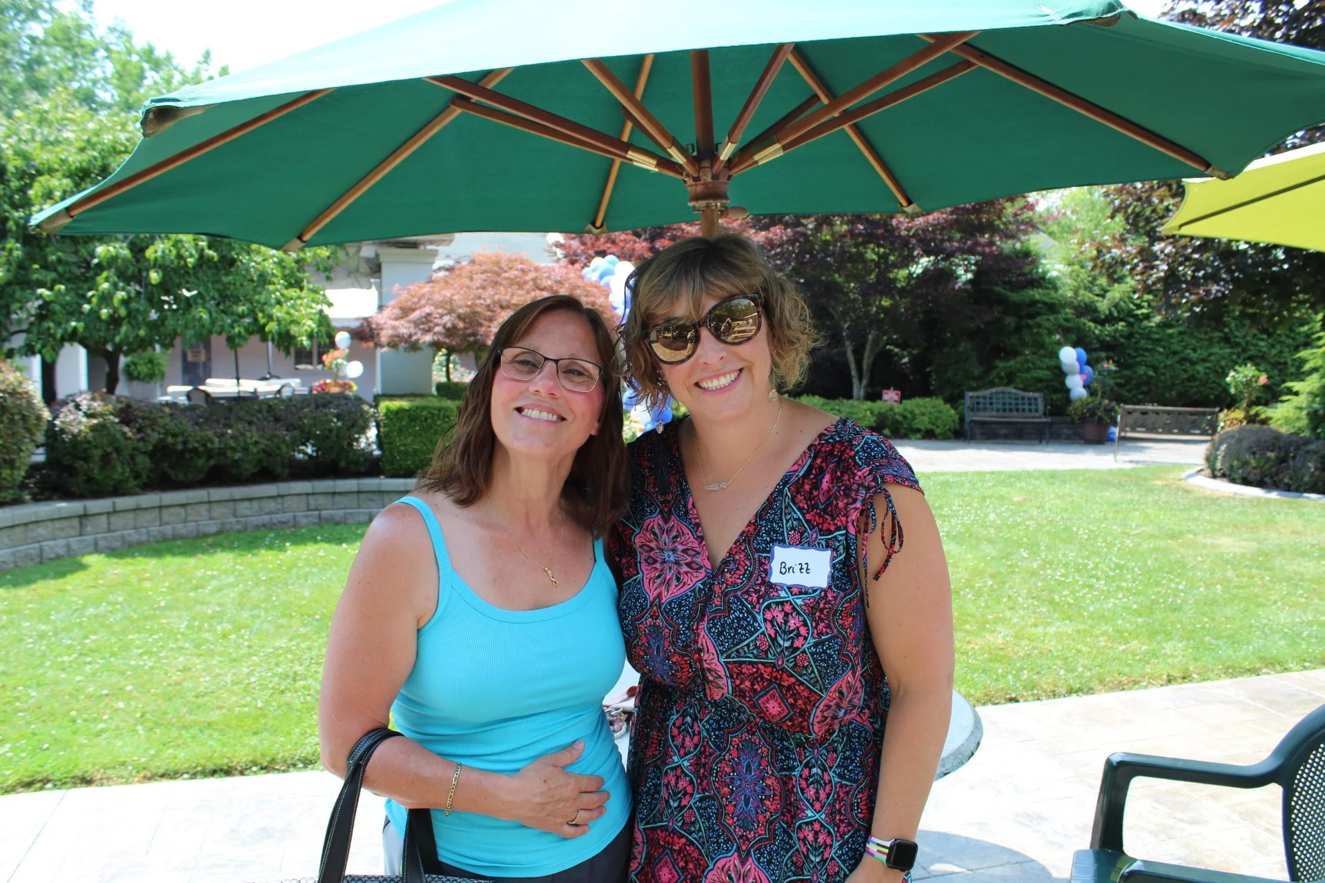Two smiling women stand under a green patio umbrella outdoors during a sunny day. One woman wears a blue sleeveless top with glasses, and the other woman wears sunglasses and a patterned dress. She has a name tag that reads 'Brizz'.