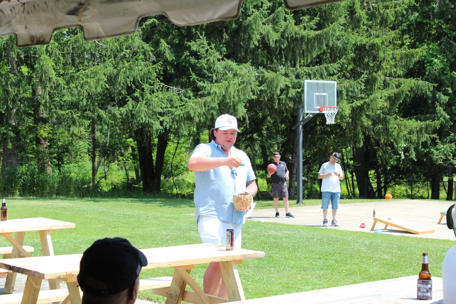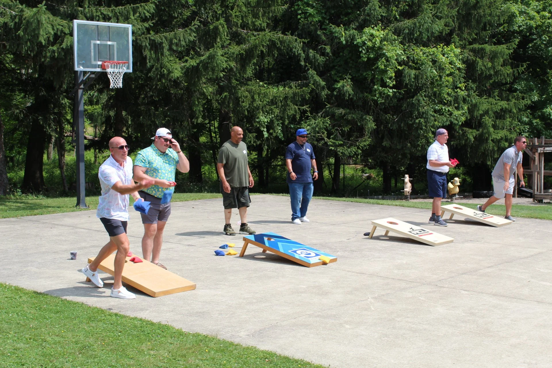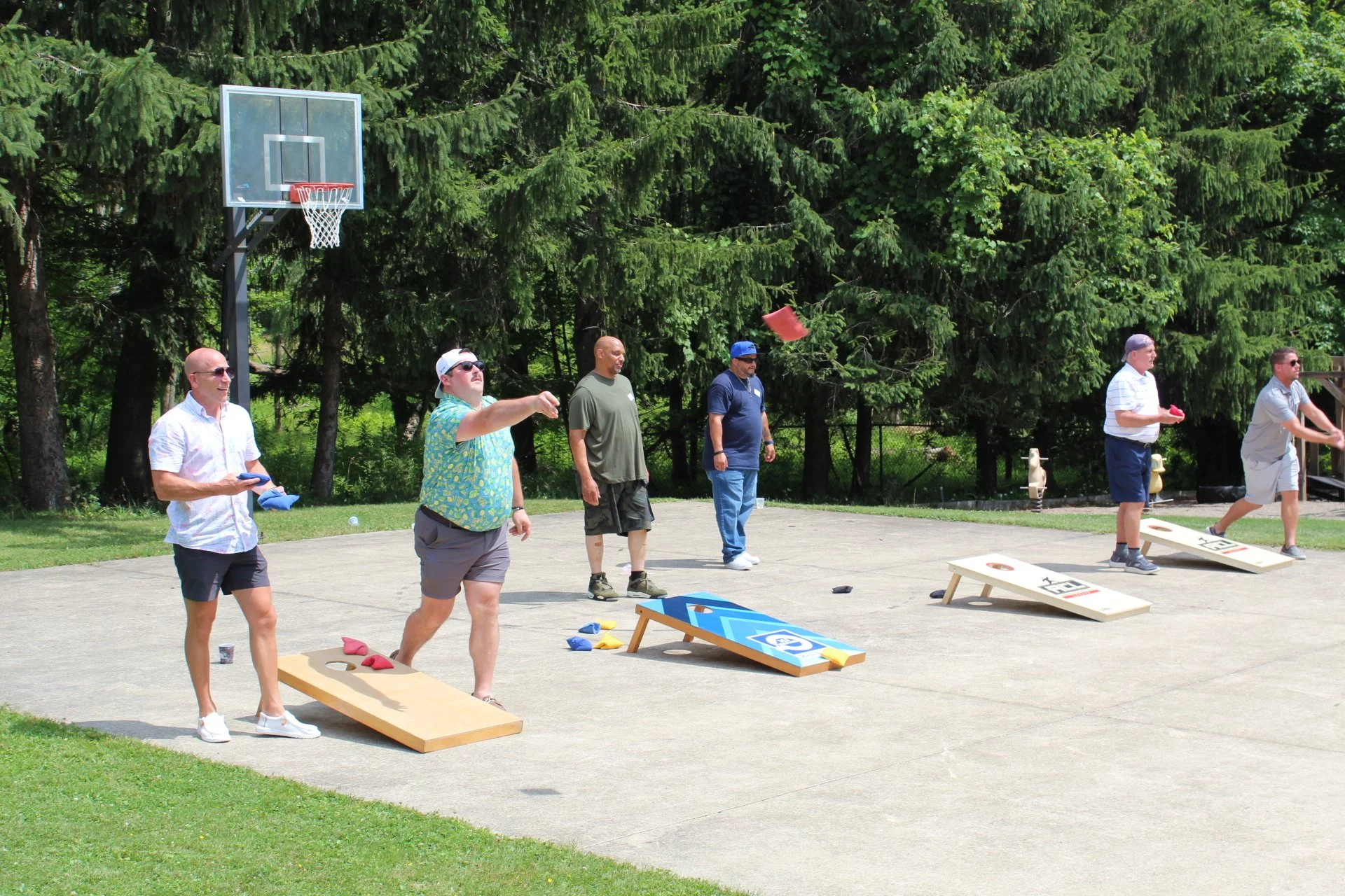 Group of six men playing cornhole on an outdoor court with a basketball hoop, surrounded by green trees