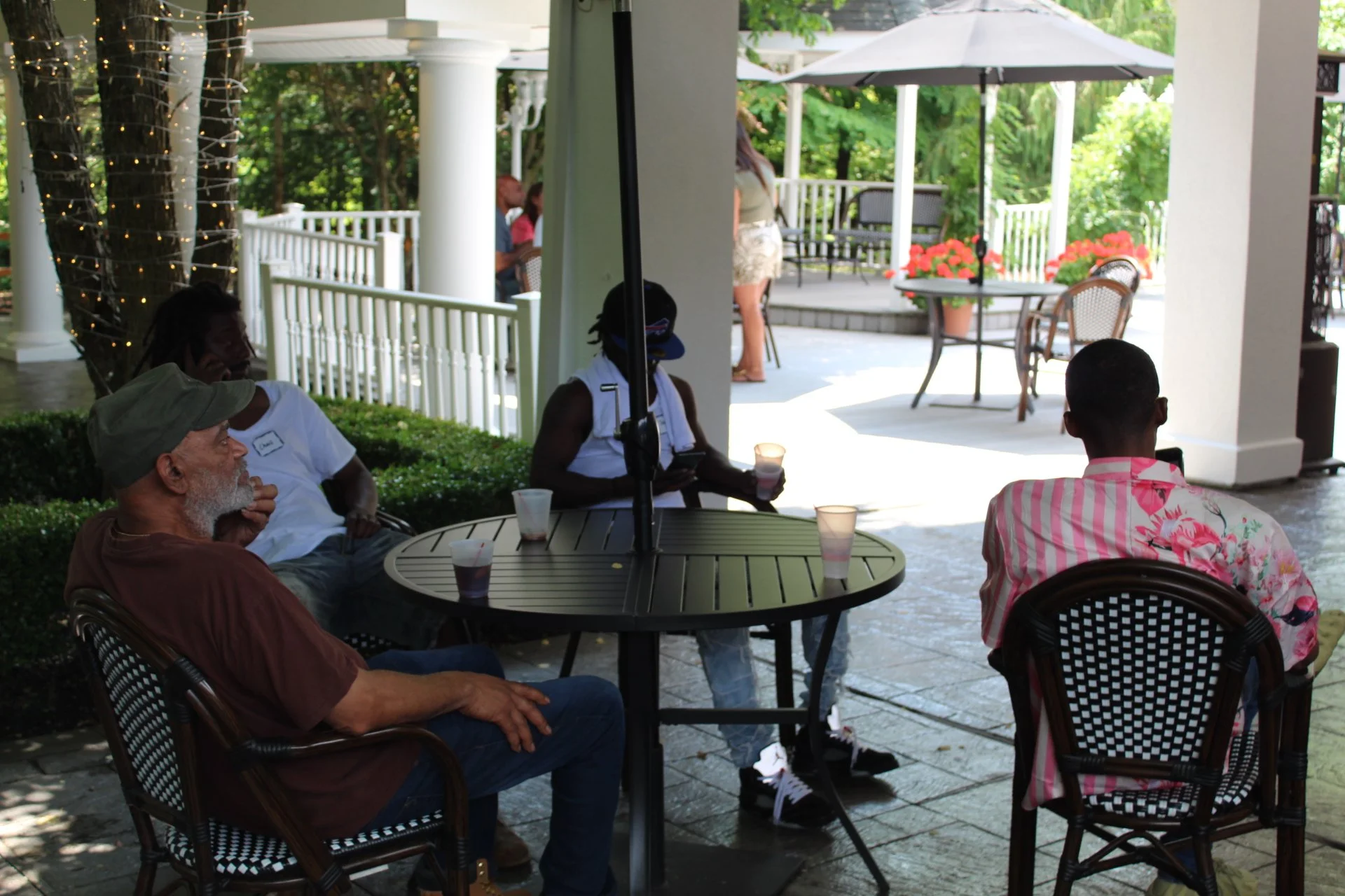 People sitting and chatting around a table at an outdoor patio with trees and flowers in the background.