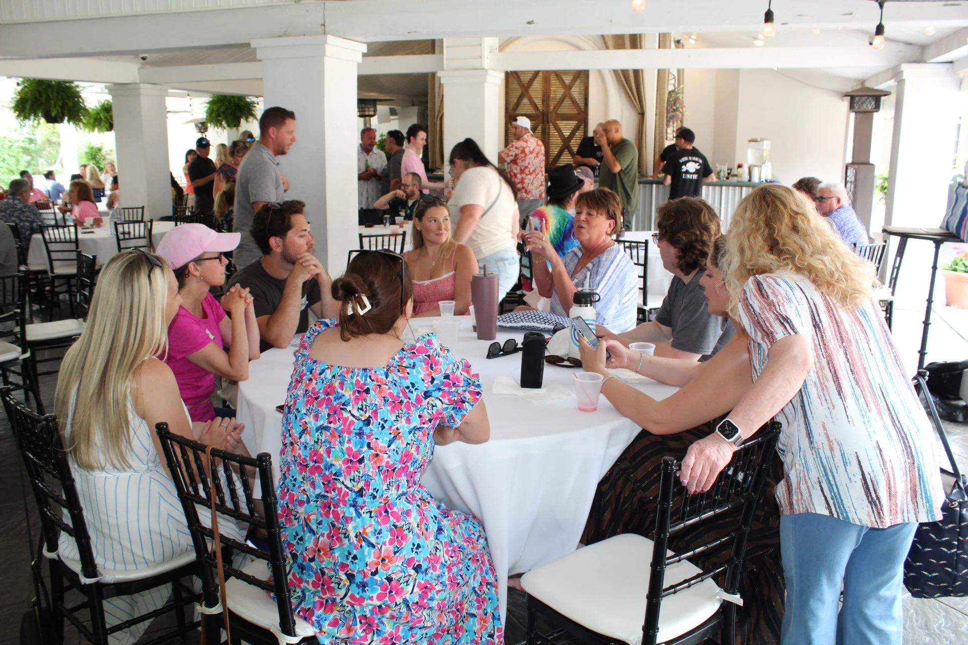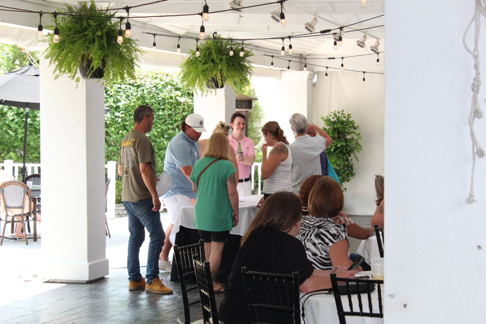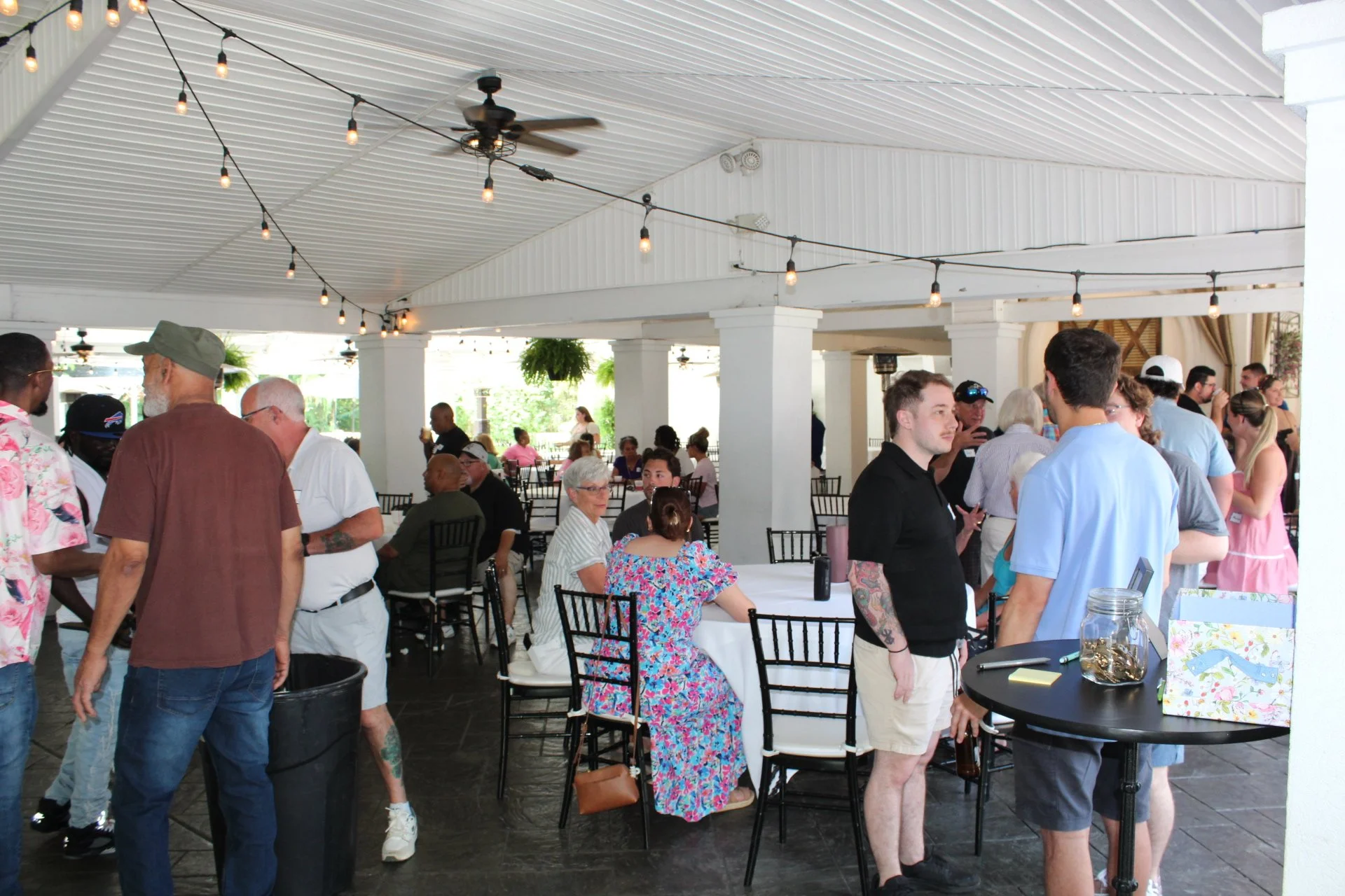 People gathered at a social event in an outdoor covered patio with string lights and ceiling fans, sitting and standing around tables and chatting.
