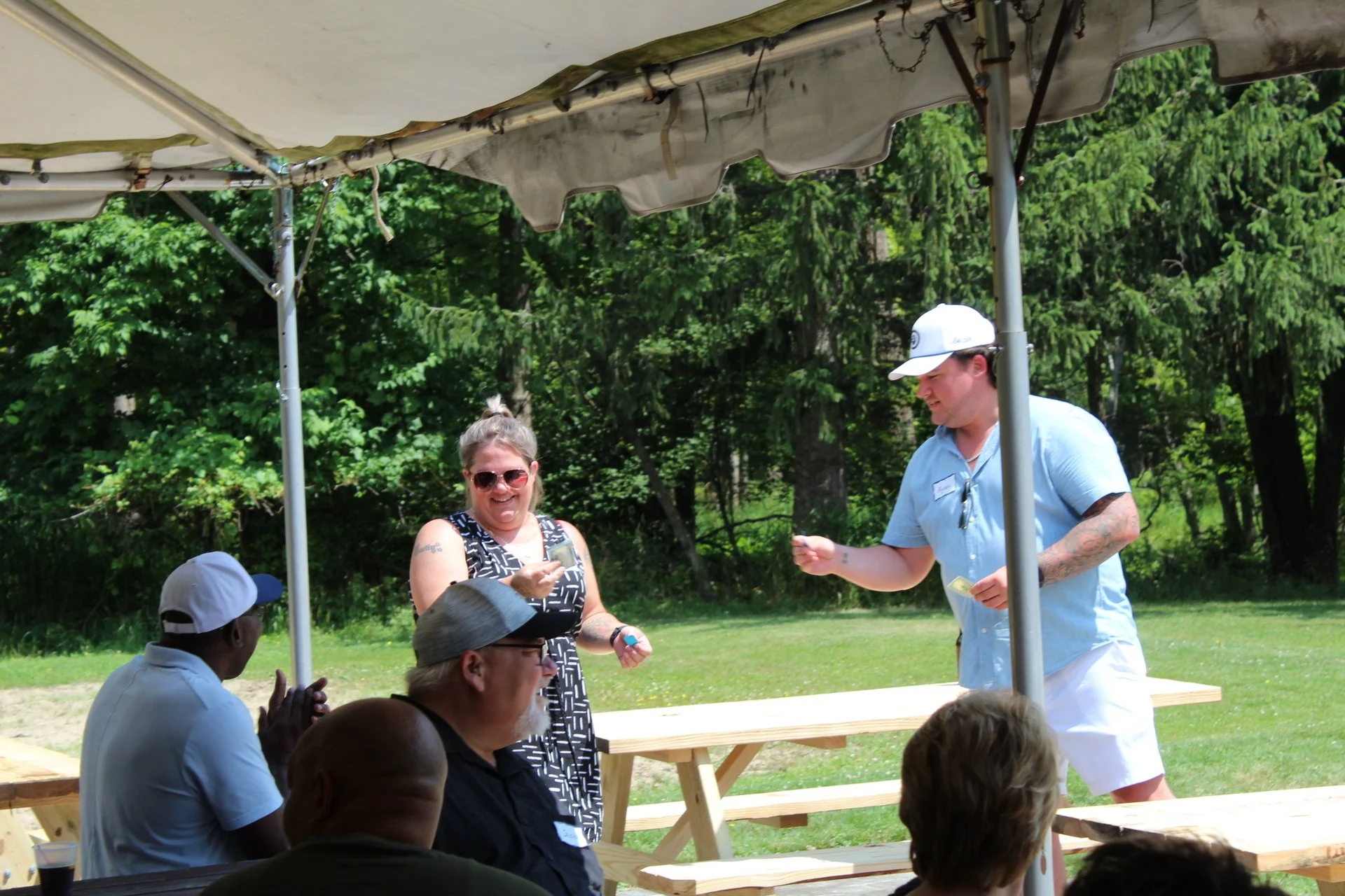 People outdoors under a canopy, with one woman smiling and holding a mobile phone, a man with a tattoo on his arm standing and talking, and others seated at picnic tables, surrounded by green trees.