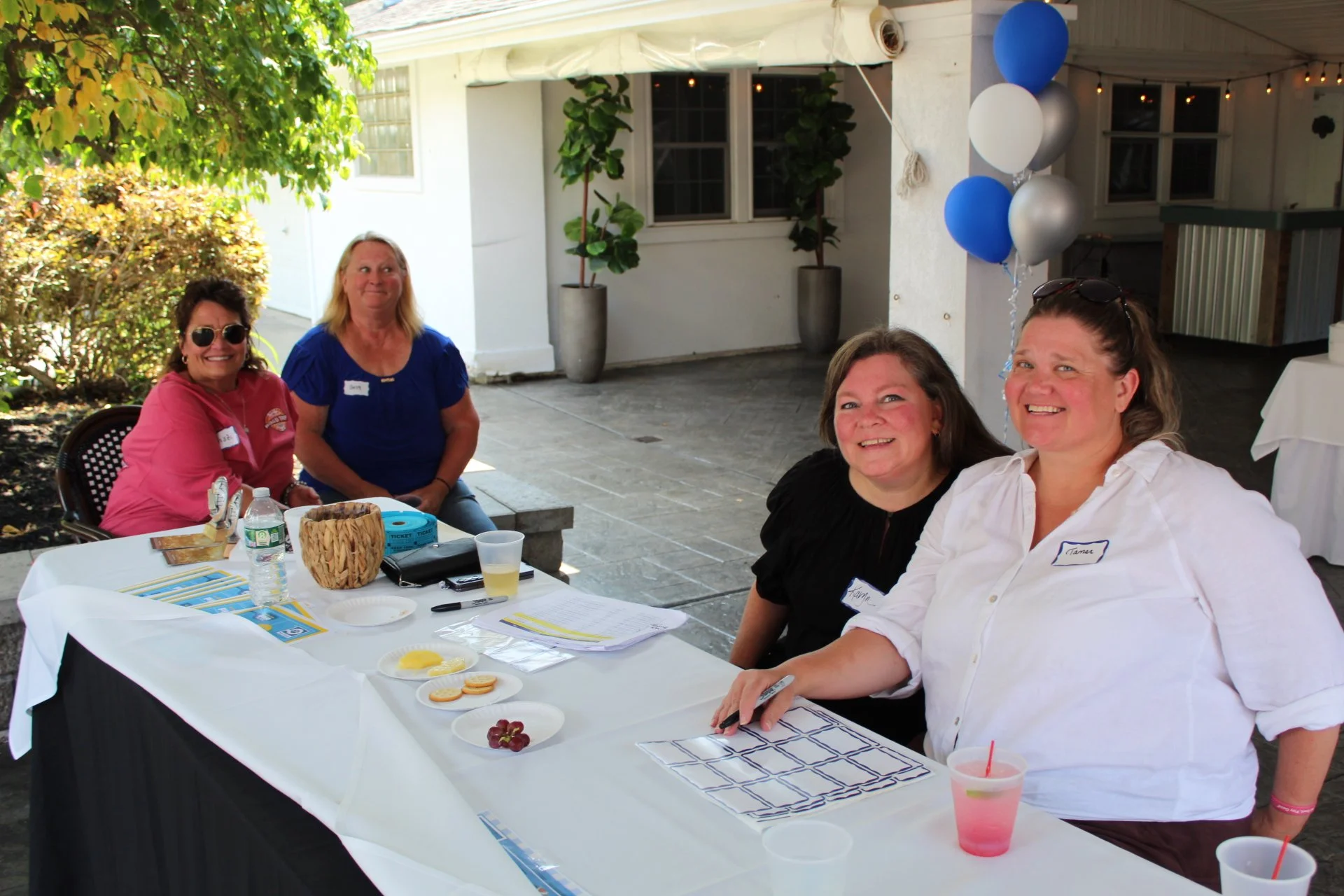 Four women sitting at a table outdoors, smiling, with balloons attached to one woman's chair, snacks and drinks on the table.