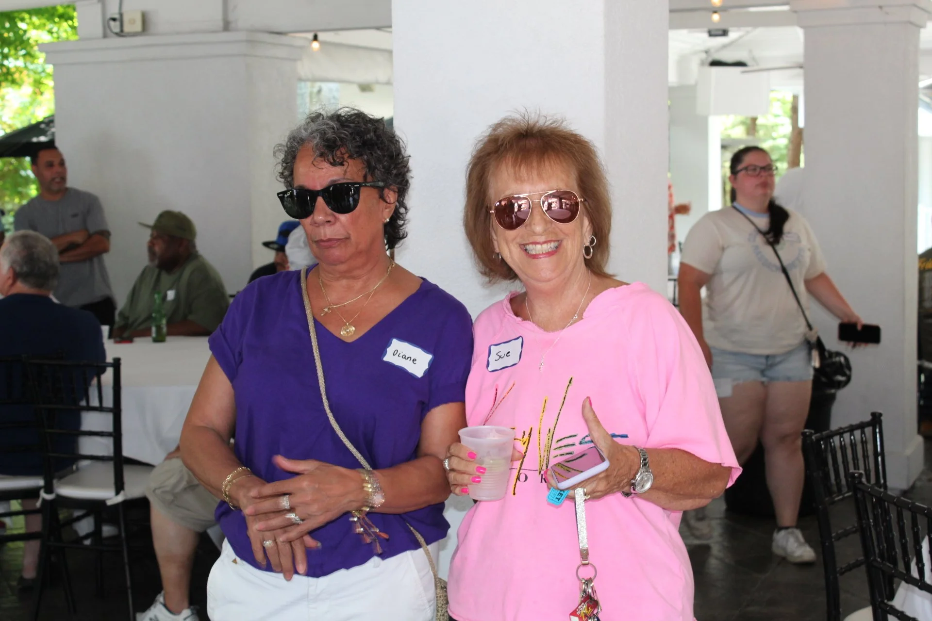 Two women with sunglasses and name tags at a social gathering, one in purple and the other in pink, holding drinks and smiling. Background includes other attendees and a white wall.