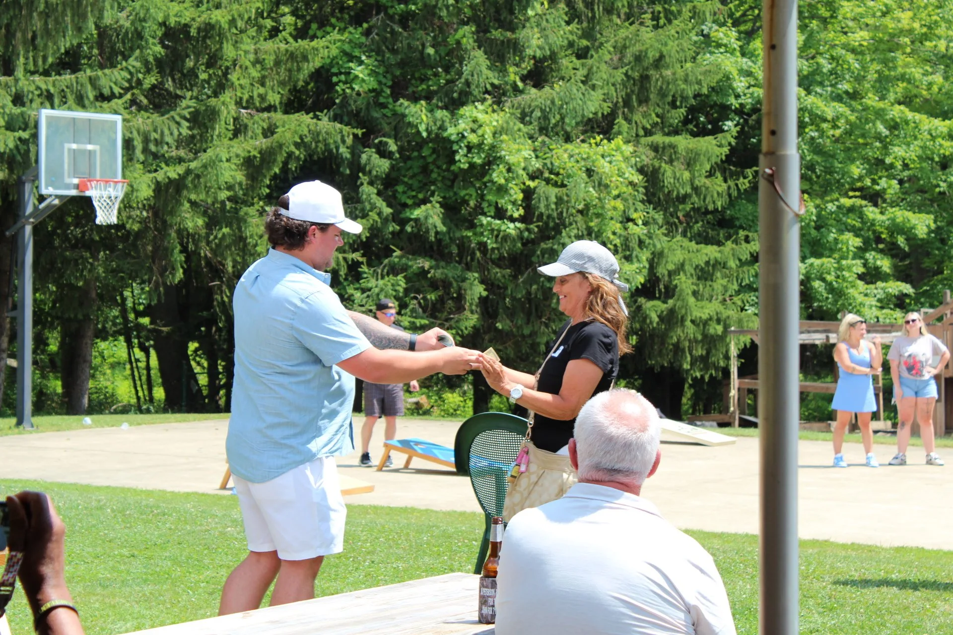 A man in a light blue shirt and white shorts receives a prize from a woman in a black shirt and gray cap at an outdoor event on a sunny day, with a basketball hoop and people in the background.