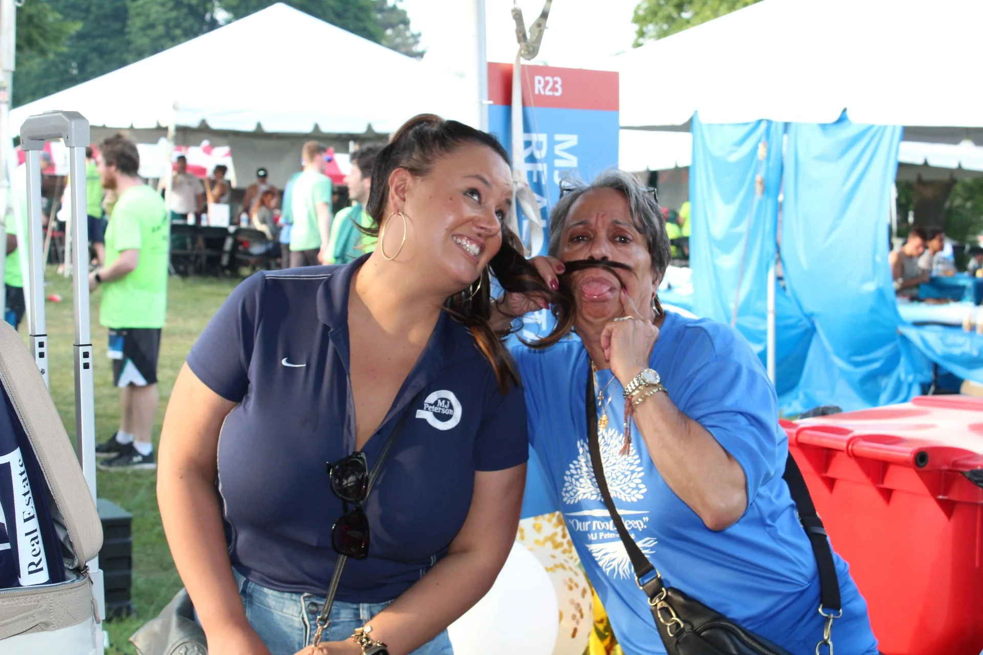 Two women at a table, one standing and one sitting, smiling at the camera during an outdoor event, with other people seated at tables in the background.