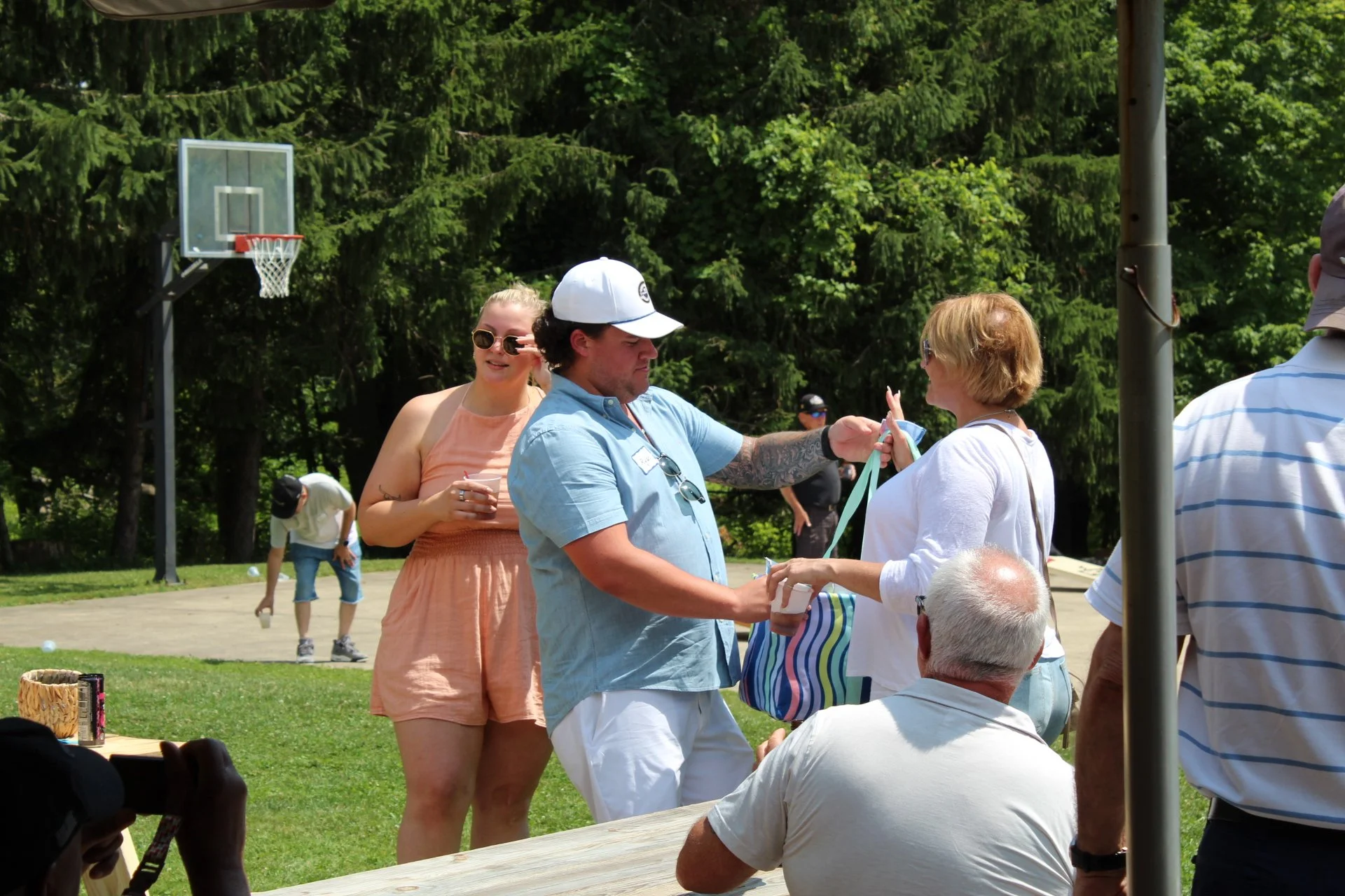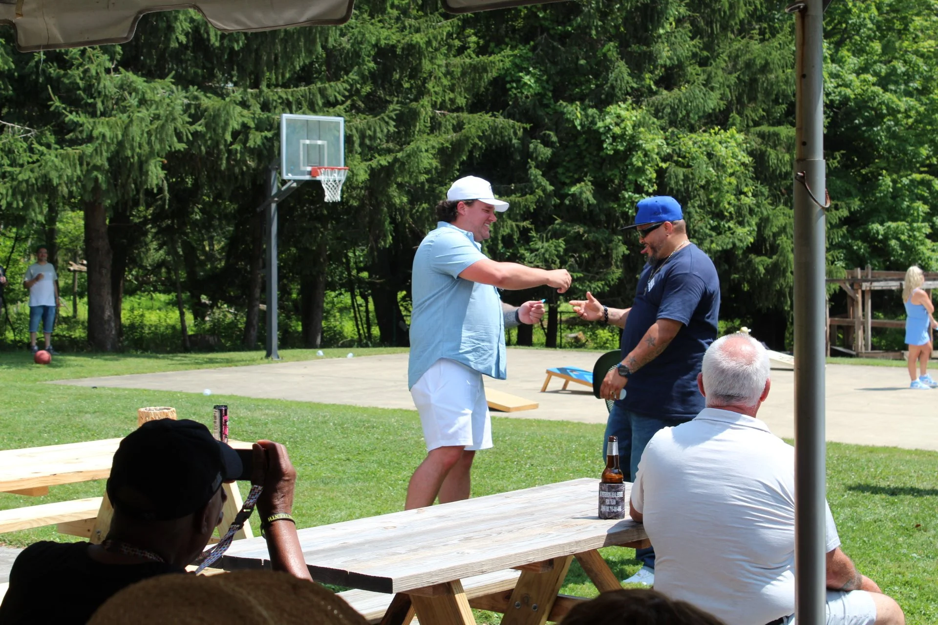 Two men exchanging items at an outdoor gathering with other people, trees, and a basketball hoop in the background.