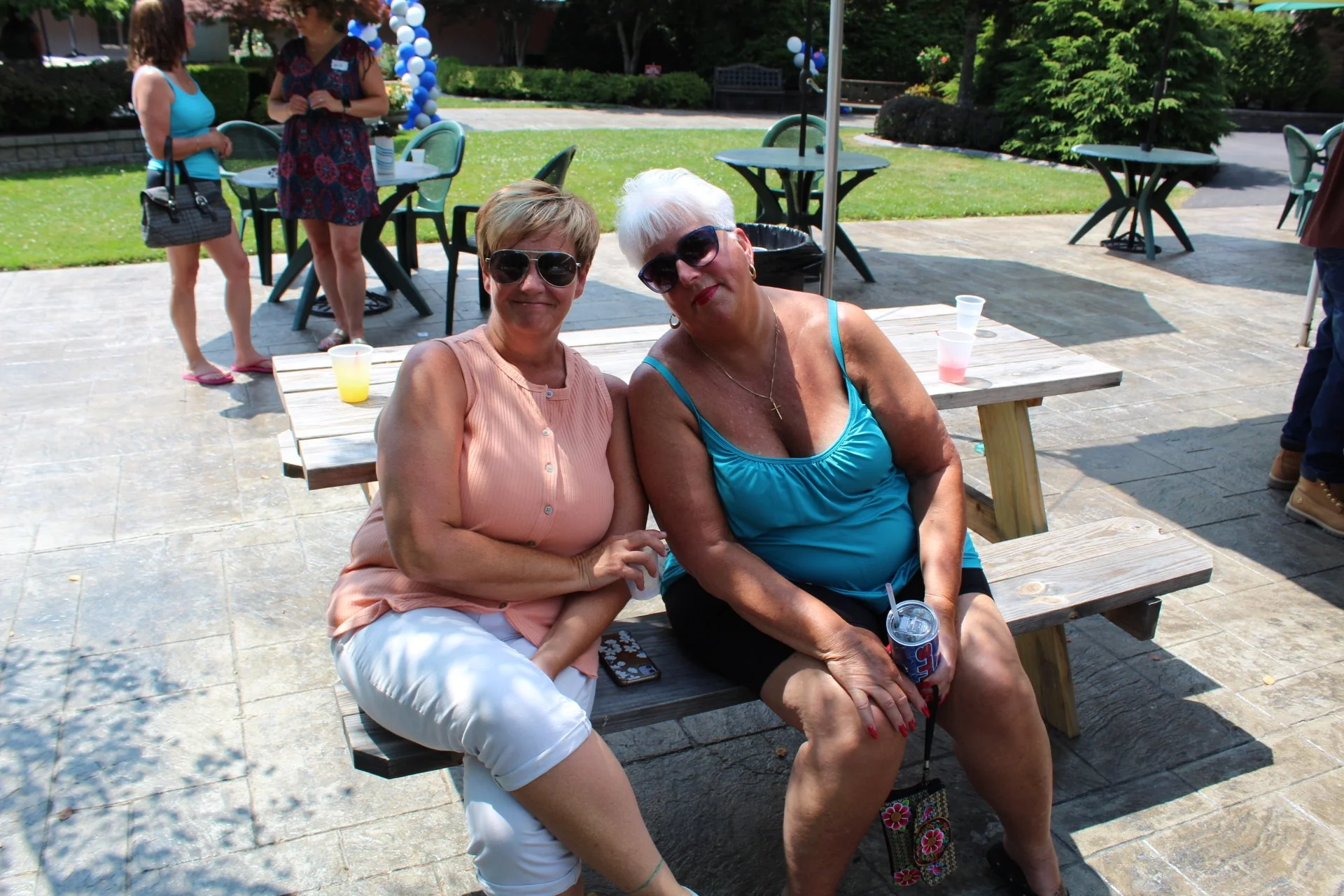 Two older women with short hair and sunglasses sitting at a picnic table outdoors on a sunny day, with others in the background. One woman is wearing a peach-colored top and white shorts, and the other is wearing a turquoise top and black shorts, hol