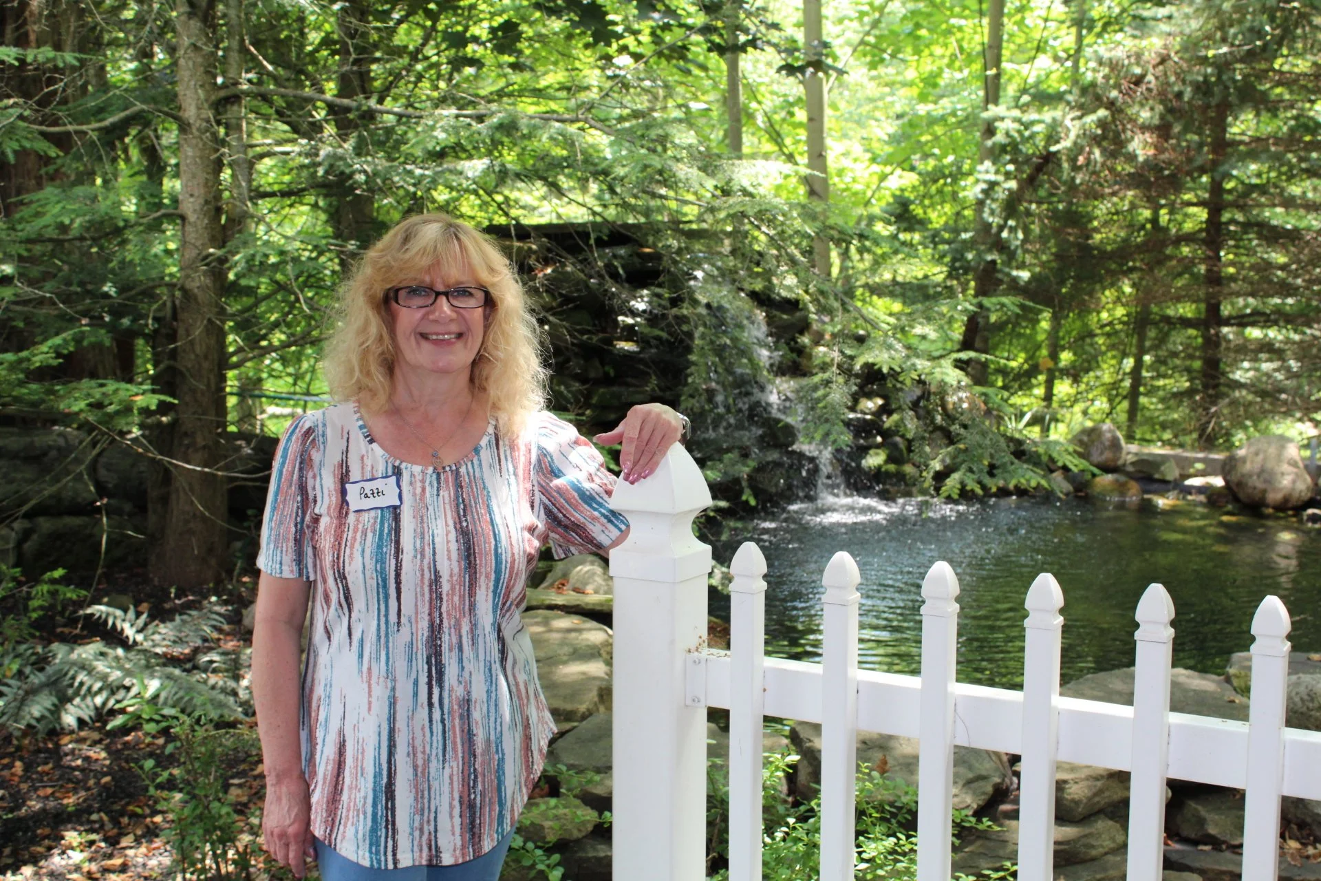A woman with blonde hair and glasses smiling in a garden next to a white picket fence, with a pond and waterfall in the background.